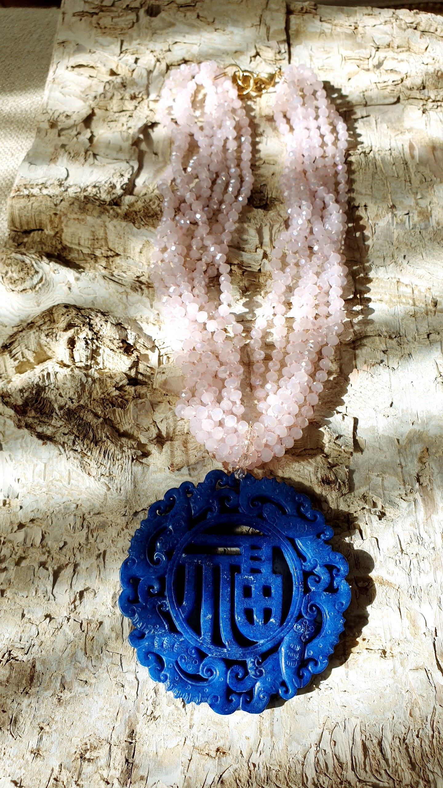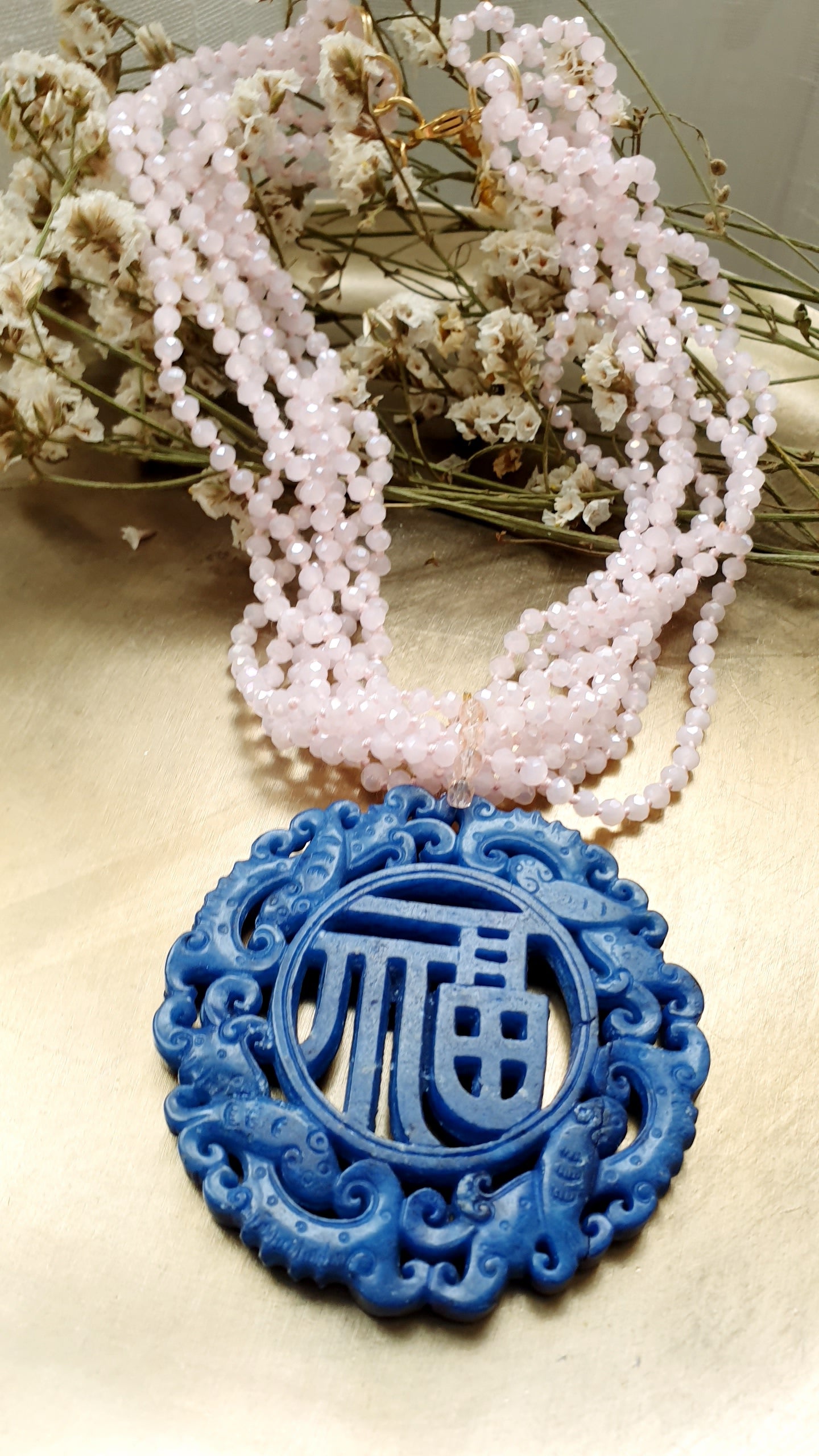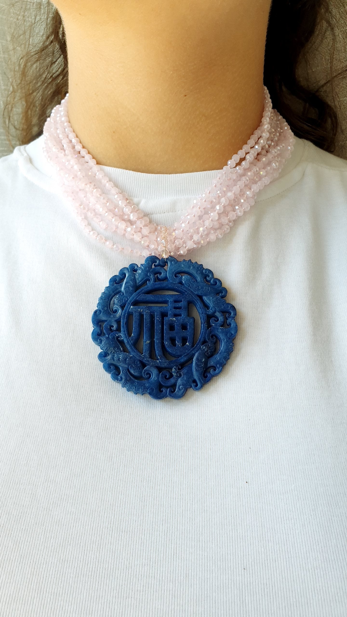 Collana artigianale realizzata con girocollo in cristallini rosa e chiusura in acciaio, grande giada intagliata blu cm. 7.