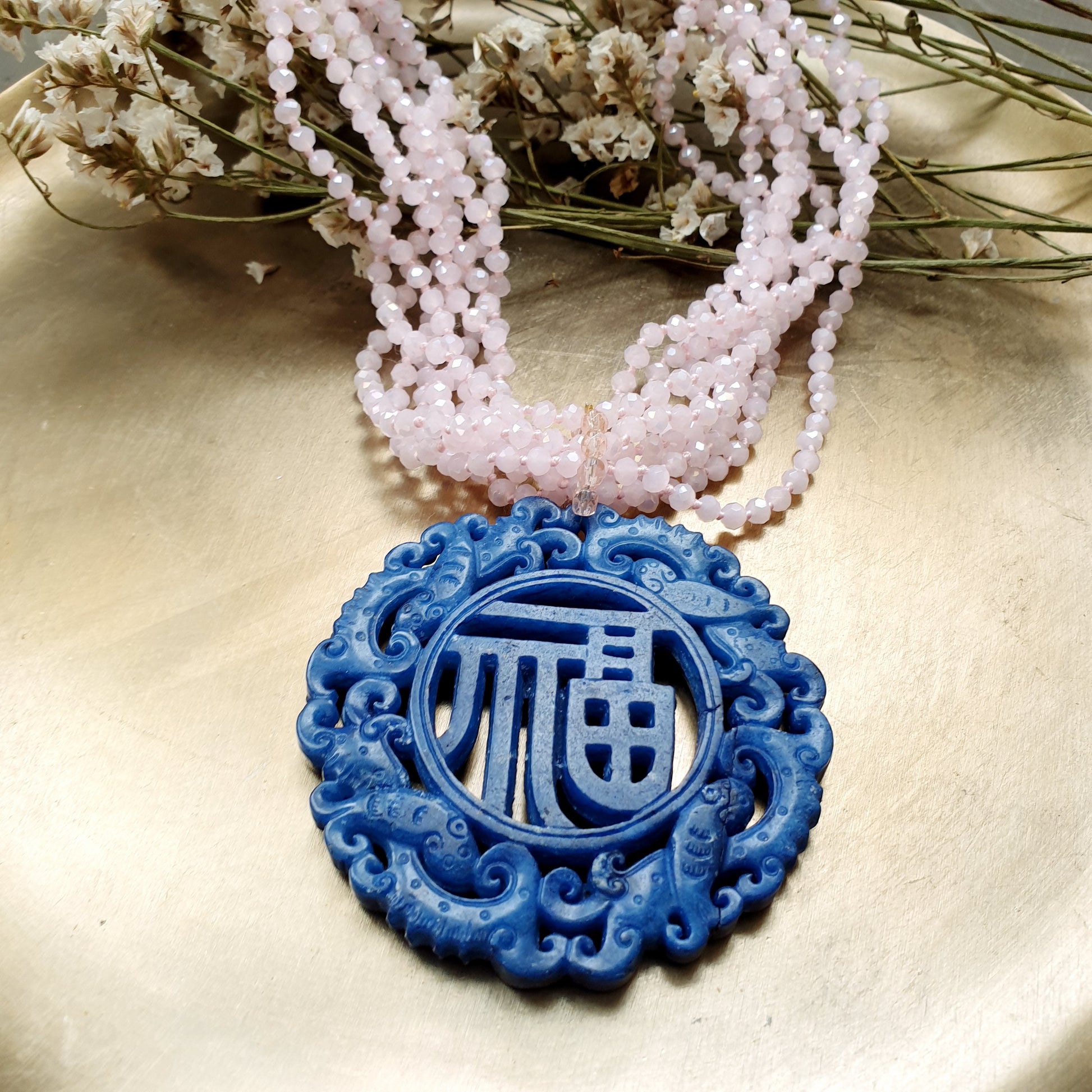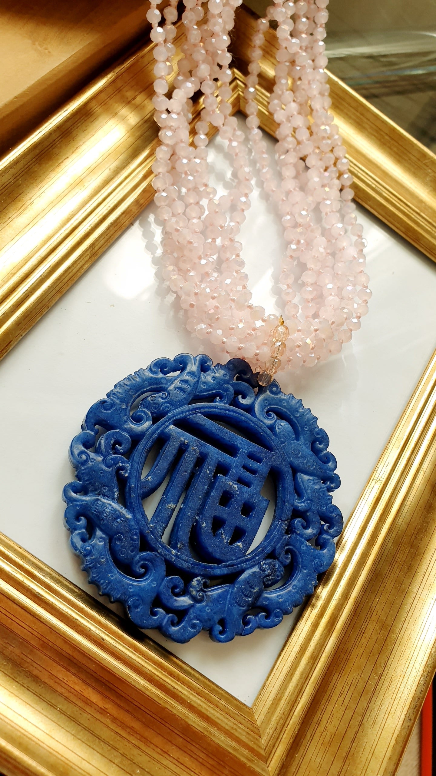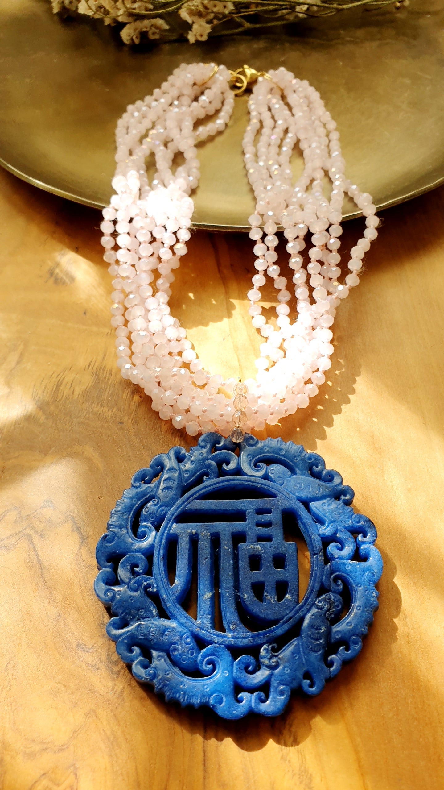 Collana artigianale realizzata con girocollo in cristallini rosa e chiusura in acciaio, grande giada intagliata blu cm. 7.