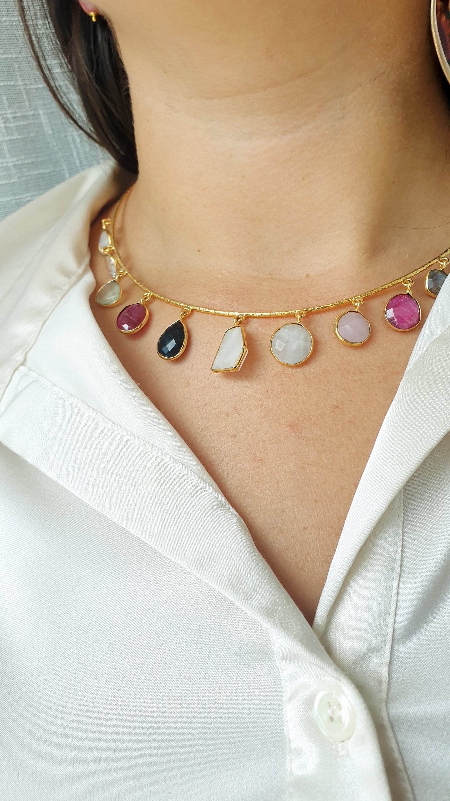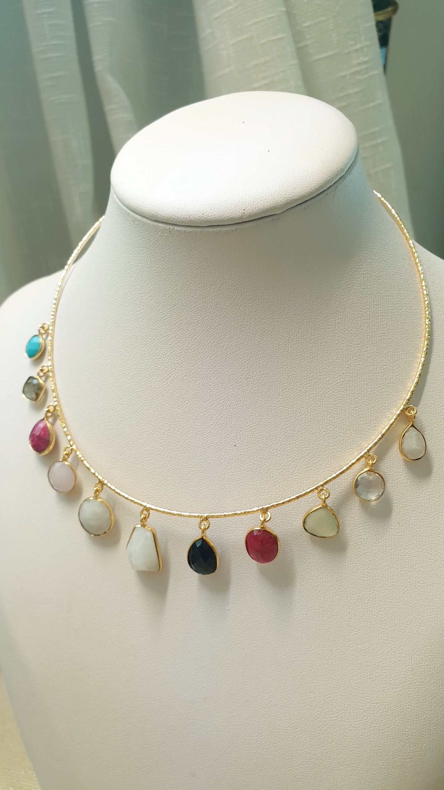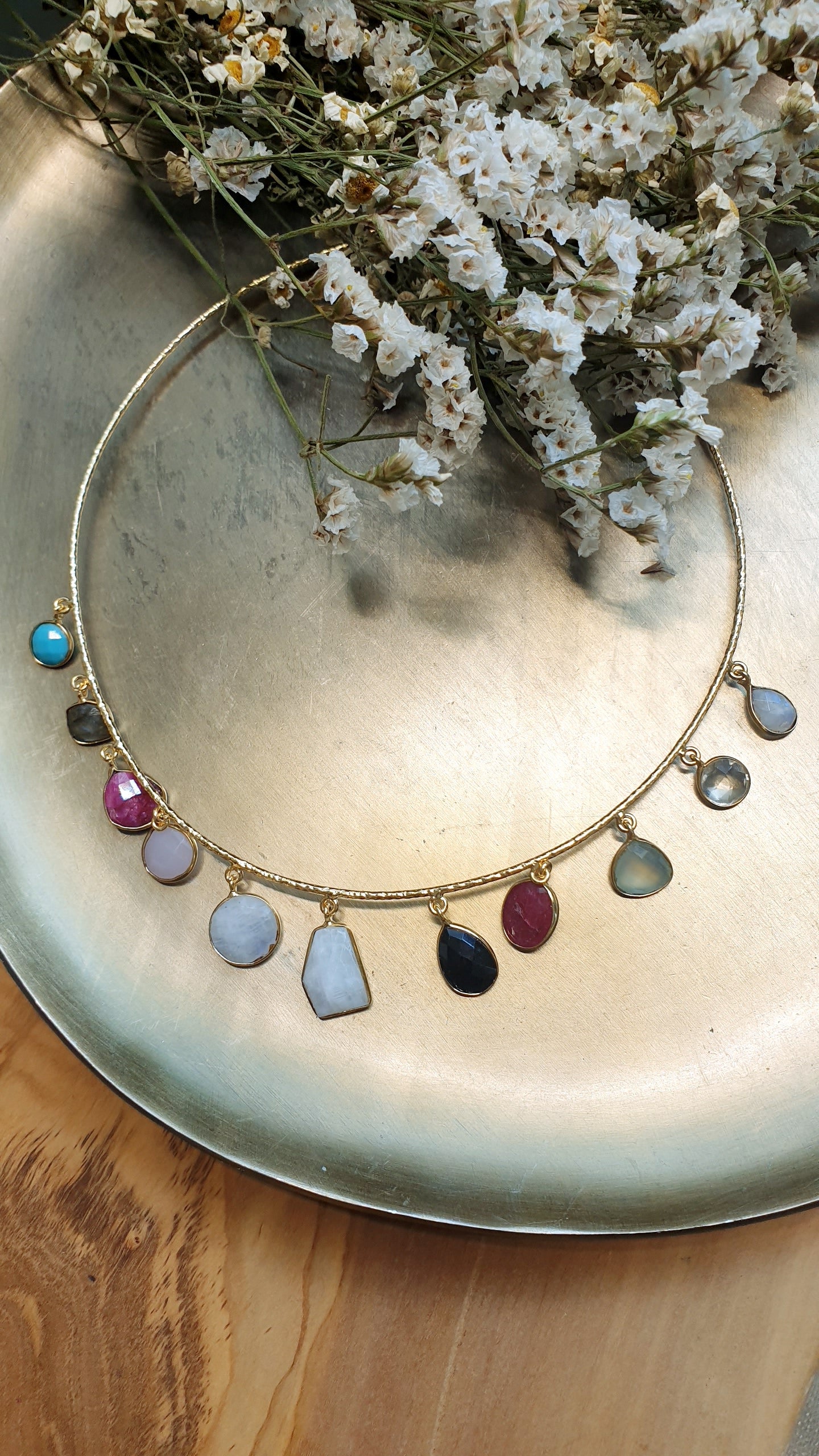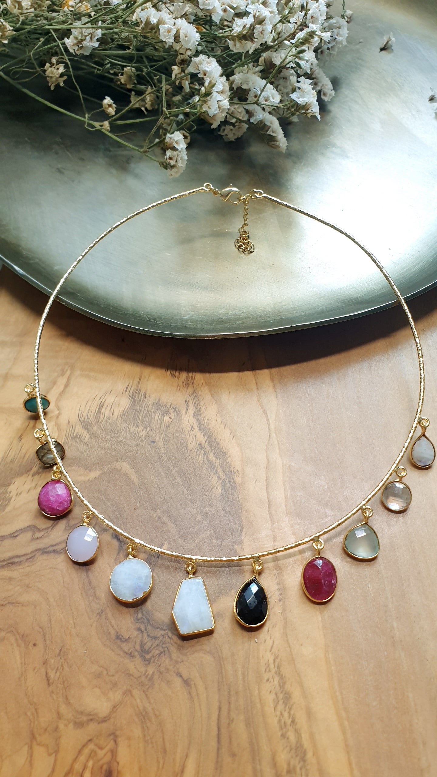 Girocollo in ottone on pietre dure, pietra di luna, qurazo rosa, quarzo bianco, onice, radice di rubino, da cm. 1 a 1.5