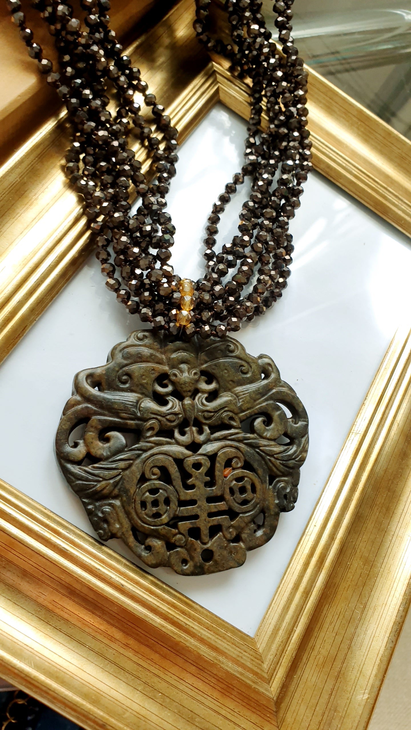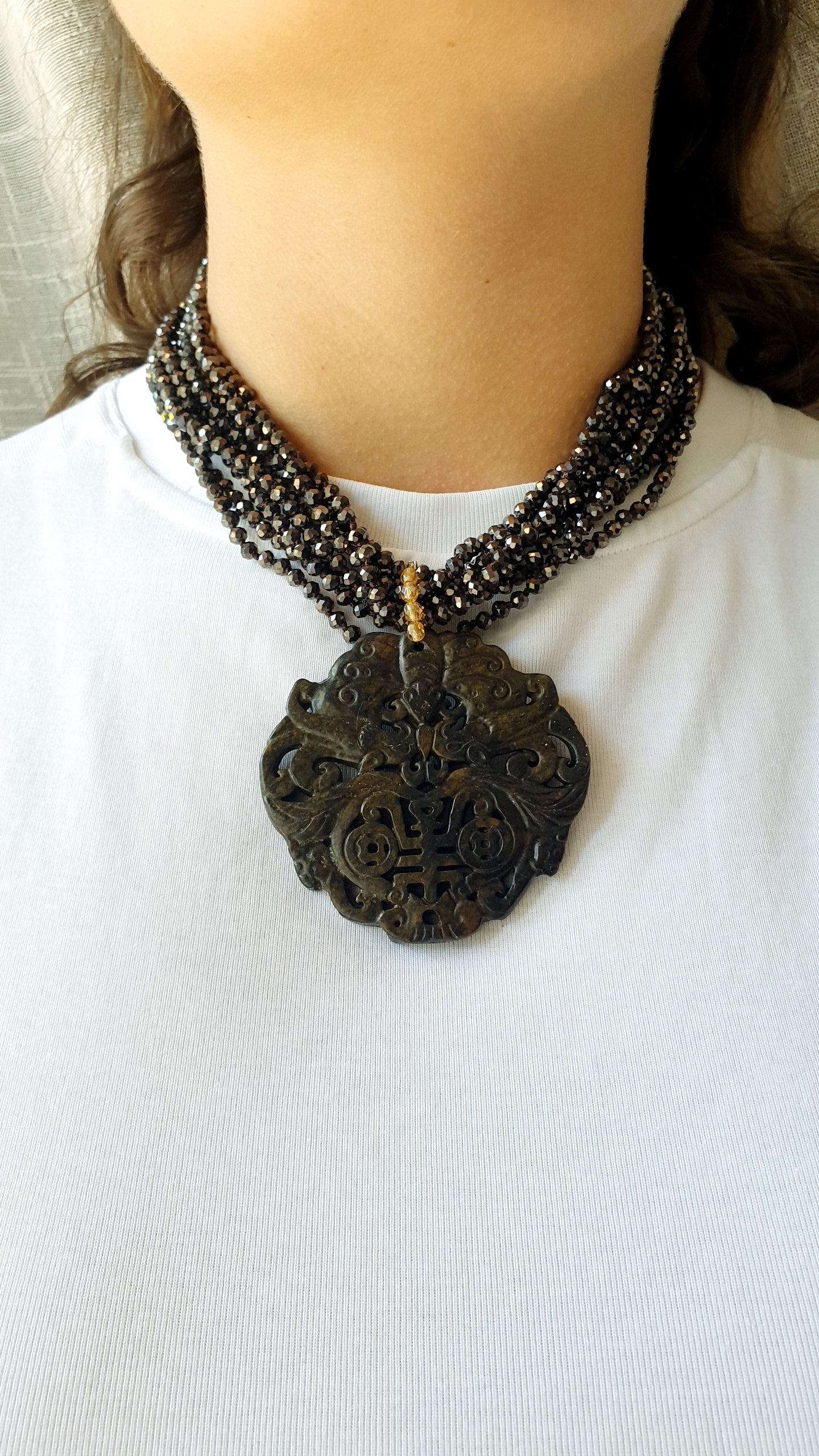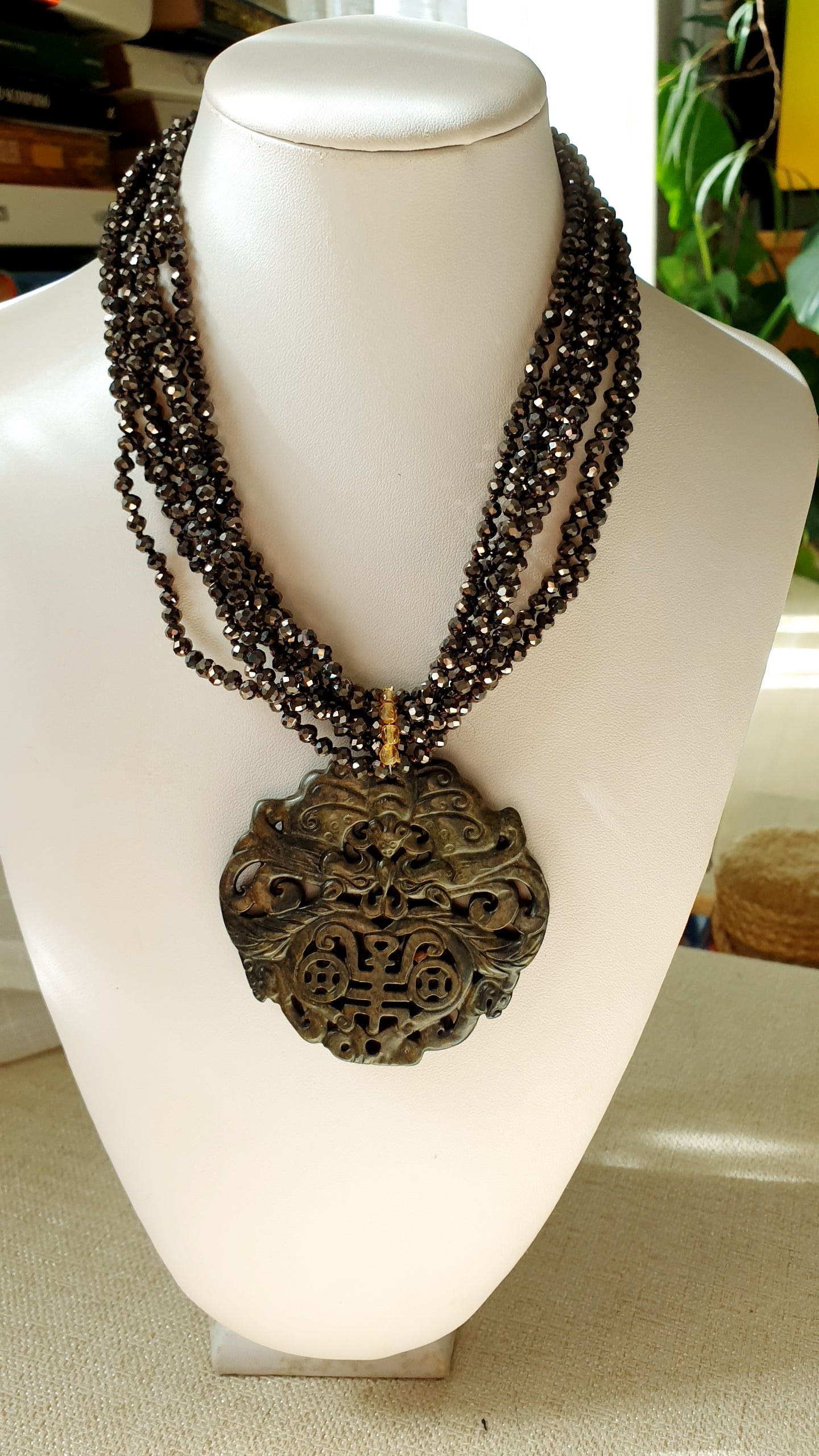 Collana artigianale realizzata con girocollo in cristallini multifilo marroni, grande giada intagliata cm. 6.5 marrone.