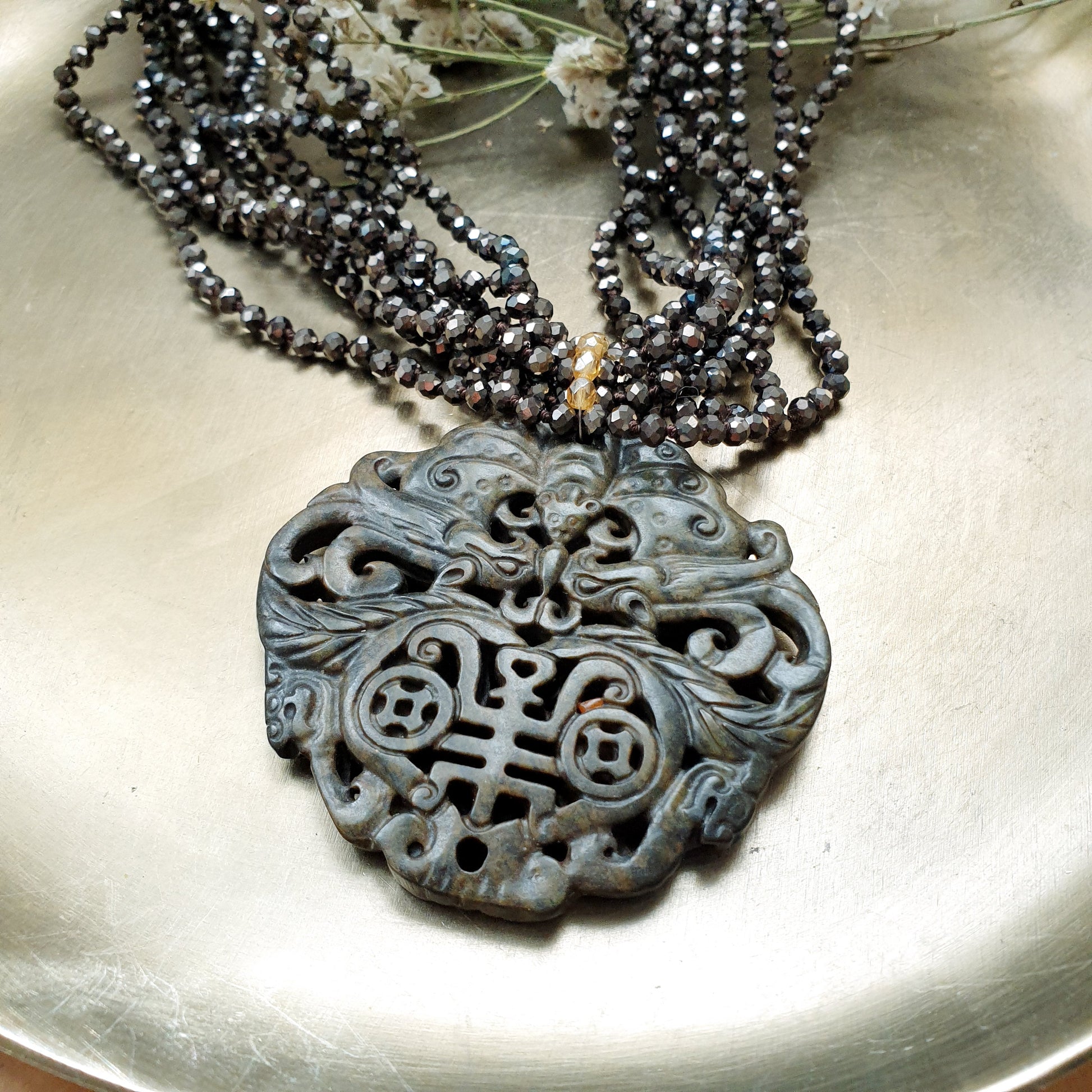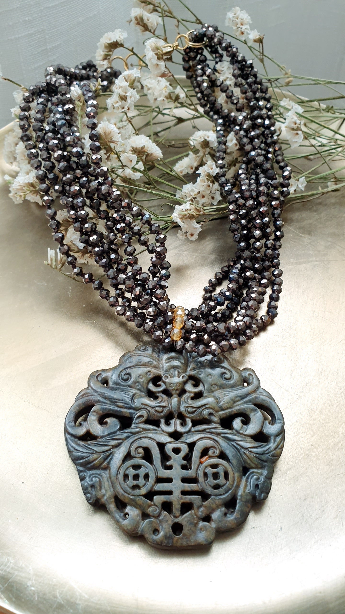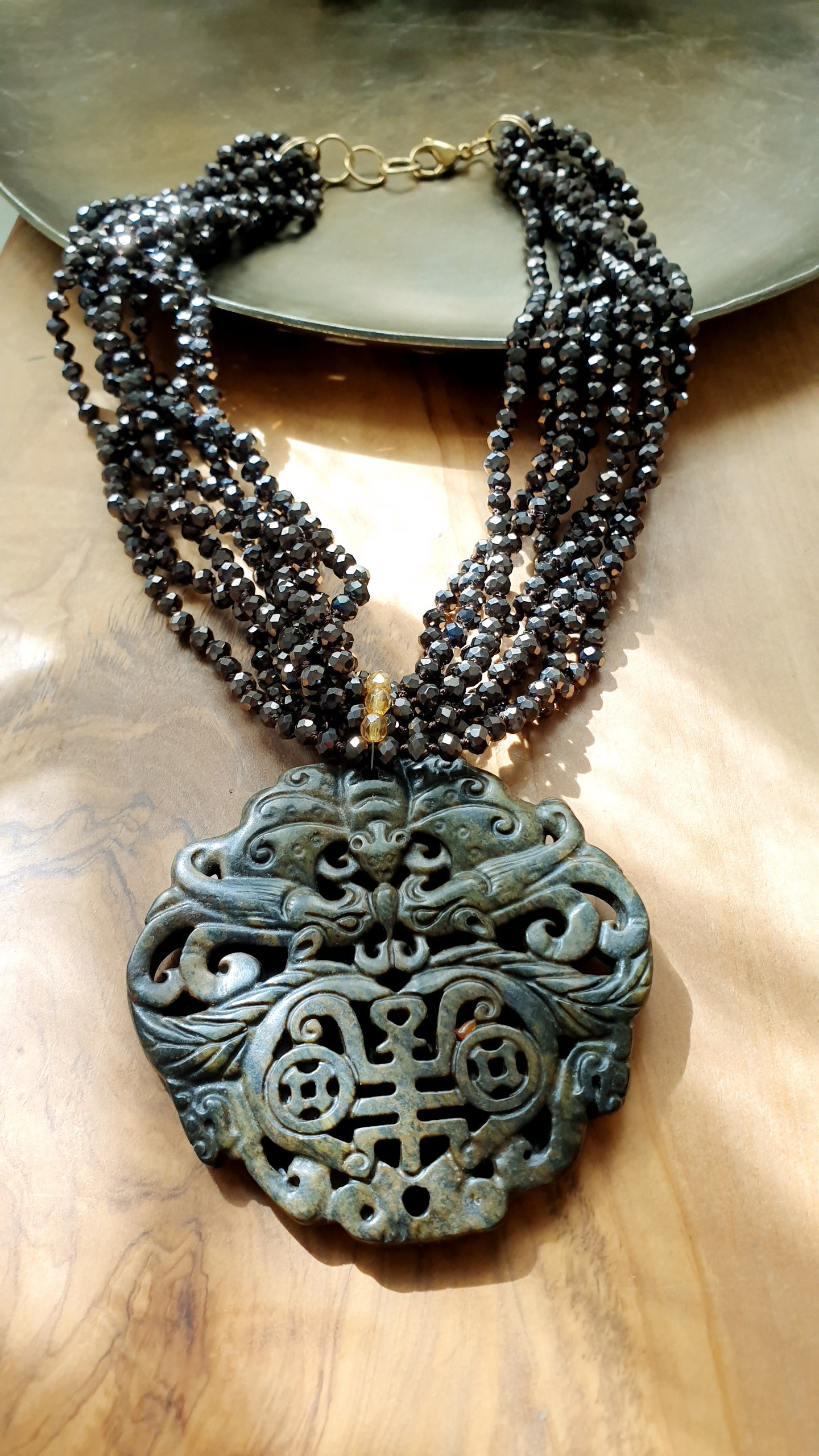 Collana artigianale realizzata con girocollo in cristallini multifilo marroni, grande giada intagliata cm. 6.5 marrone.