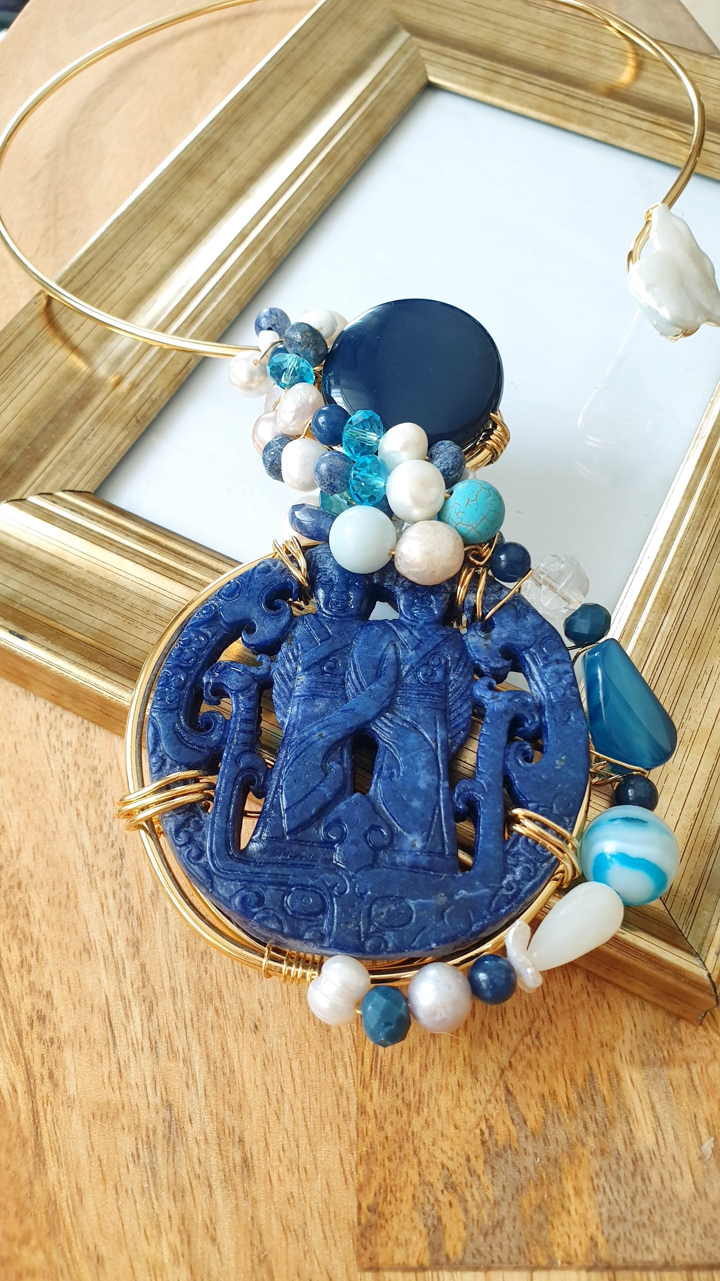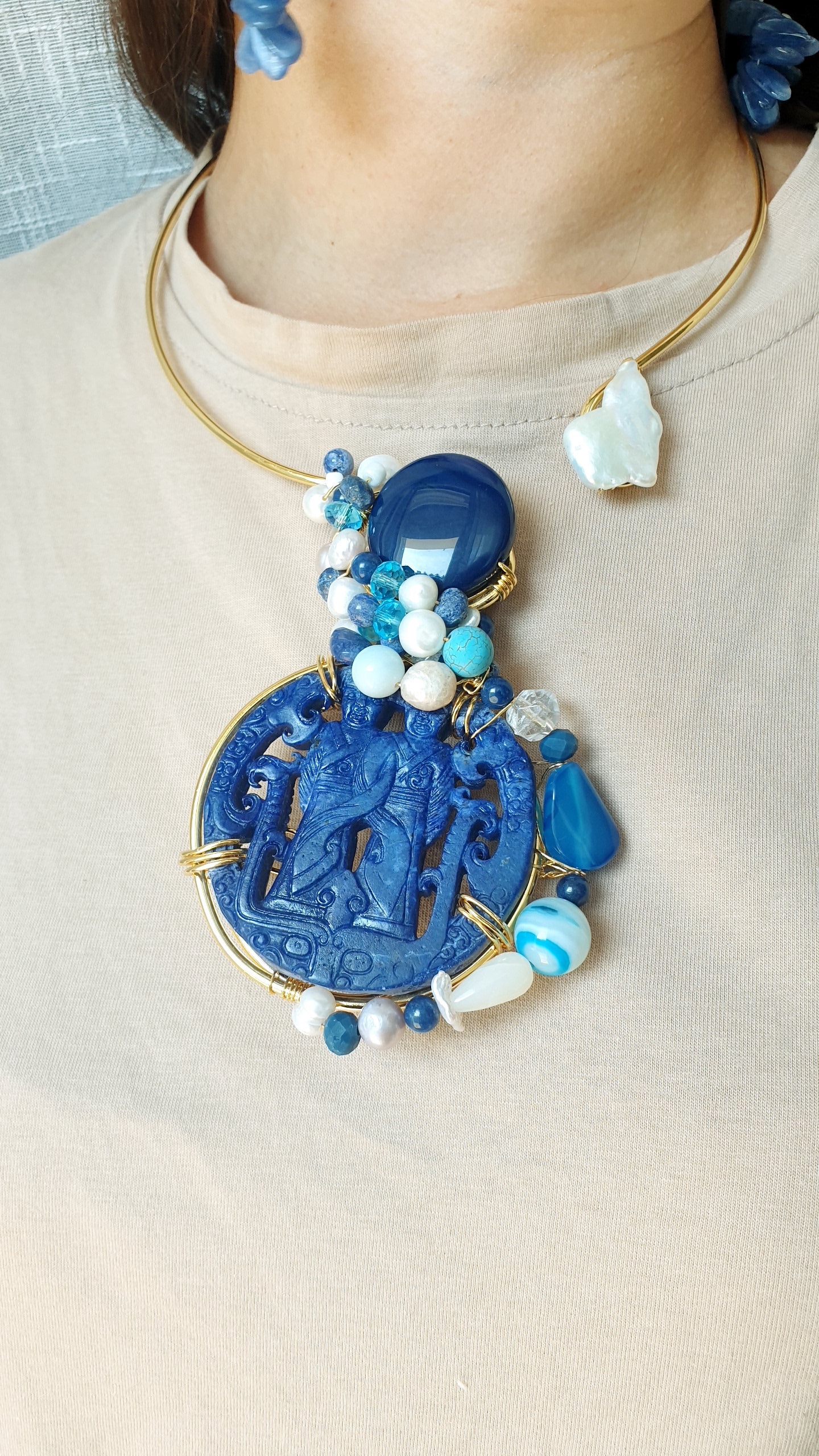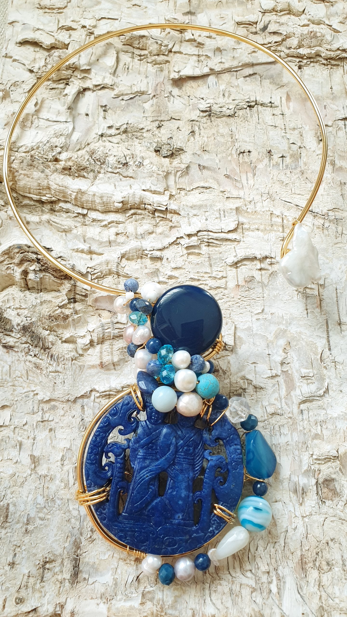 Grande giada blu intagliata cm. 6.5, perla barocca piatta, disco in agata blu cm. 3, perle di fiume, acquamarina, lapis, agate, cristalli.