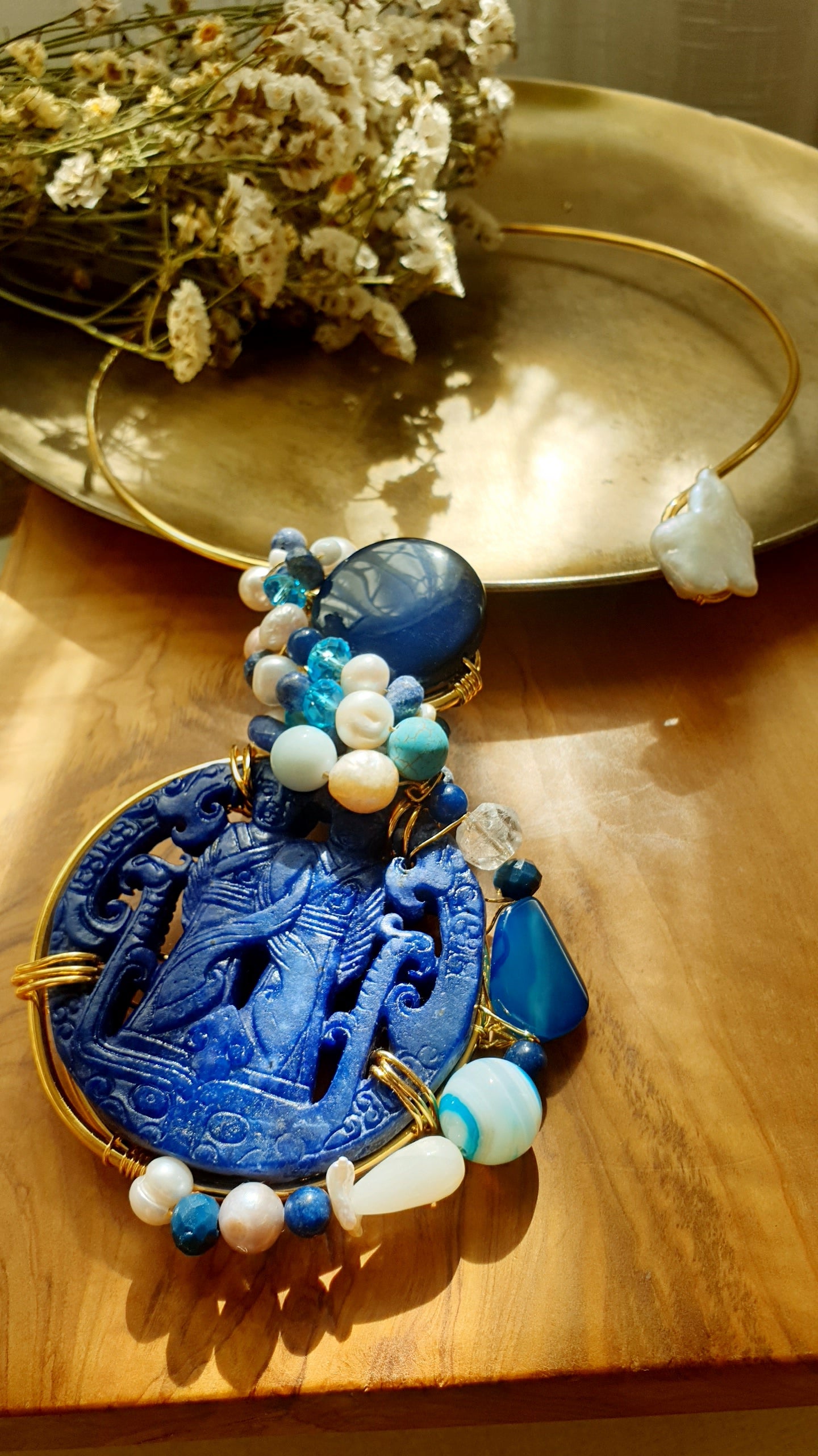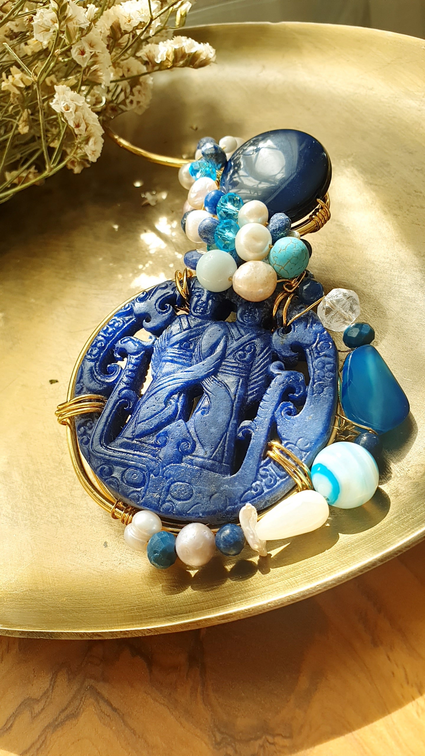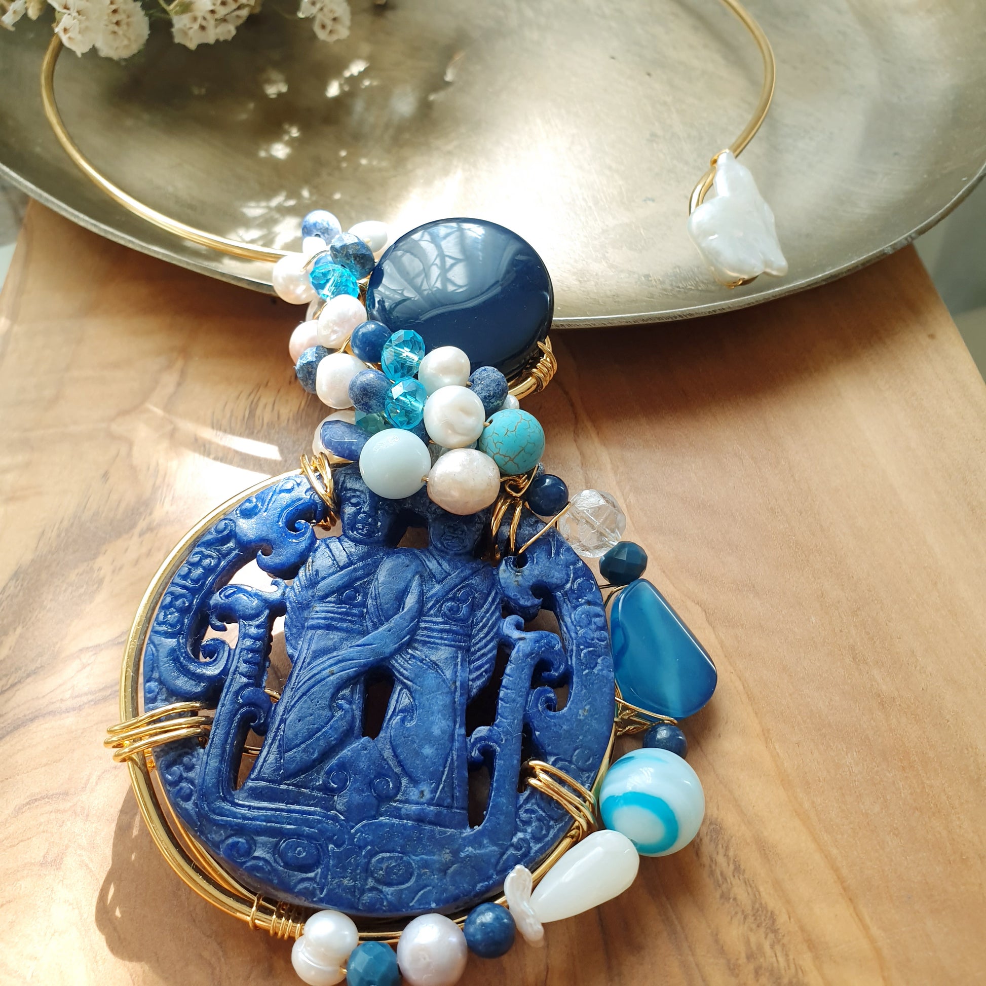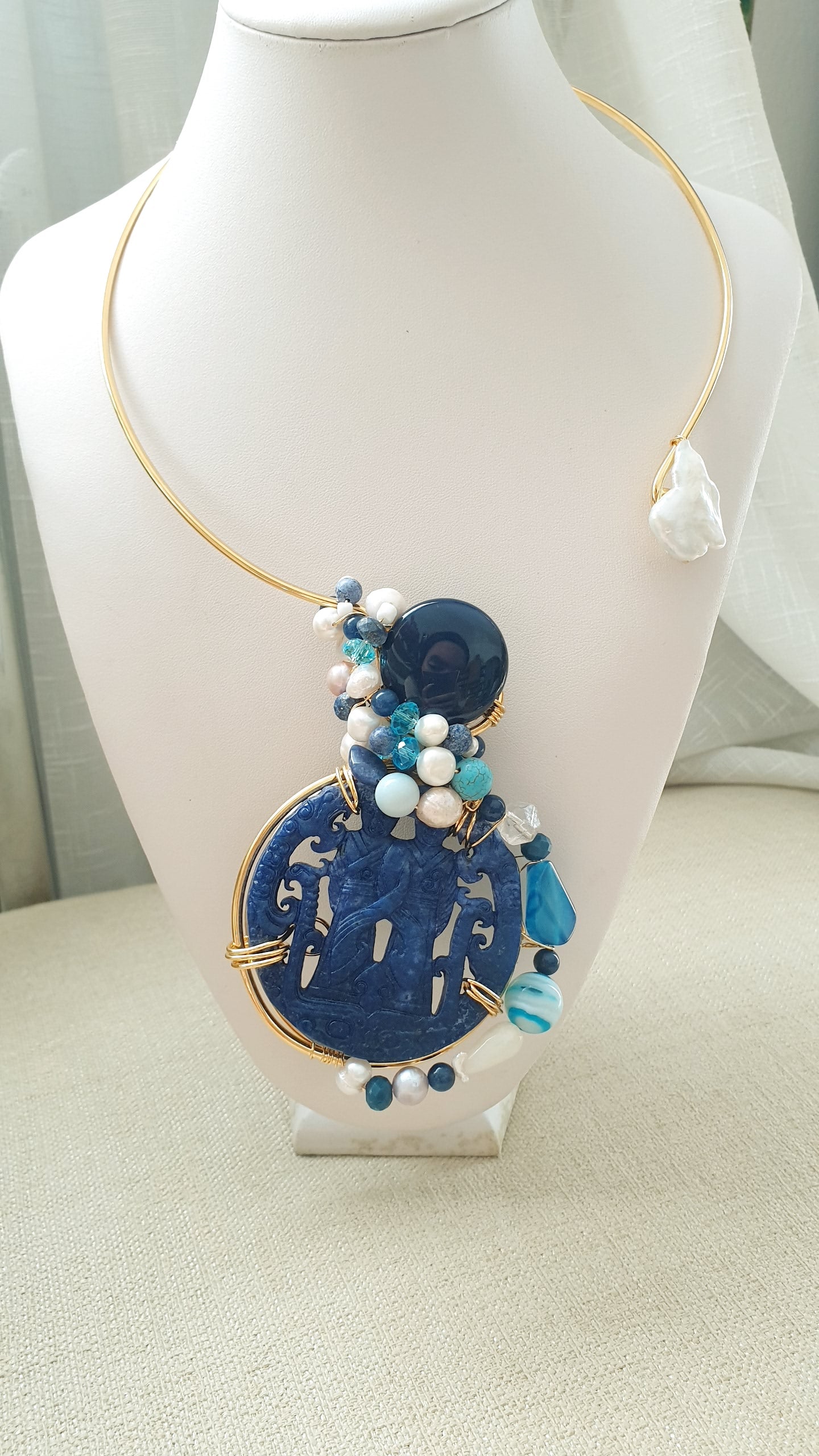 Grande giada blu intagliata cm. 6.5, perla barocca piatta, disco in agata blu cm. 3, perle di fiume, acquamarina, lapis, agate, cristalli.