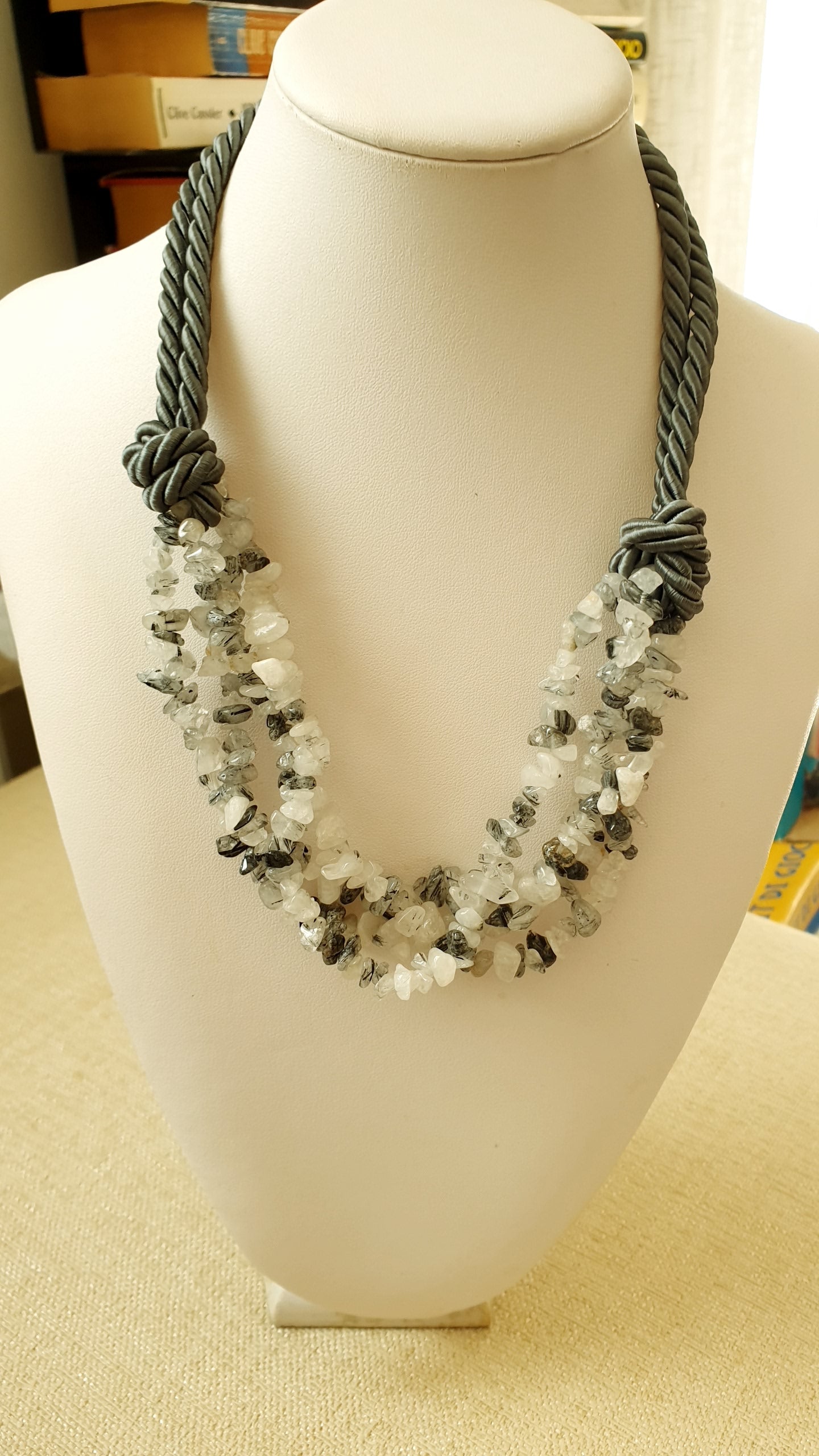Seidenhalsband mit Halbedelsteinen oder Perlen.