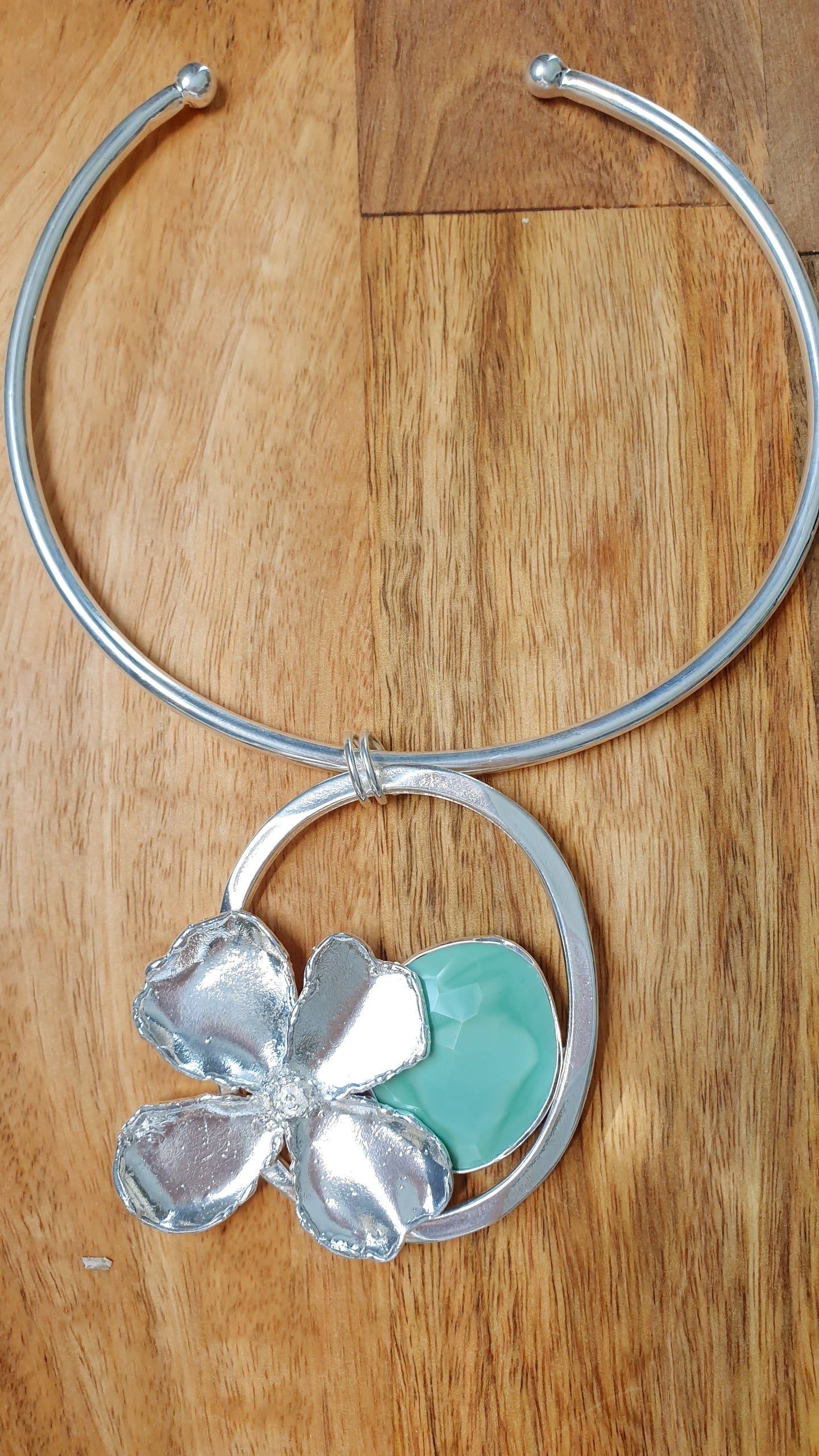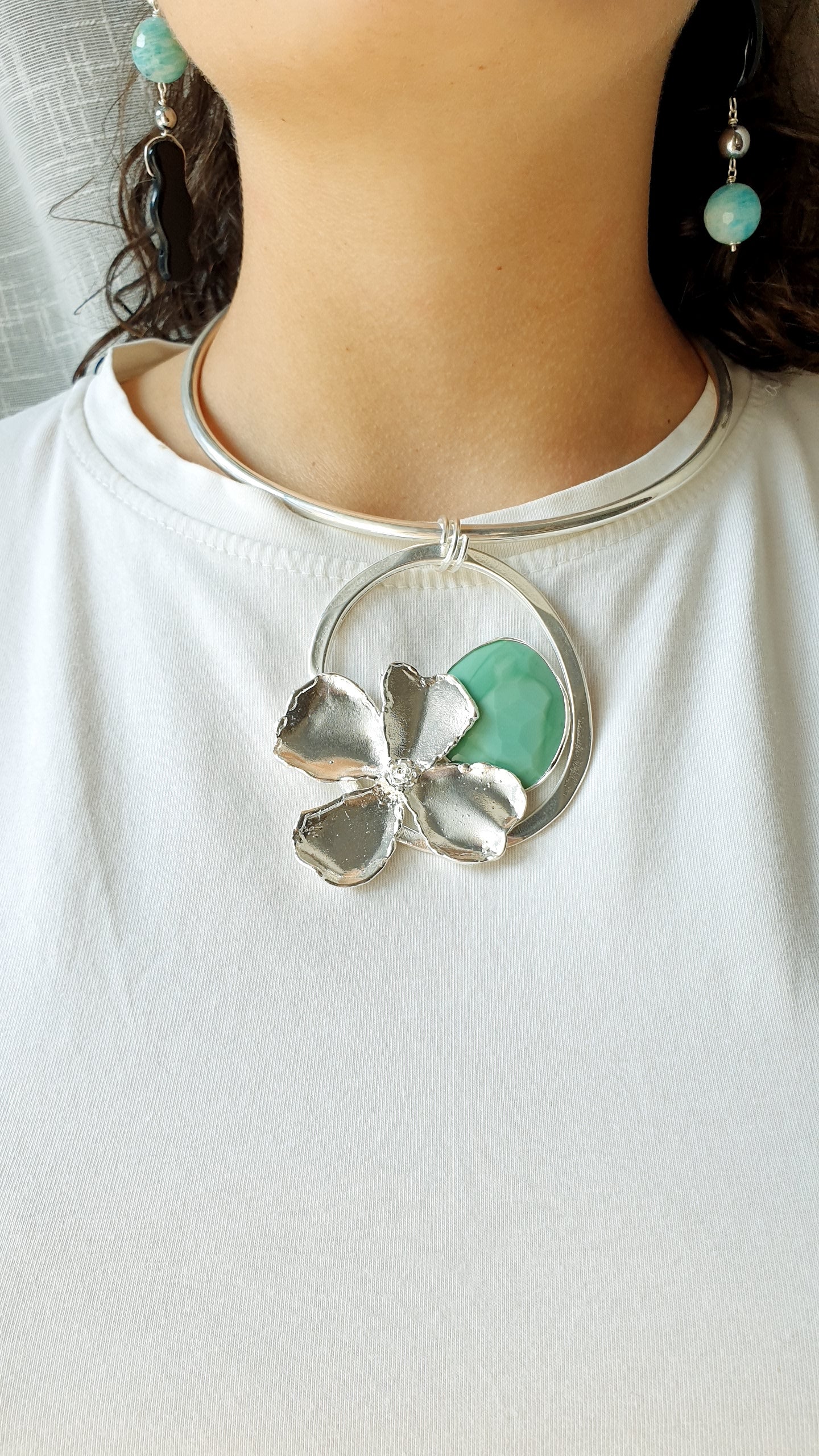 Collana artigianale realizzata con girocollo in filo placcato argento, ciondolo centrale in filo placcato argento e grande agata.