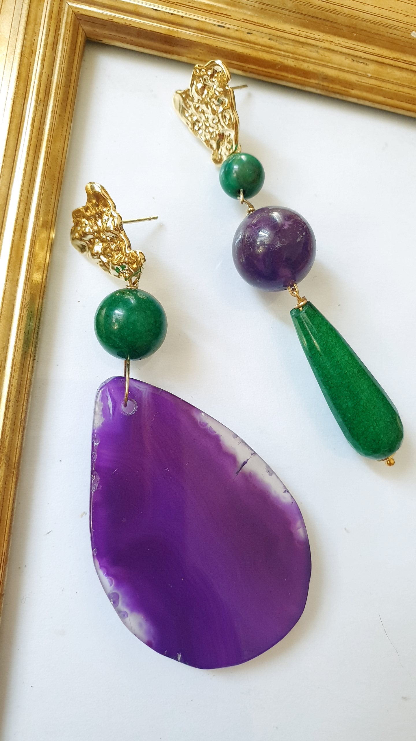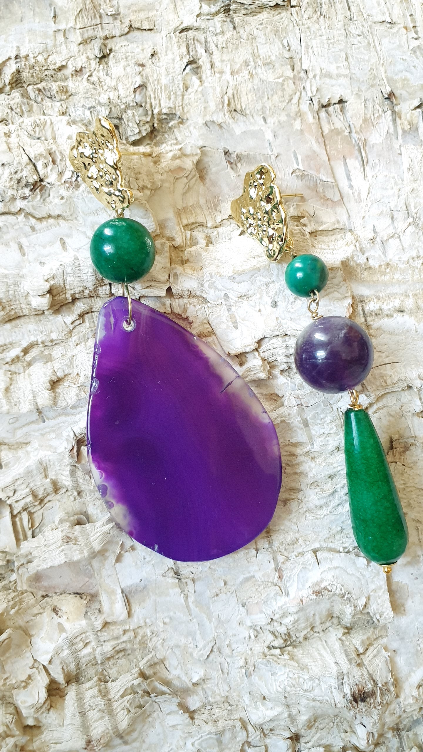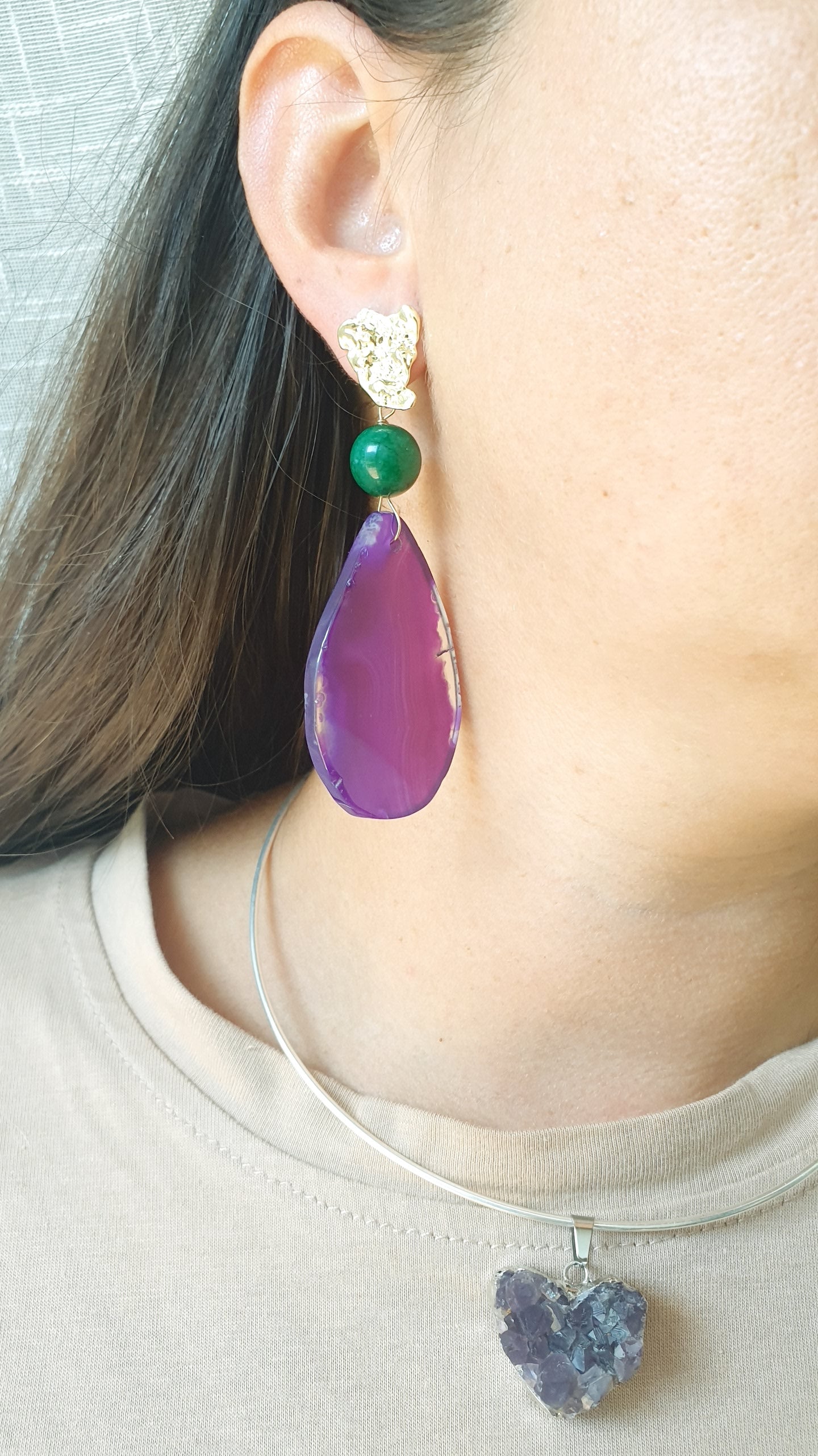 Grande fetta di agata viola cm. 5.5 x 3, sfere in giada verde, sfera in ametista, goccia in giada verde cm. 3.