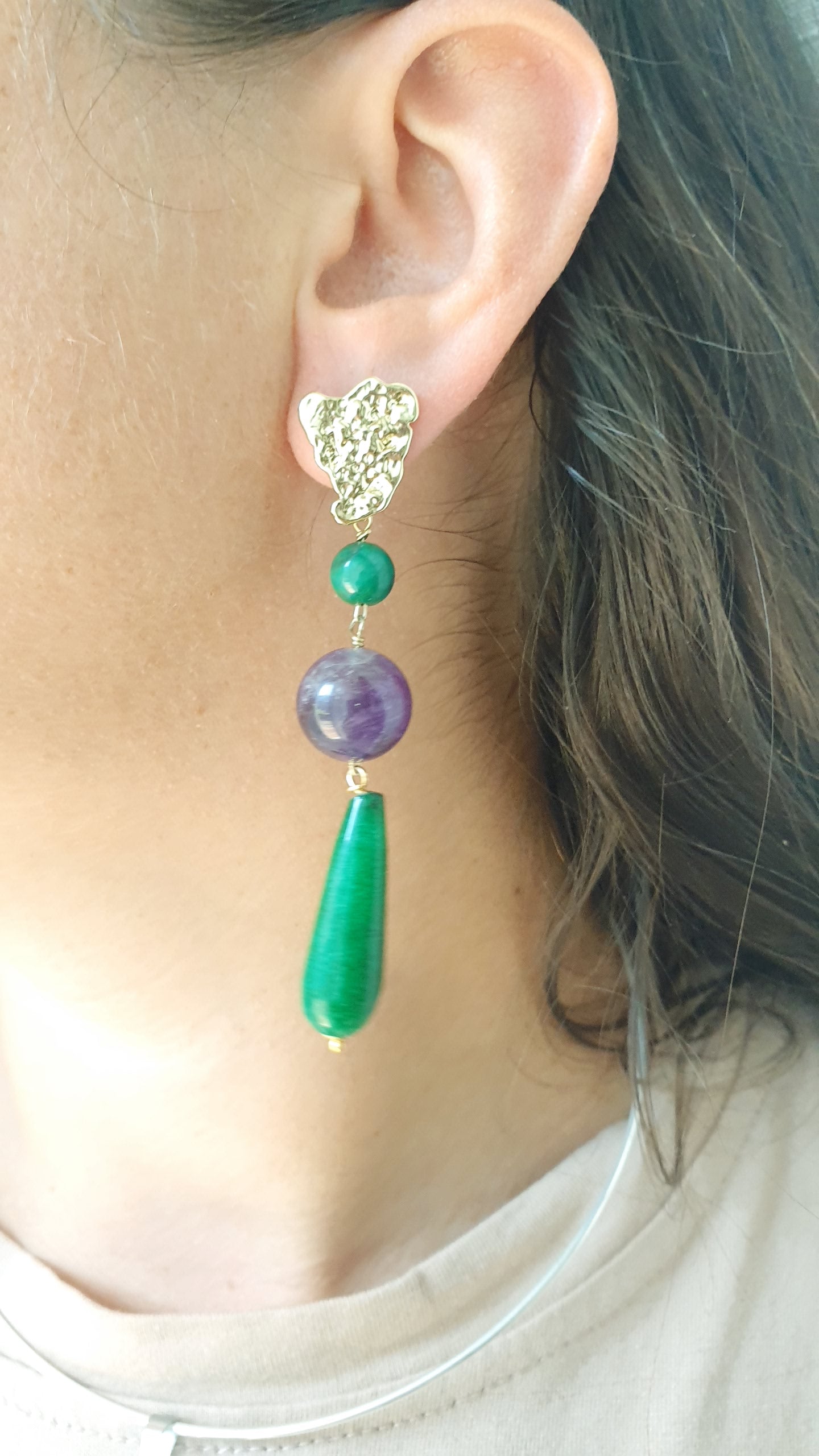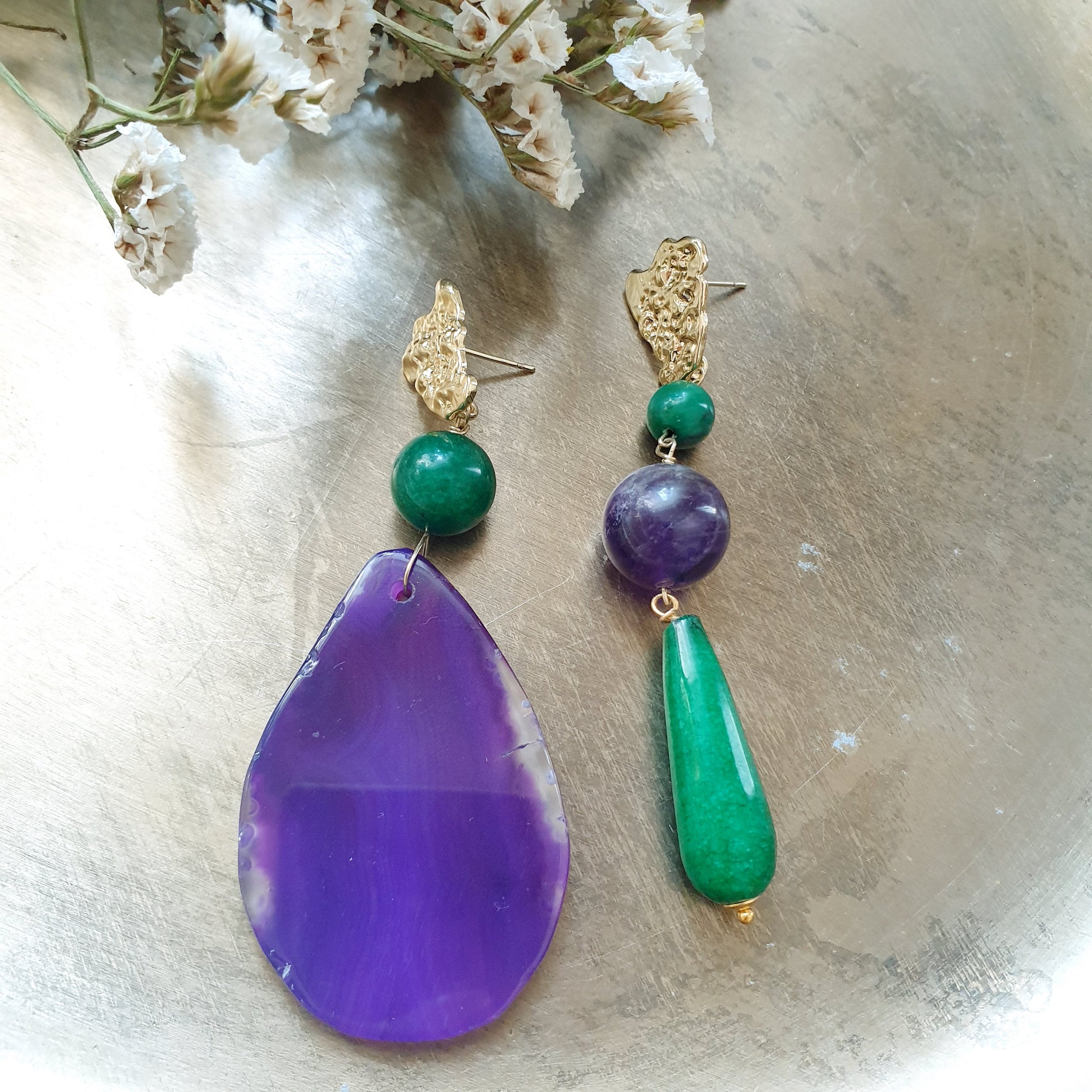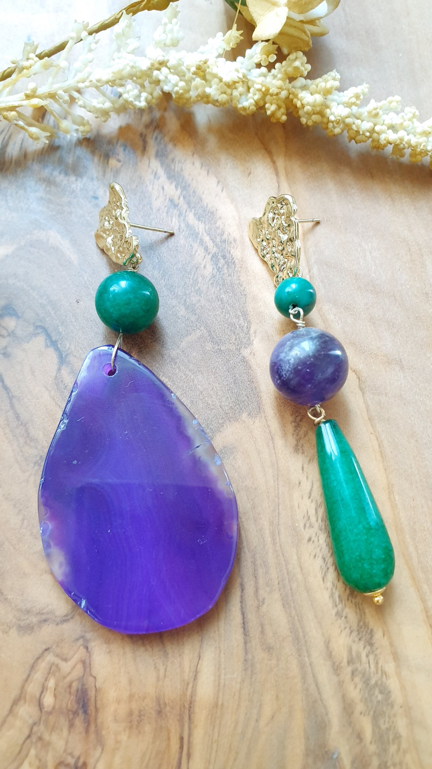 Grande fetta di agata viola cm. 5.5 x 3, sfere in giada verde, sfera in ametista, goccia in giada verde cm. 3.