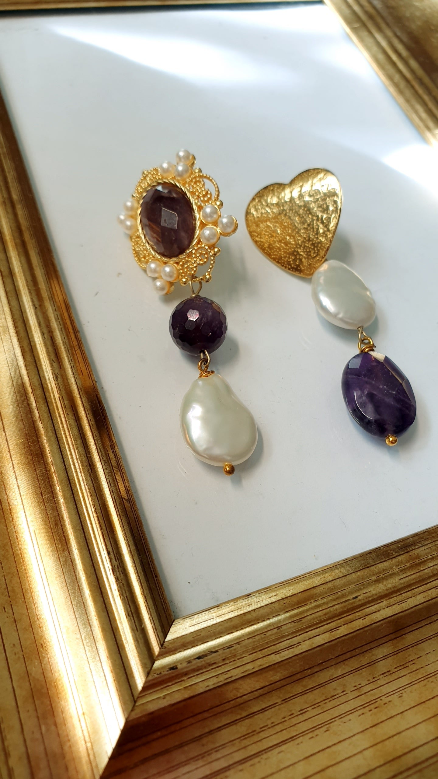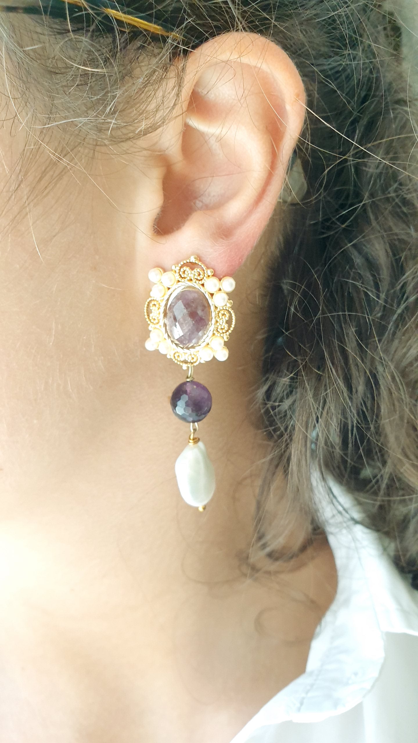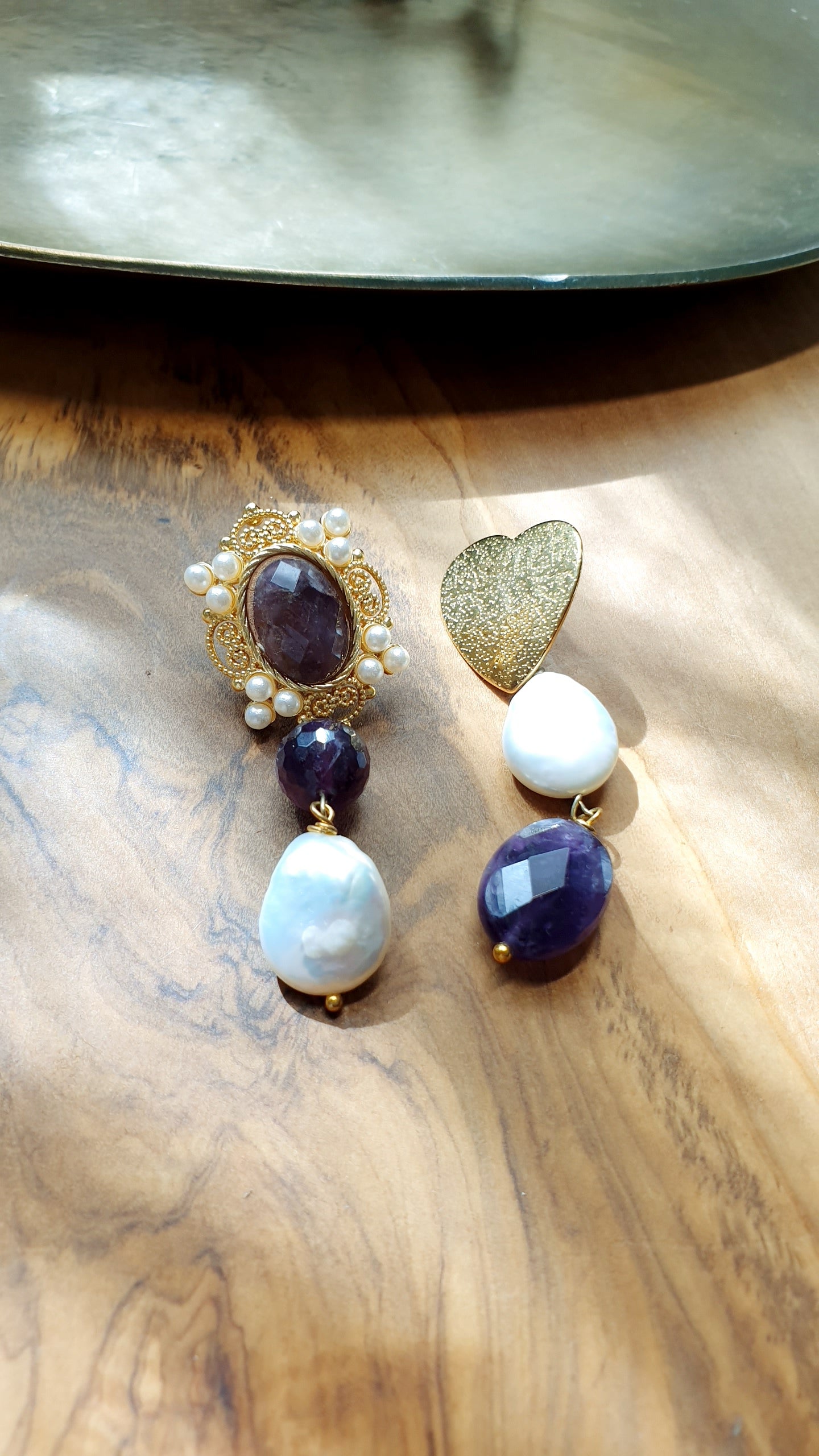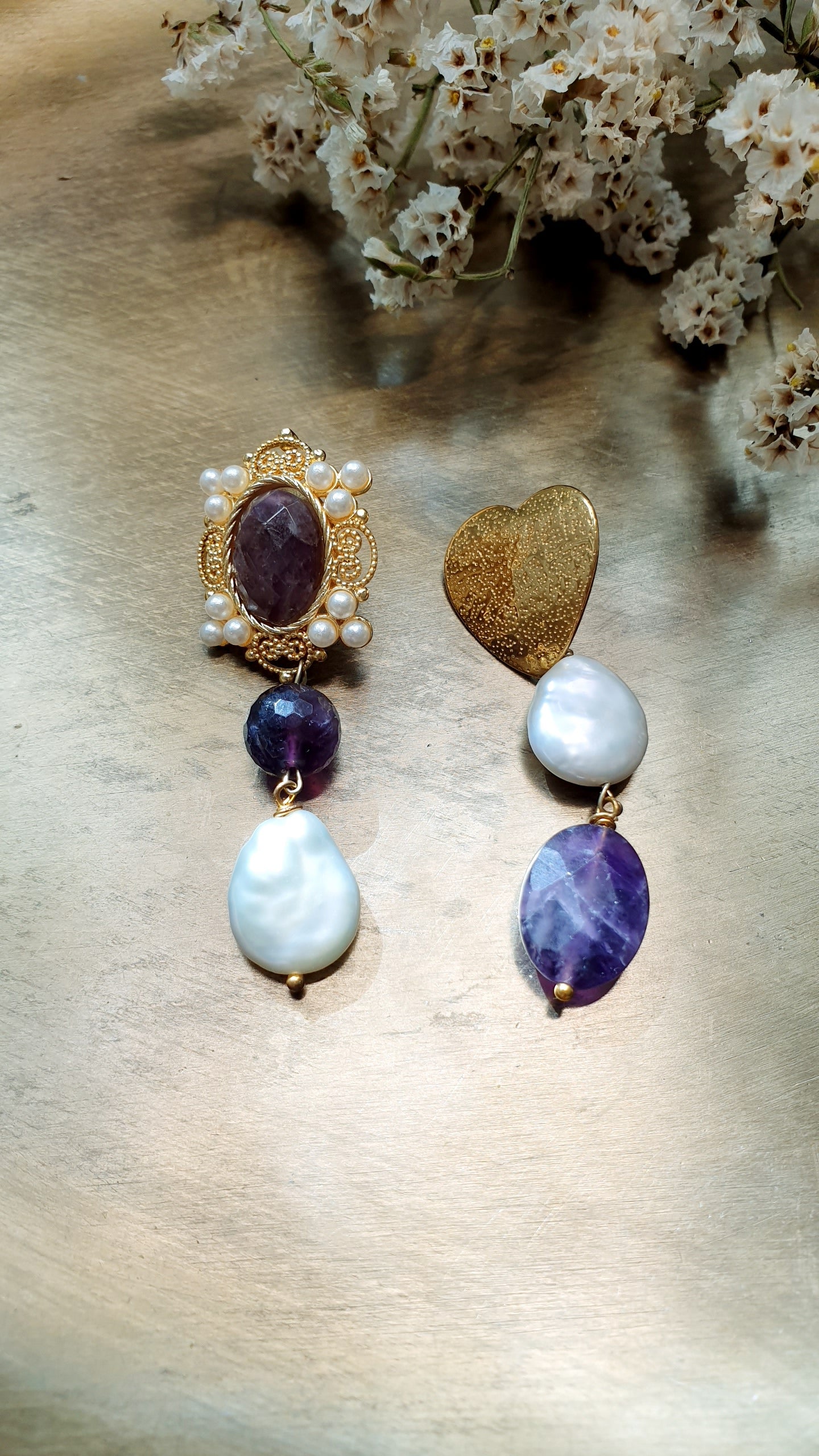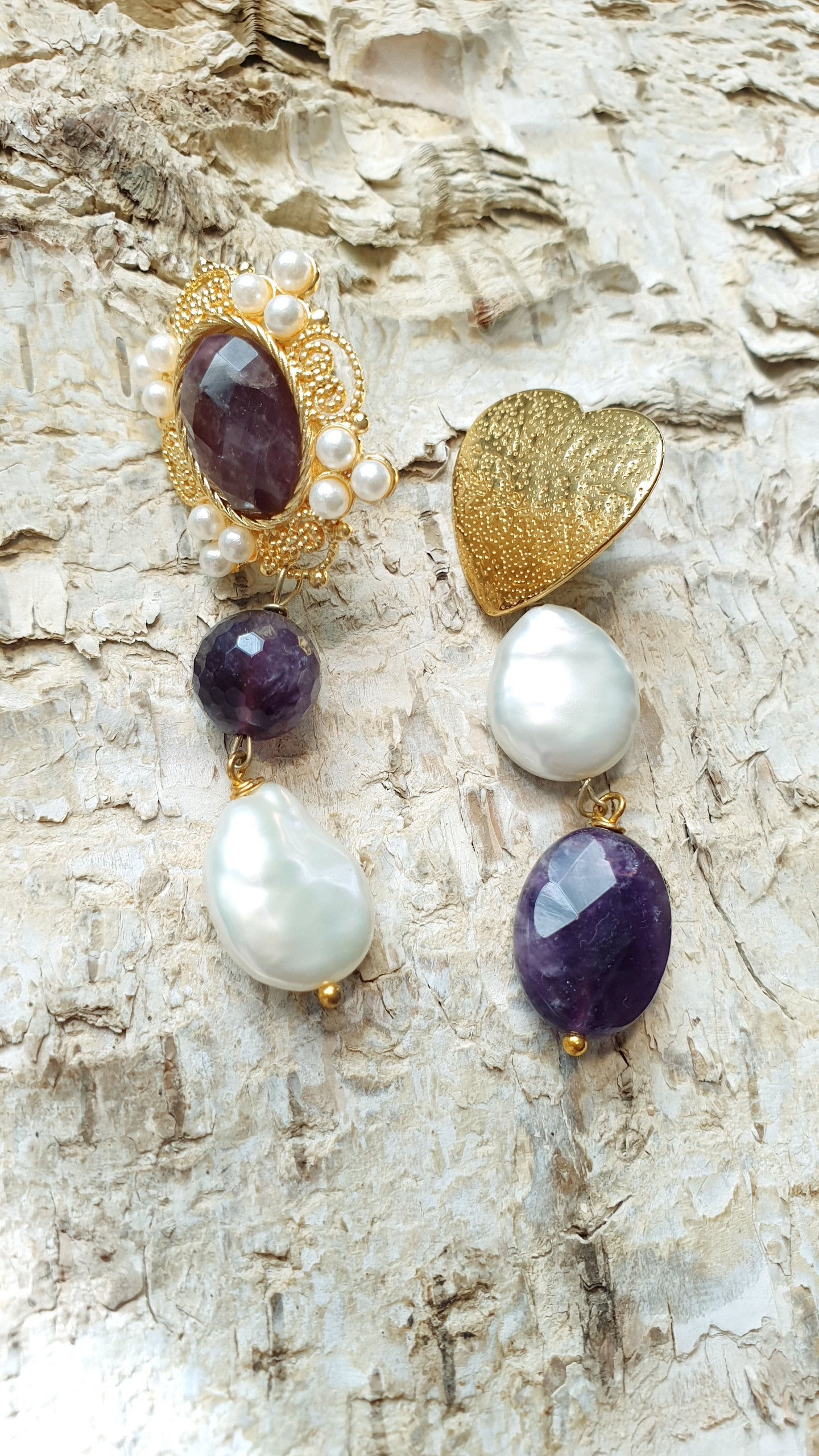 Orecchini asimmetrici in ottone con ametiste e perle di fiume.