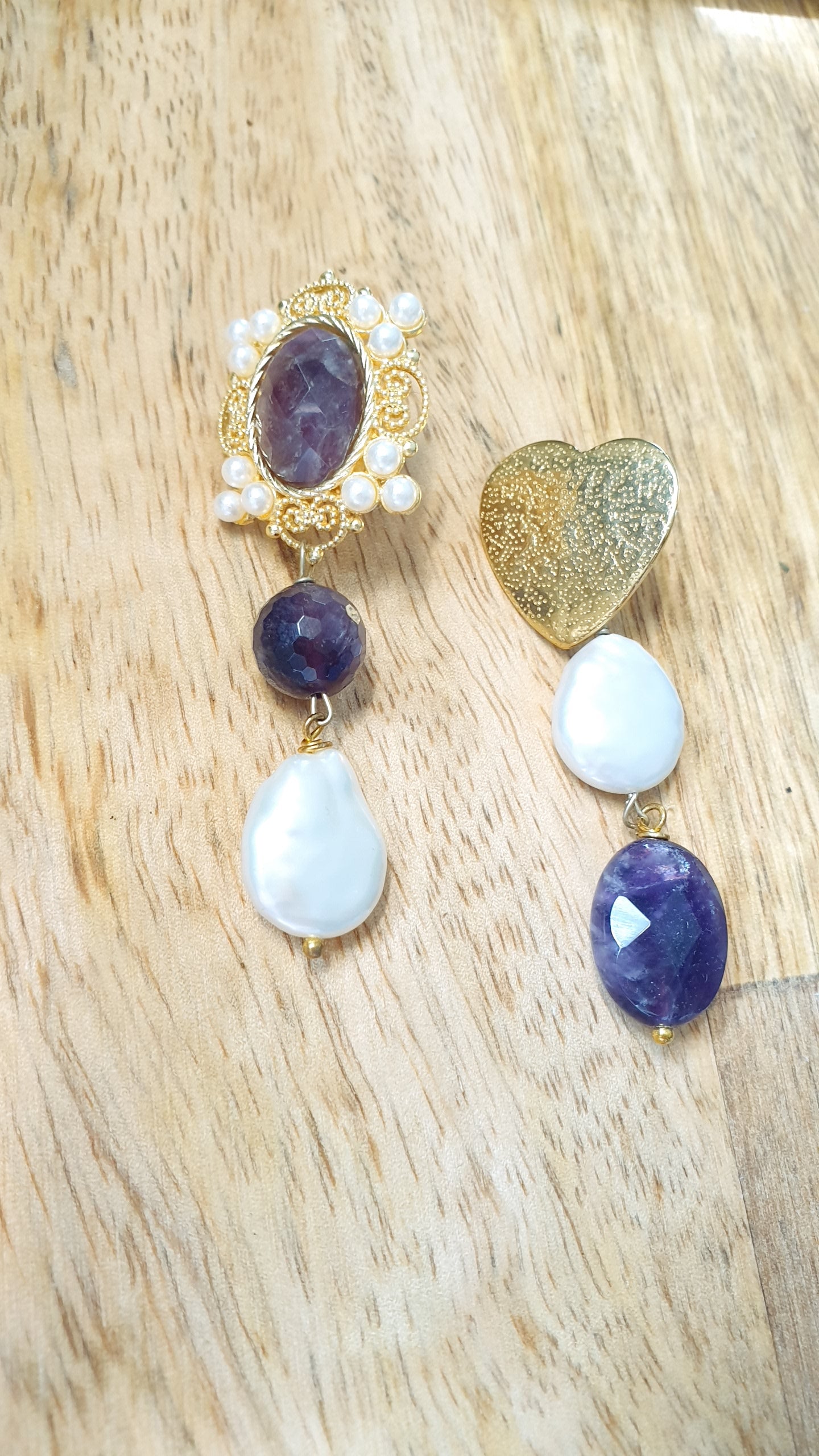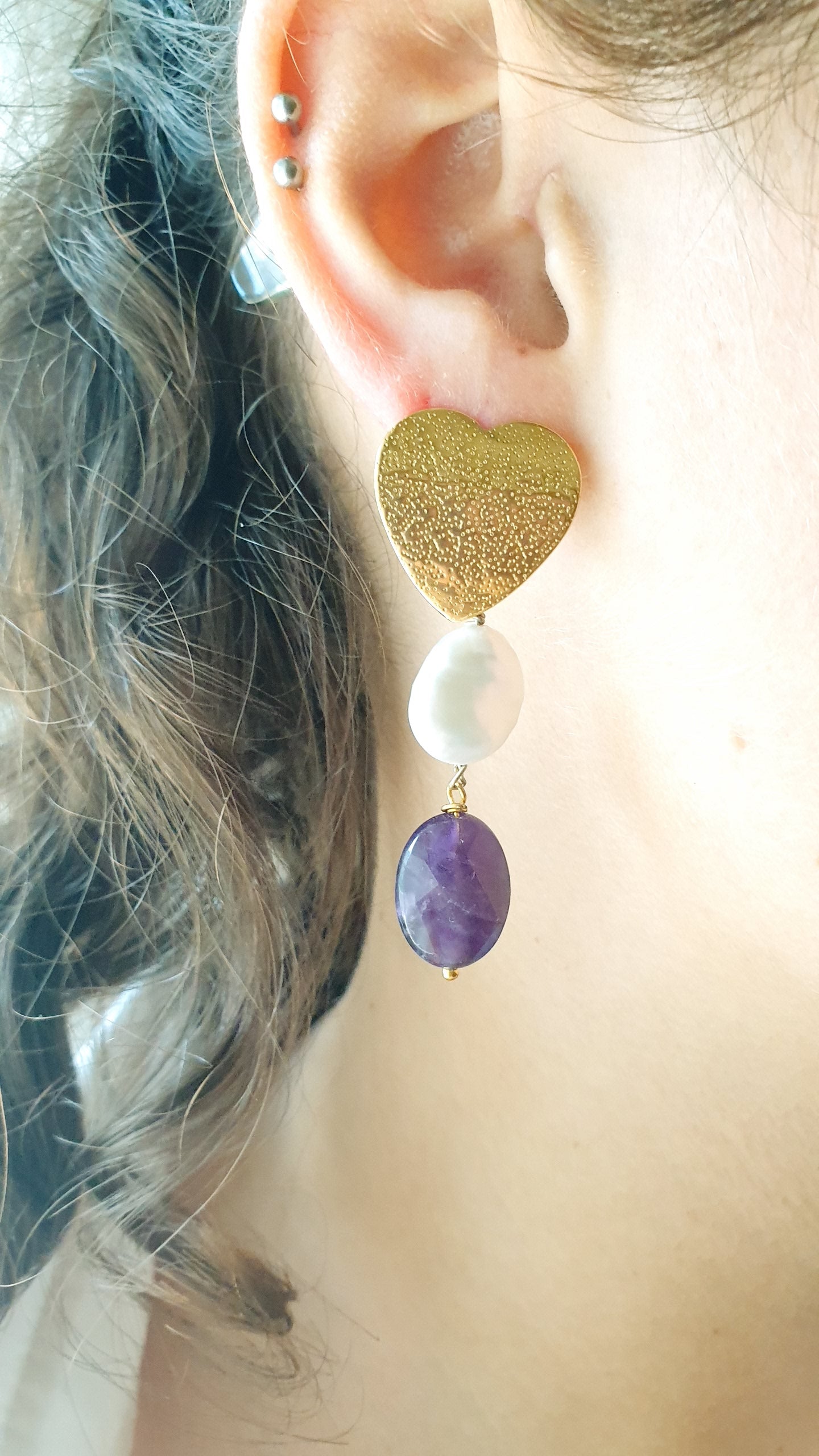 Orecchini artigianali asimmetrici realizzati con gancio a perno in ottone, ametista e perline; altro gancio cuore a perno in ottone. in ottone