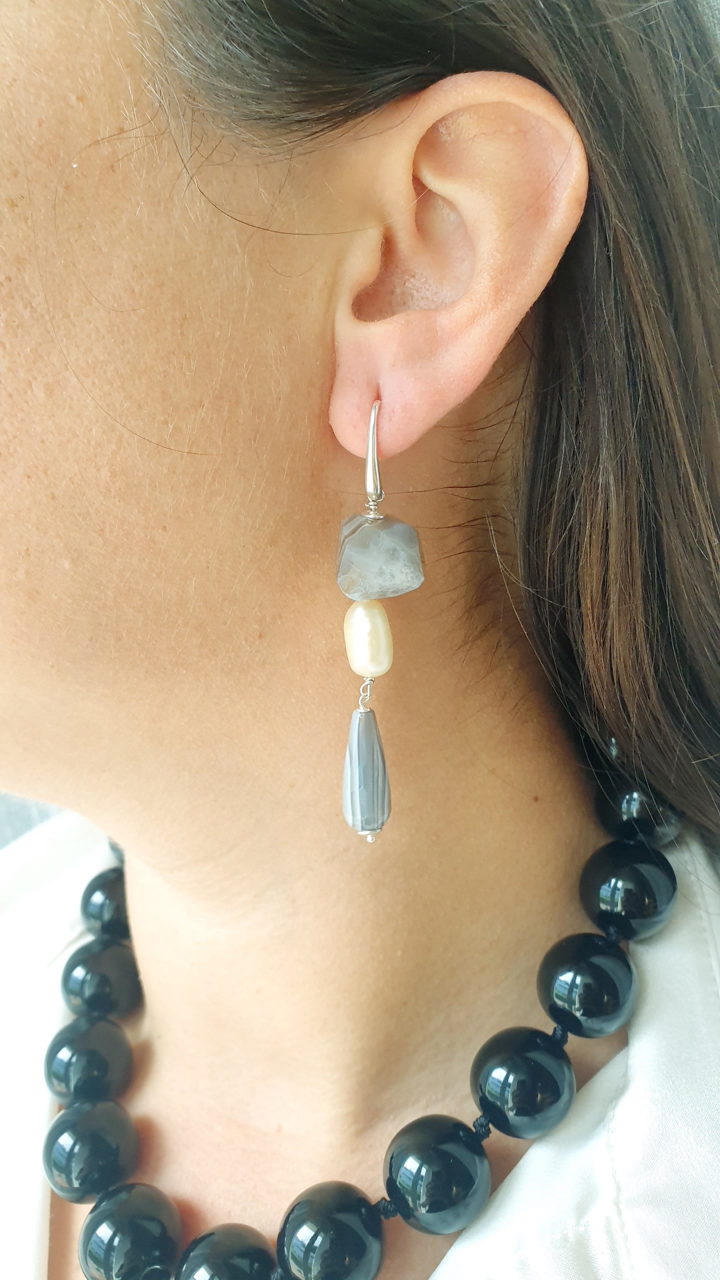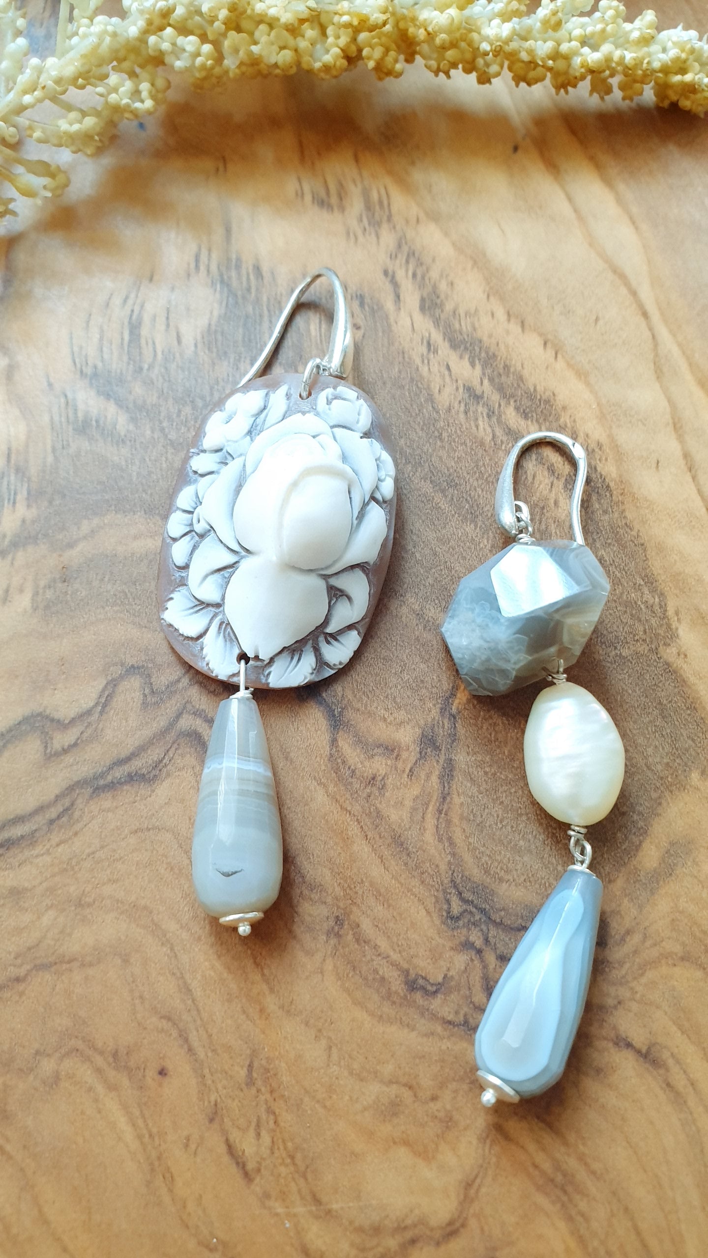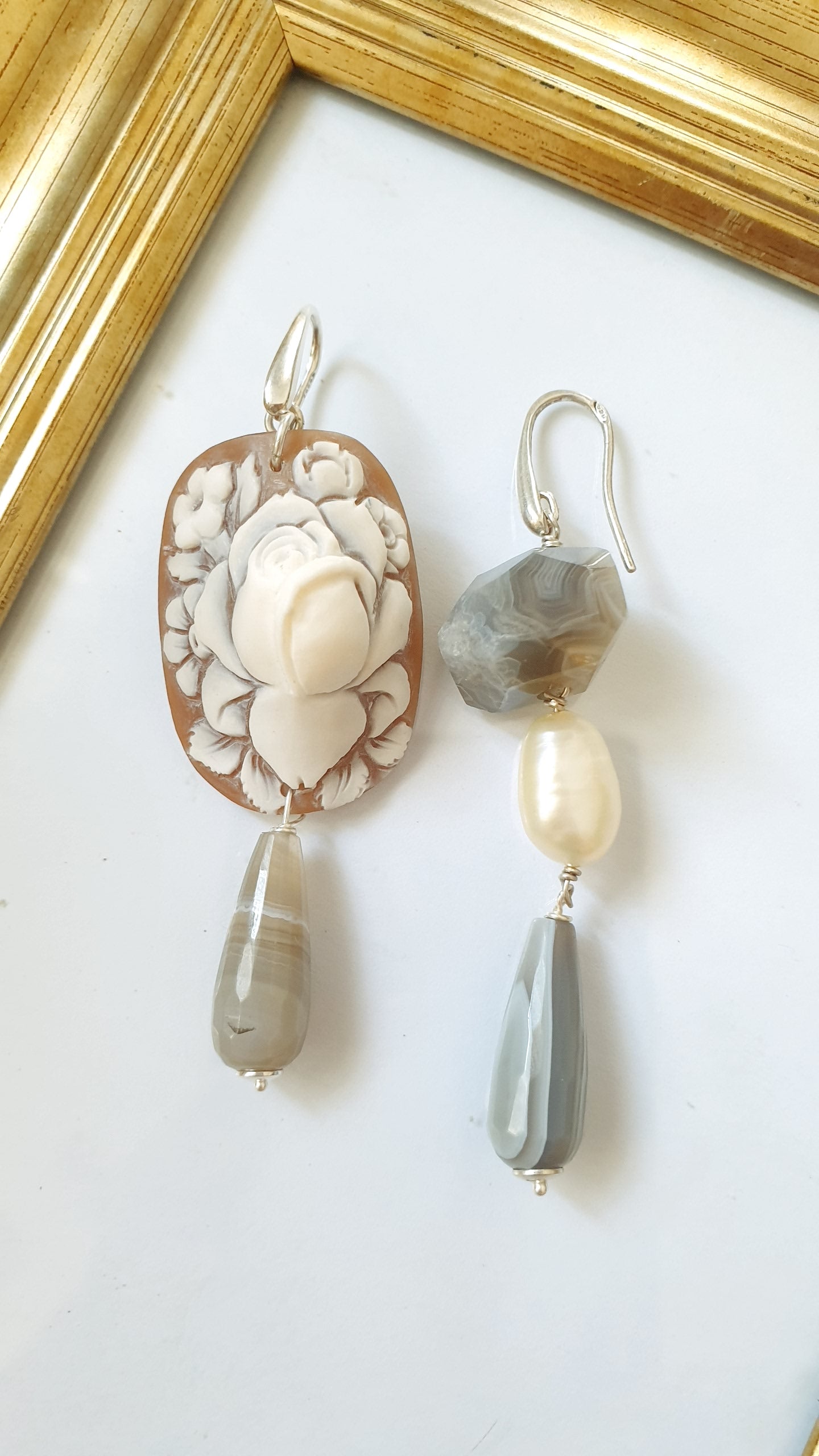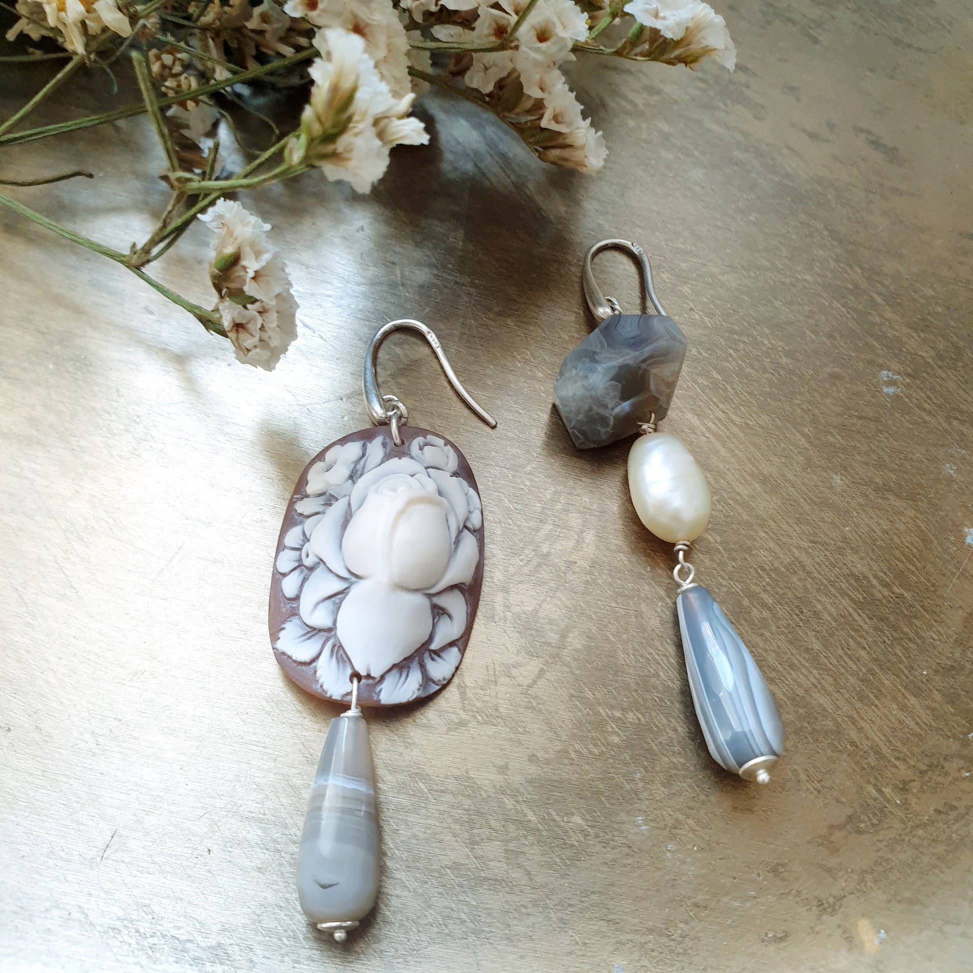 Orecchini in argento con cammeo, agata, perla di fiume