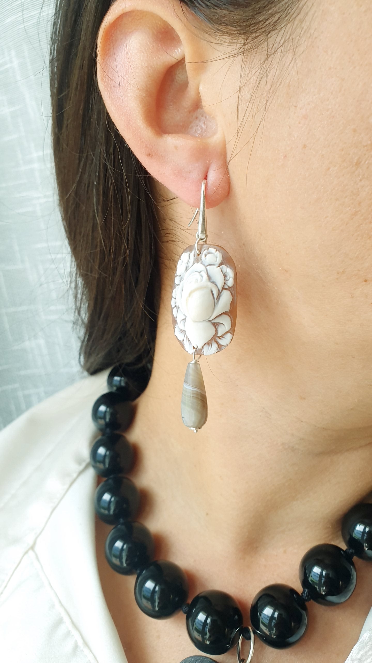 Grande cammeo da maestro di Torre del Greco cm. 3.5 x 2.5, gocce in agata grigia cm. 2, agata grigia cm. 2 x 1.