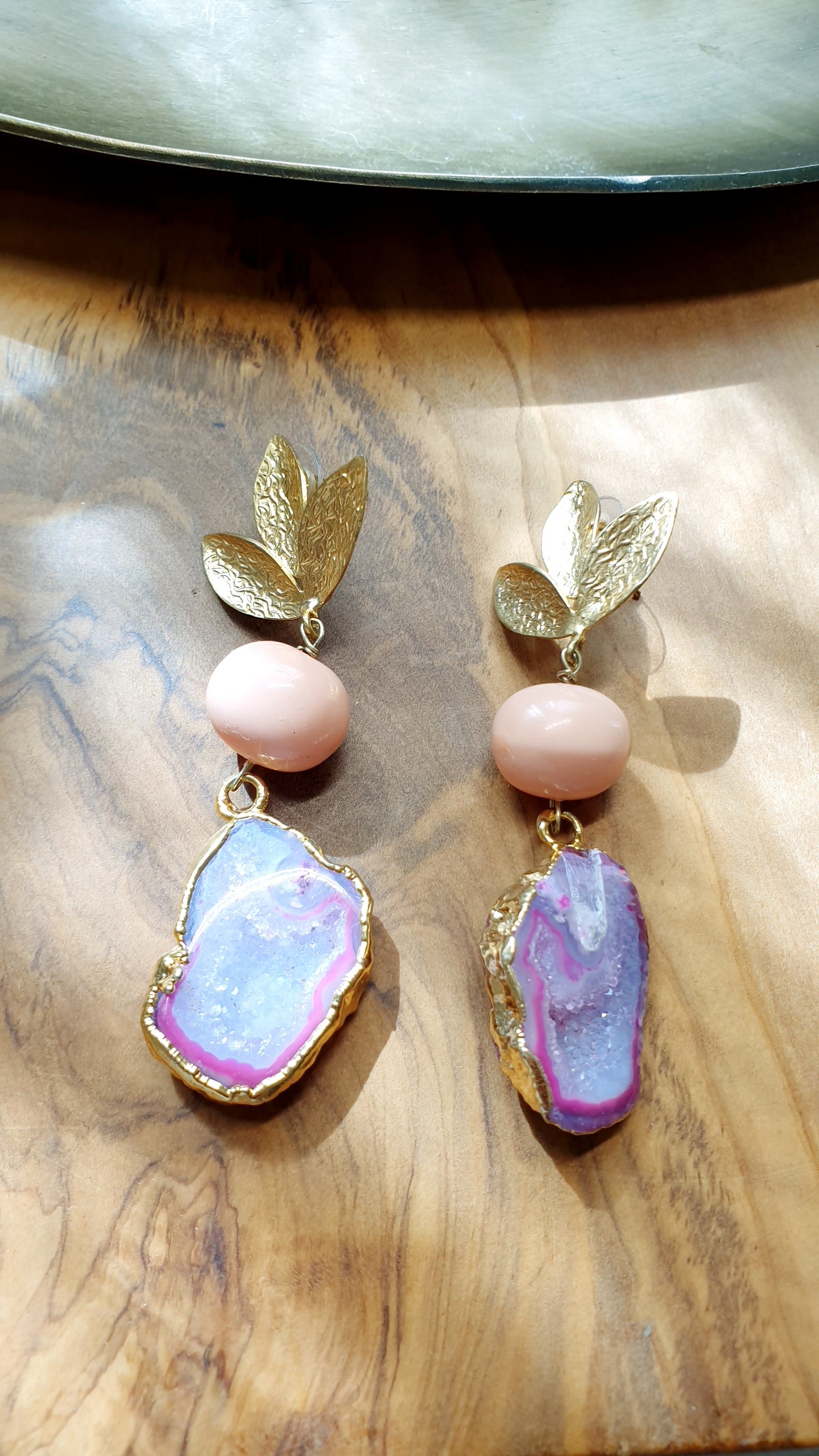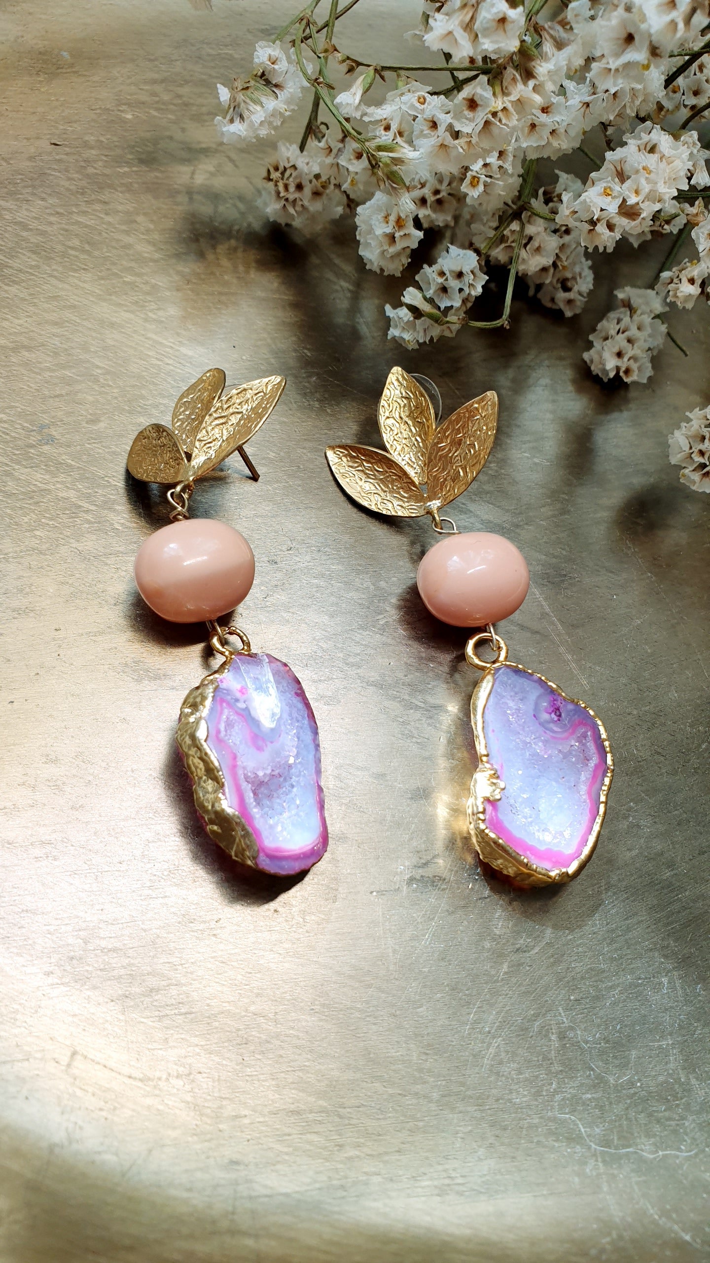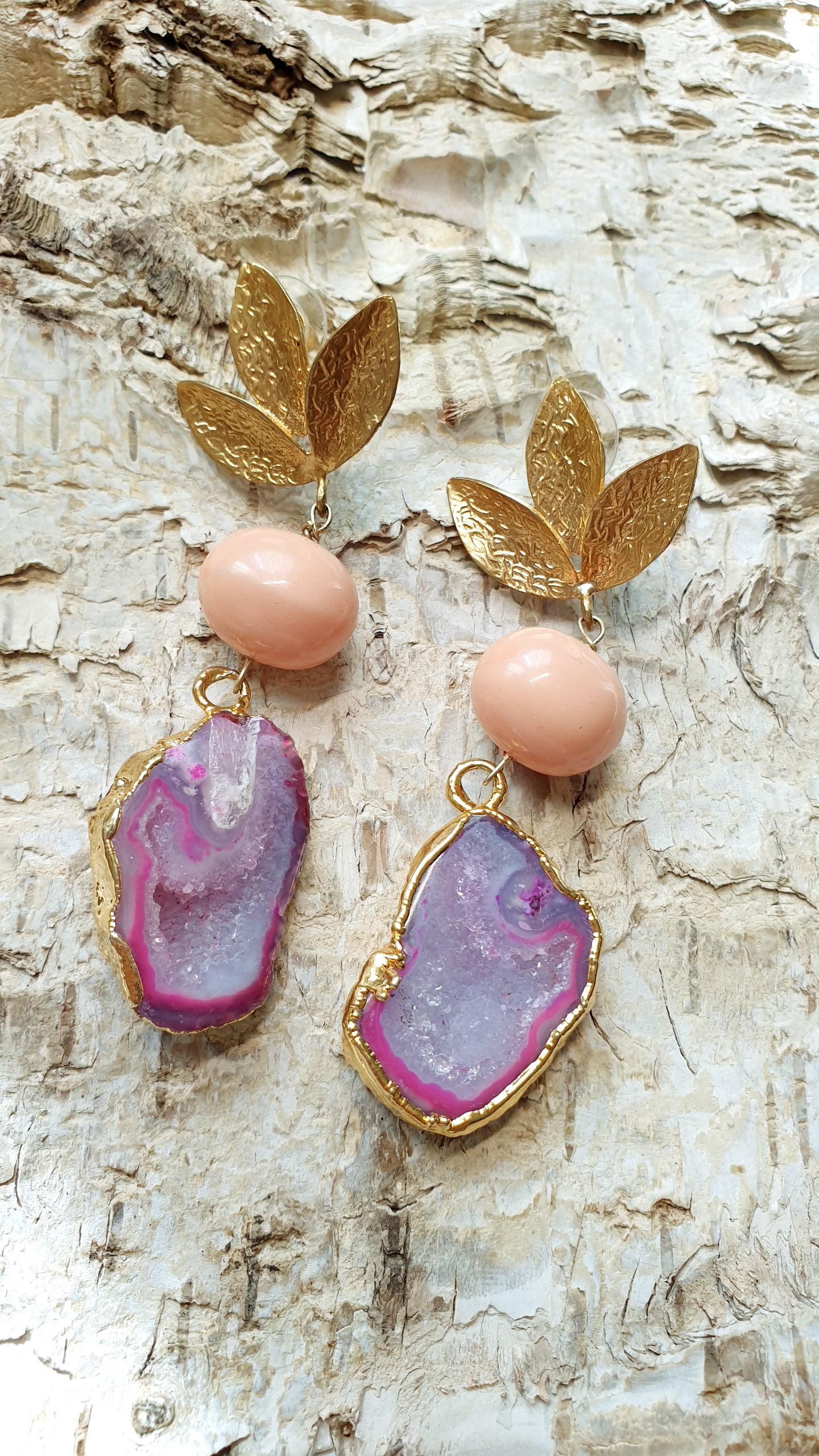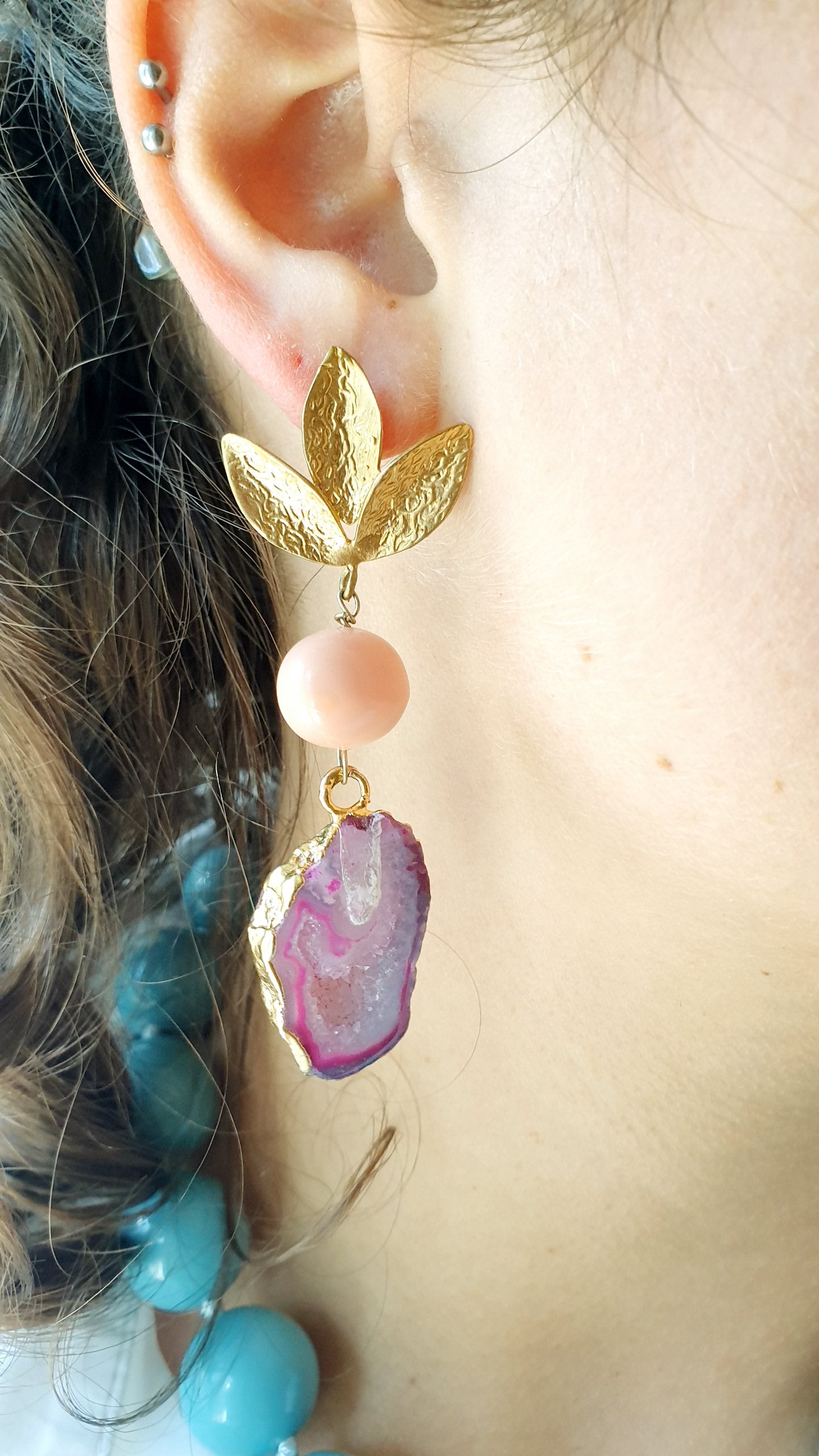 Orecchini in ottone con druse di agata e perle di Maiorca.