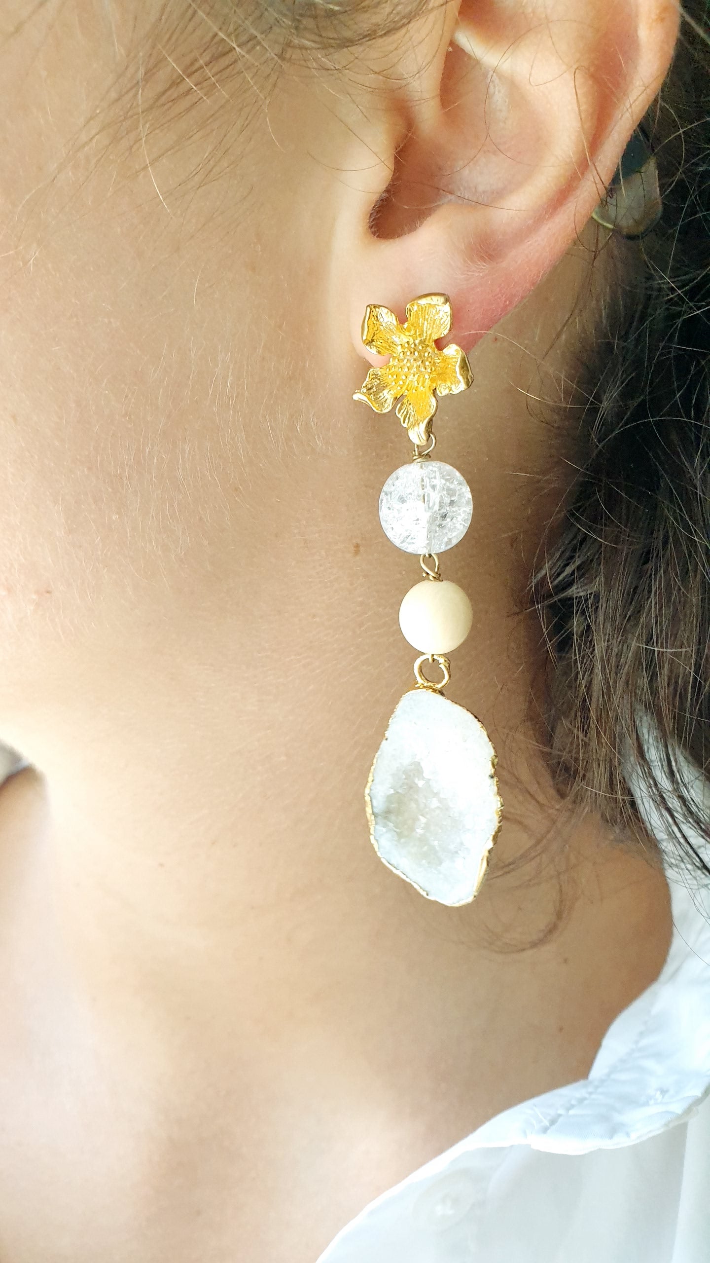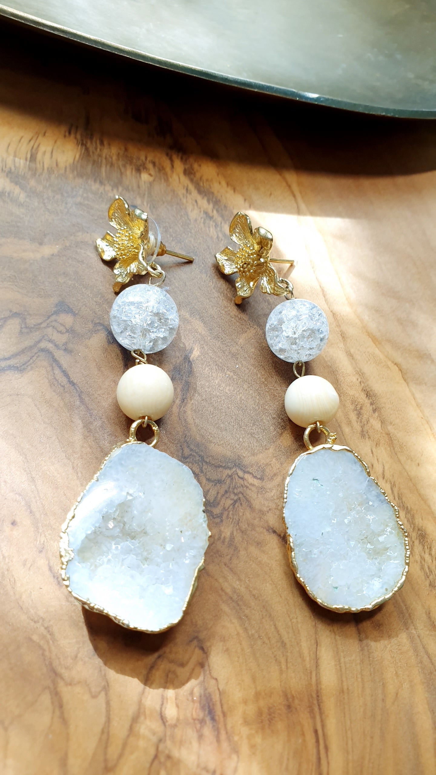 Orecchini in ottone con druse di agata, quarzo bianco e resina