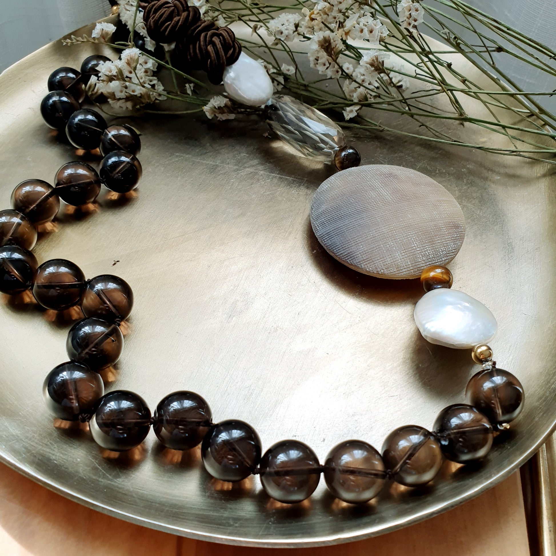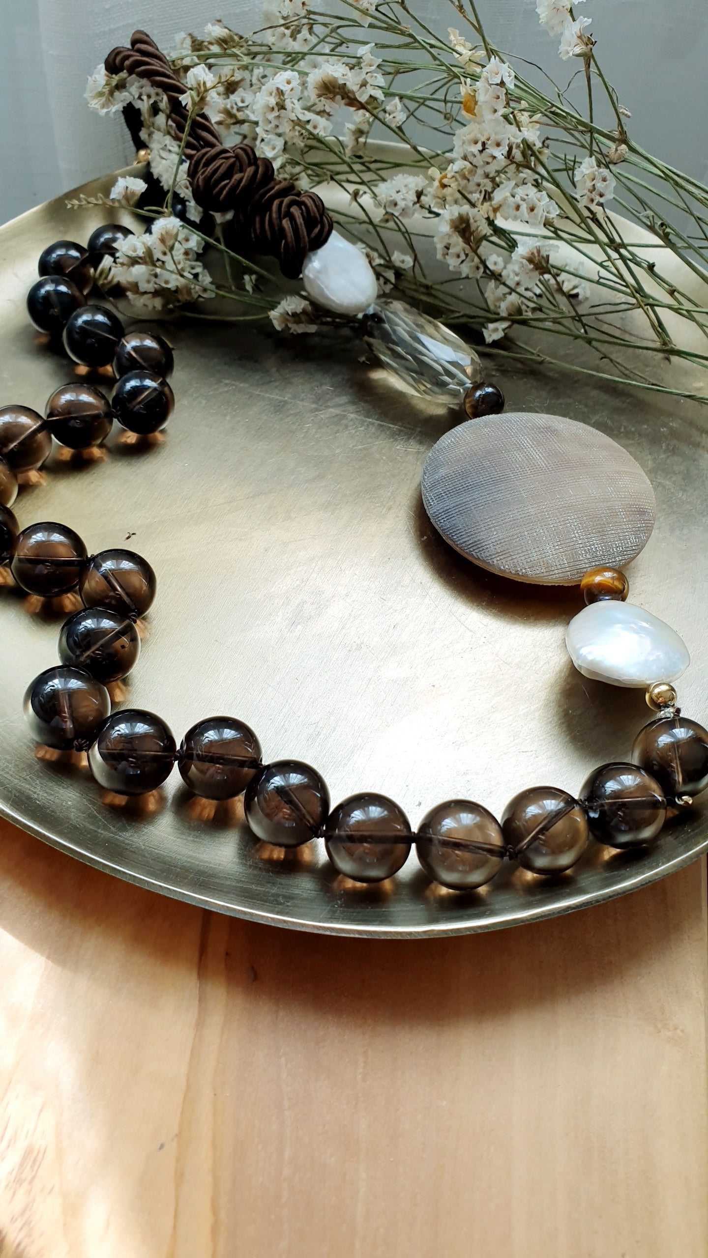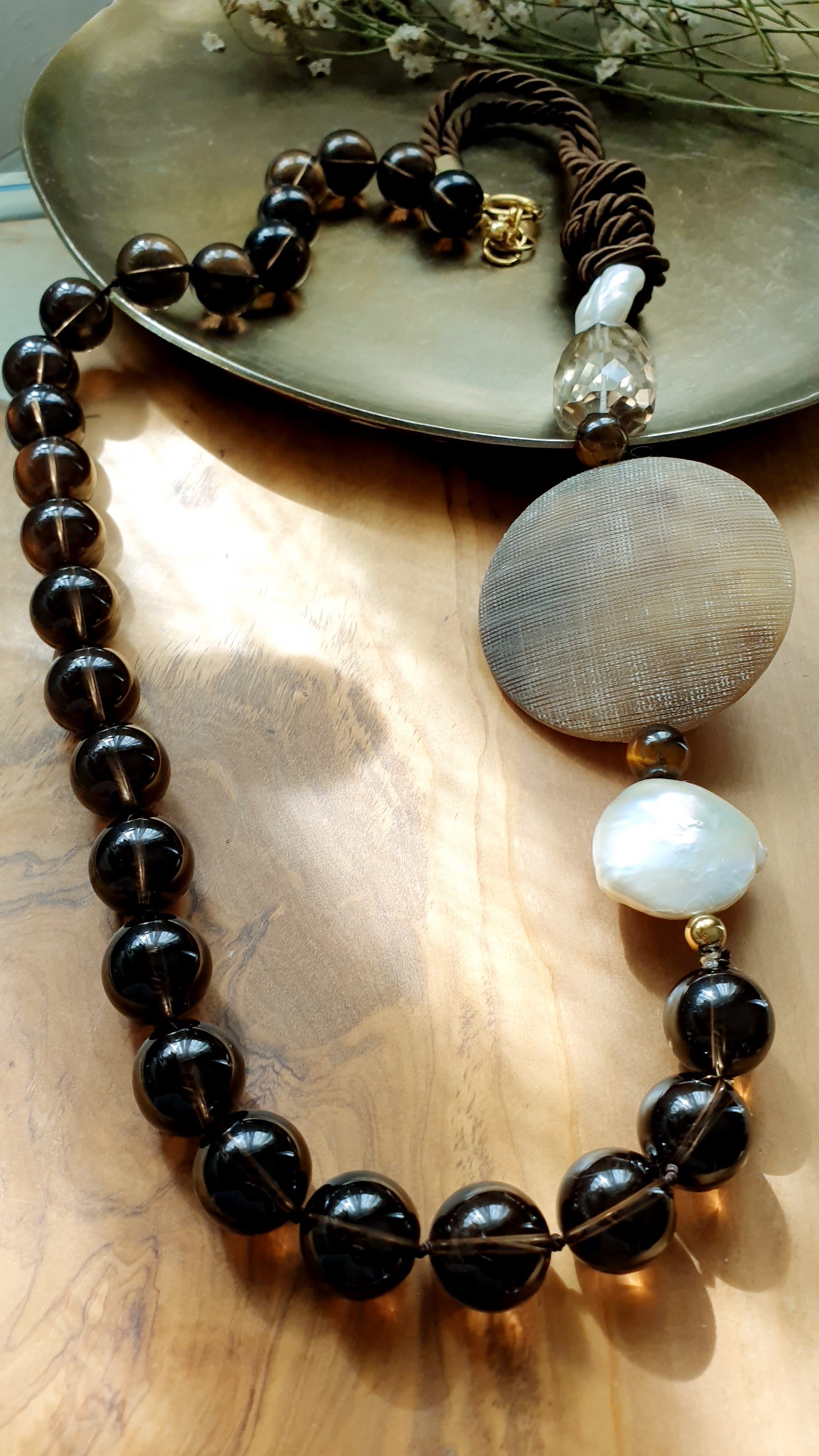 Splendida collana artigianale realizzata con chiusura in acciaio, Sfere in quarzo fumo mm. 16, disco in corno mm. 6, quarzo fumo sfaccettato cm. 4 x 2, perle barocche, seta ritorta.