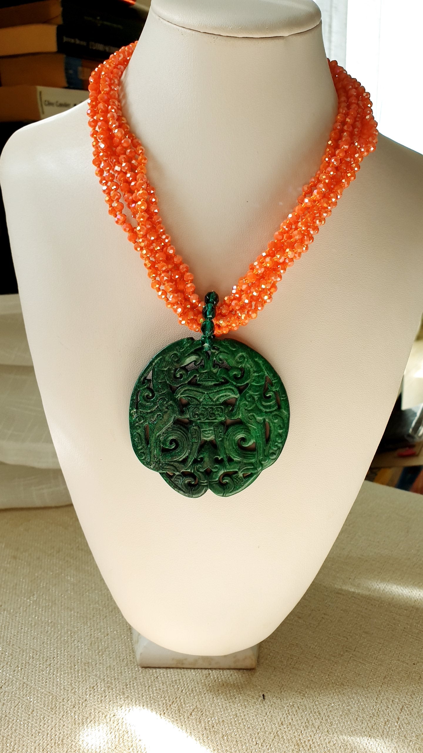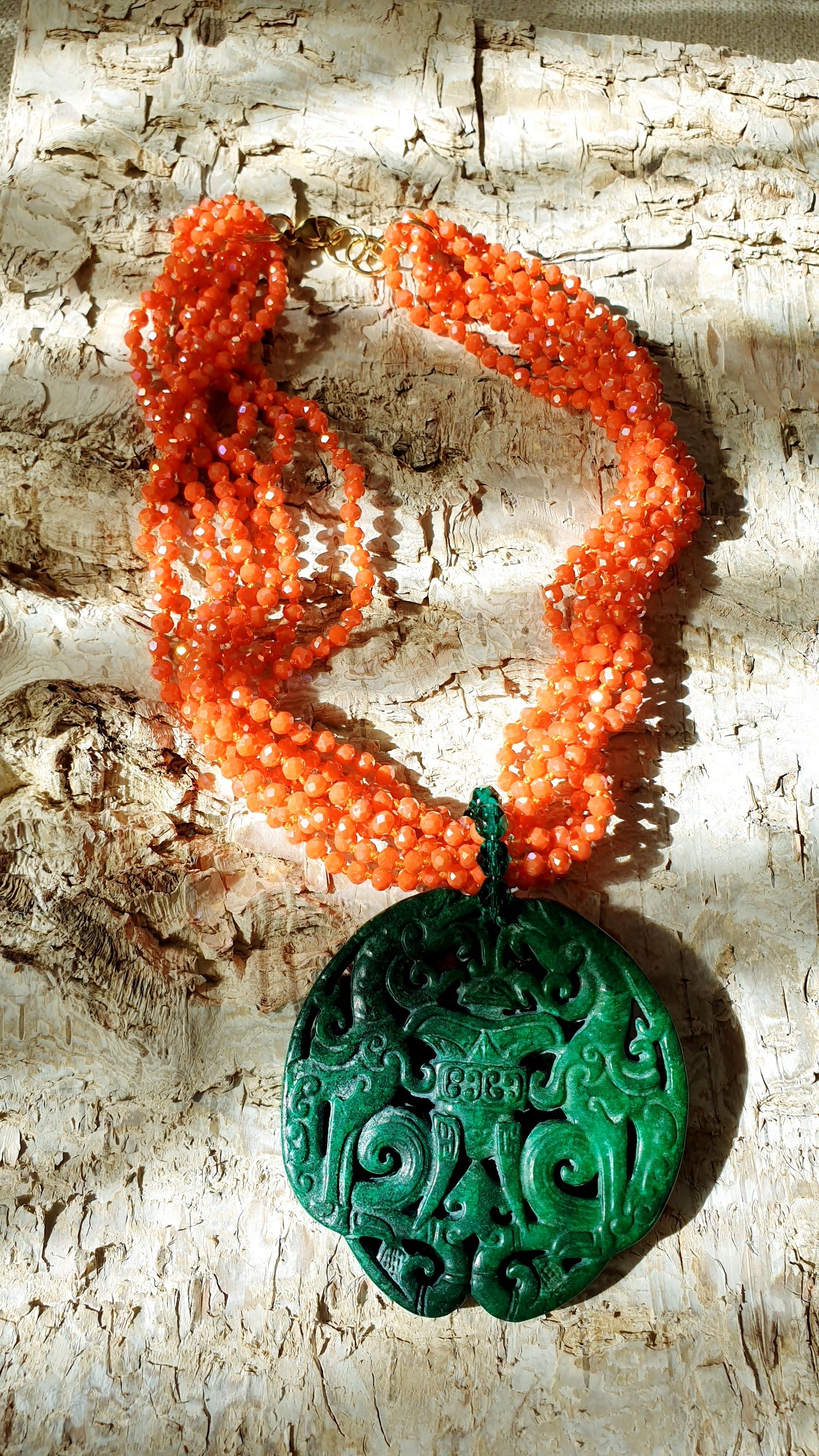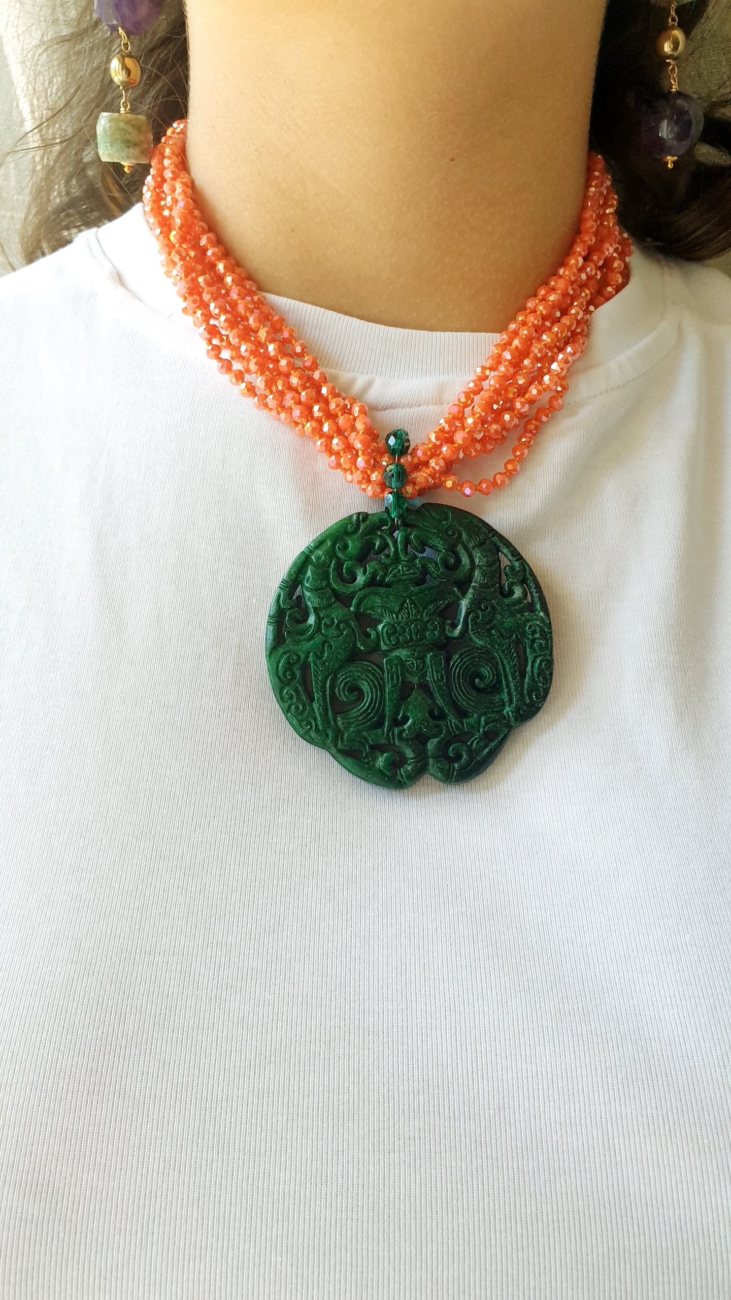Collana artigianale realizzata con girocollo in fili di cristallini arancio, grande giada verde intagliata cm. 7.