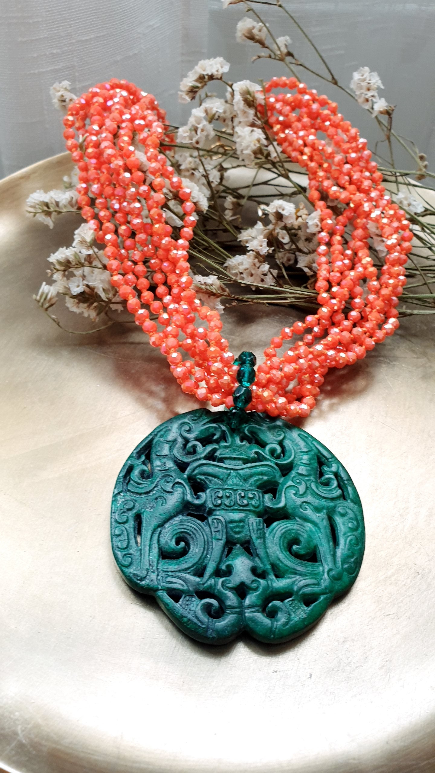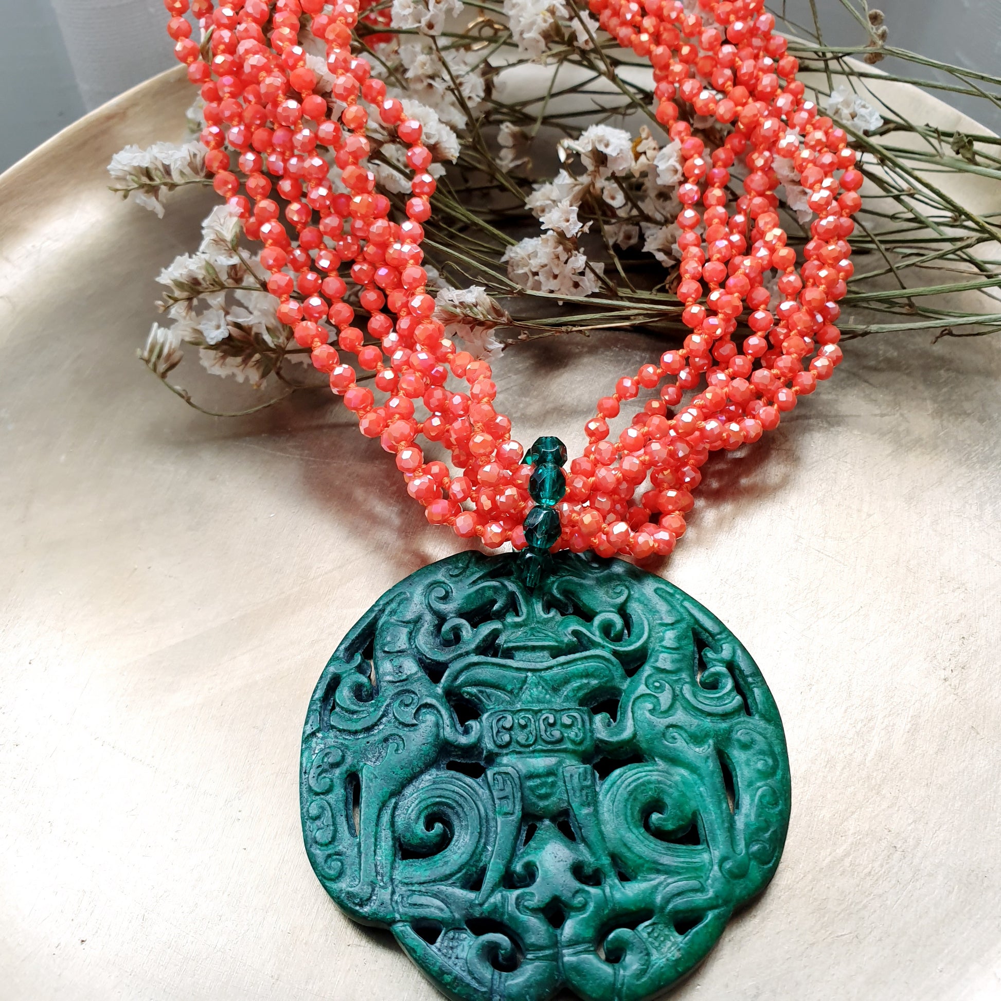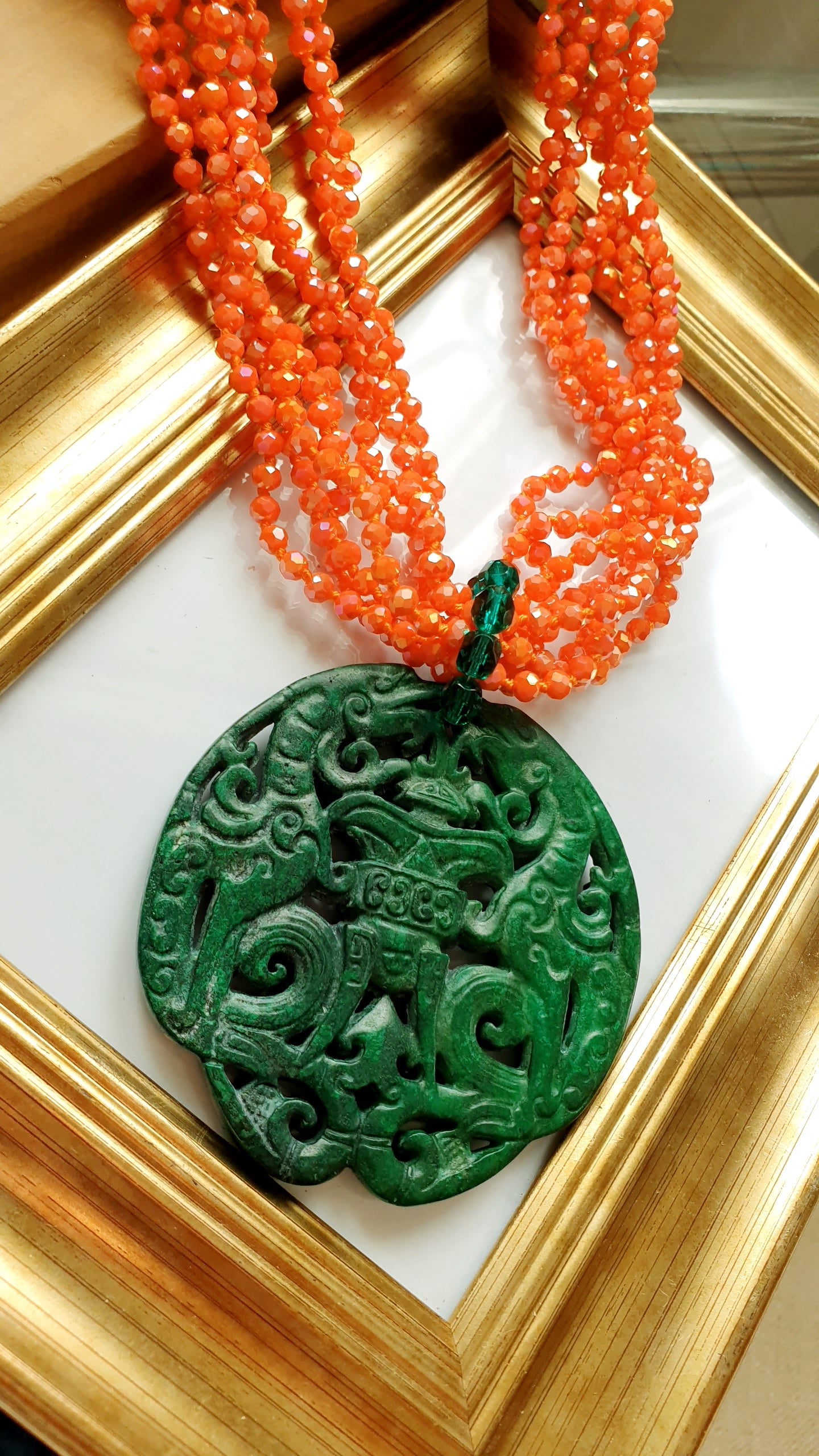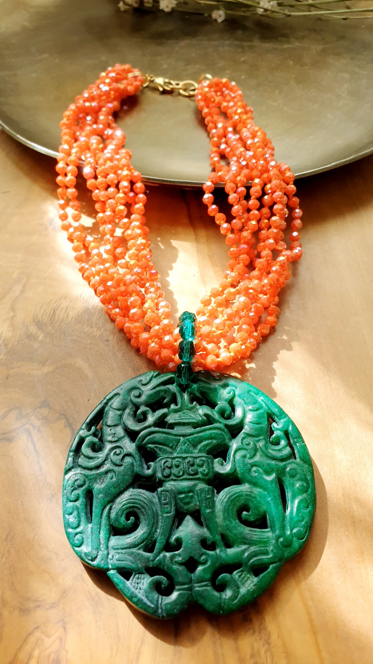 Collana artigianale realizzata con girocollo in fili di cristallini arancio, grande giada verde intagliata cm. 7.
