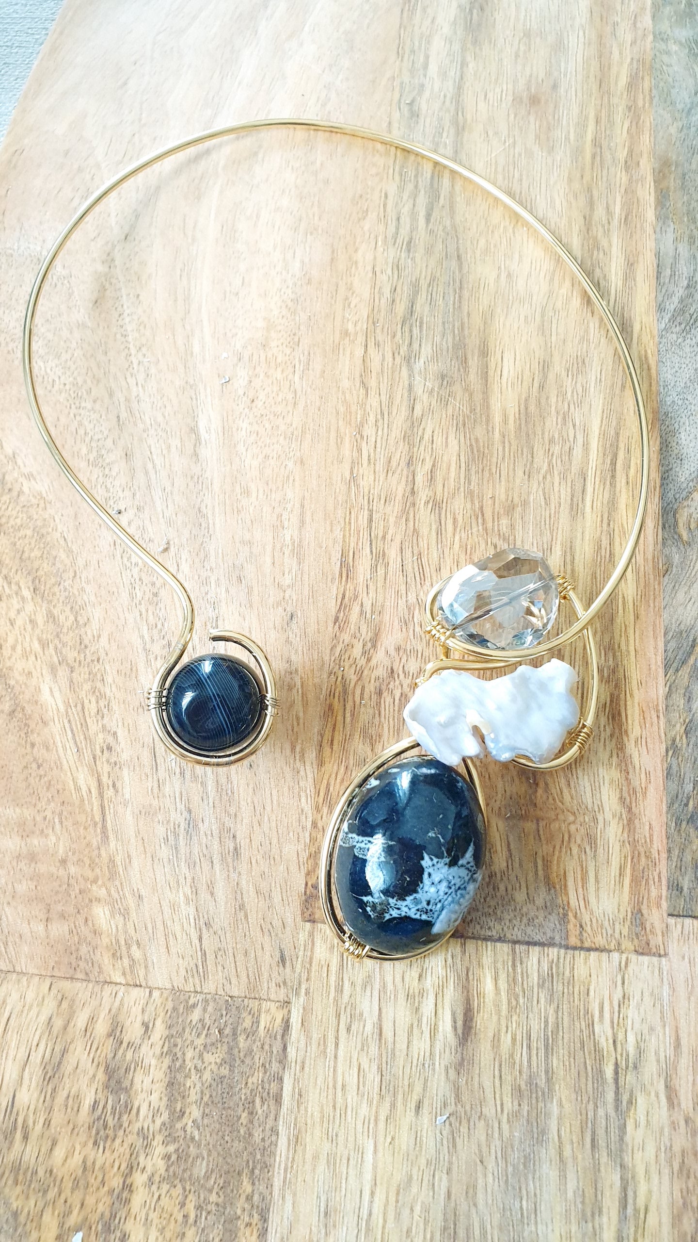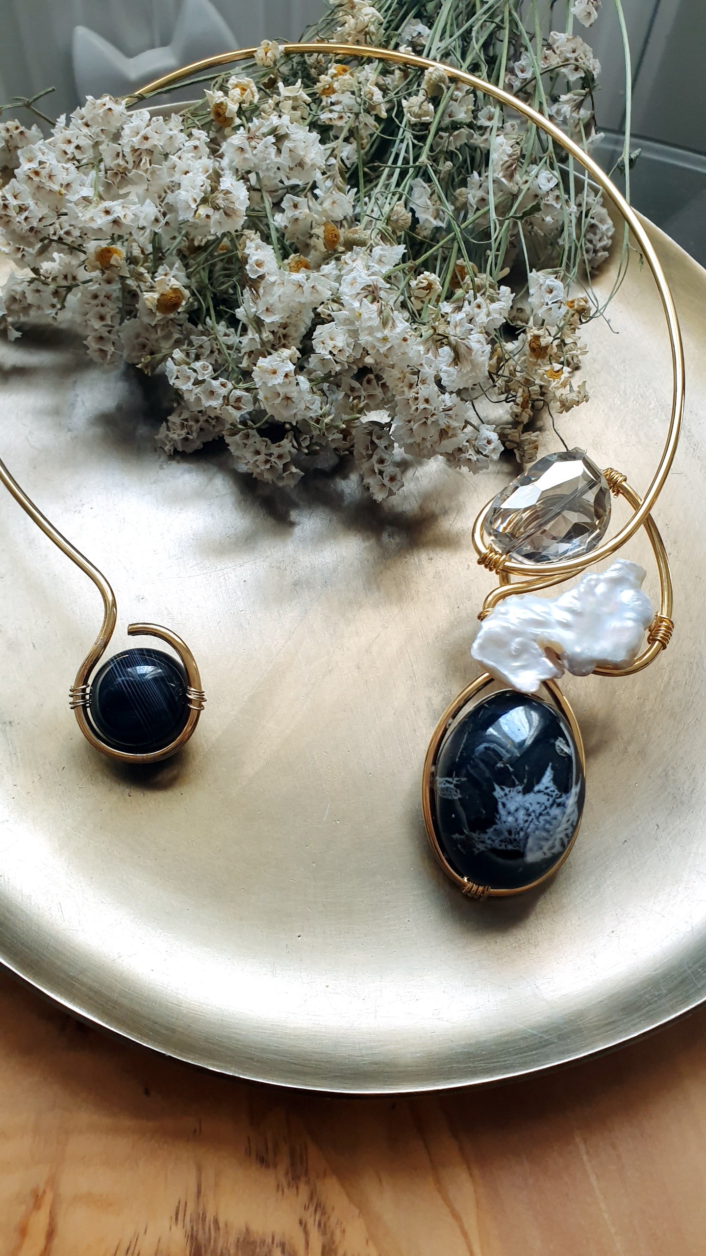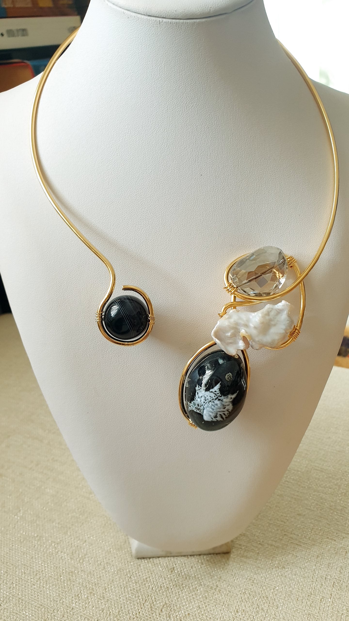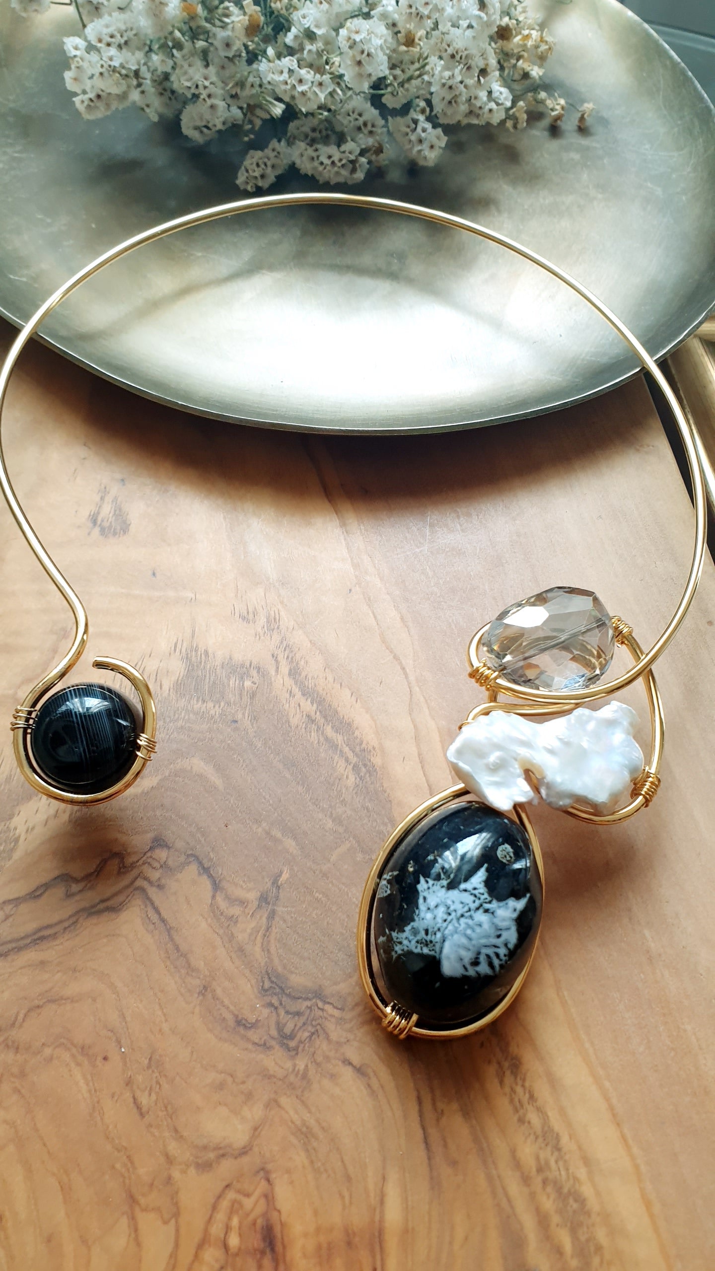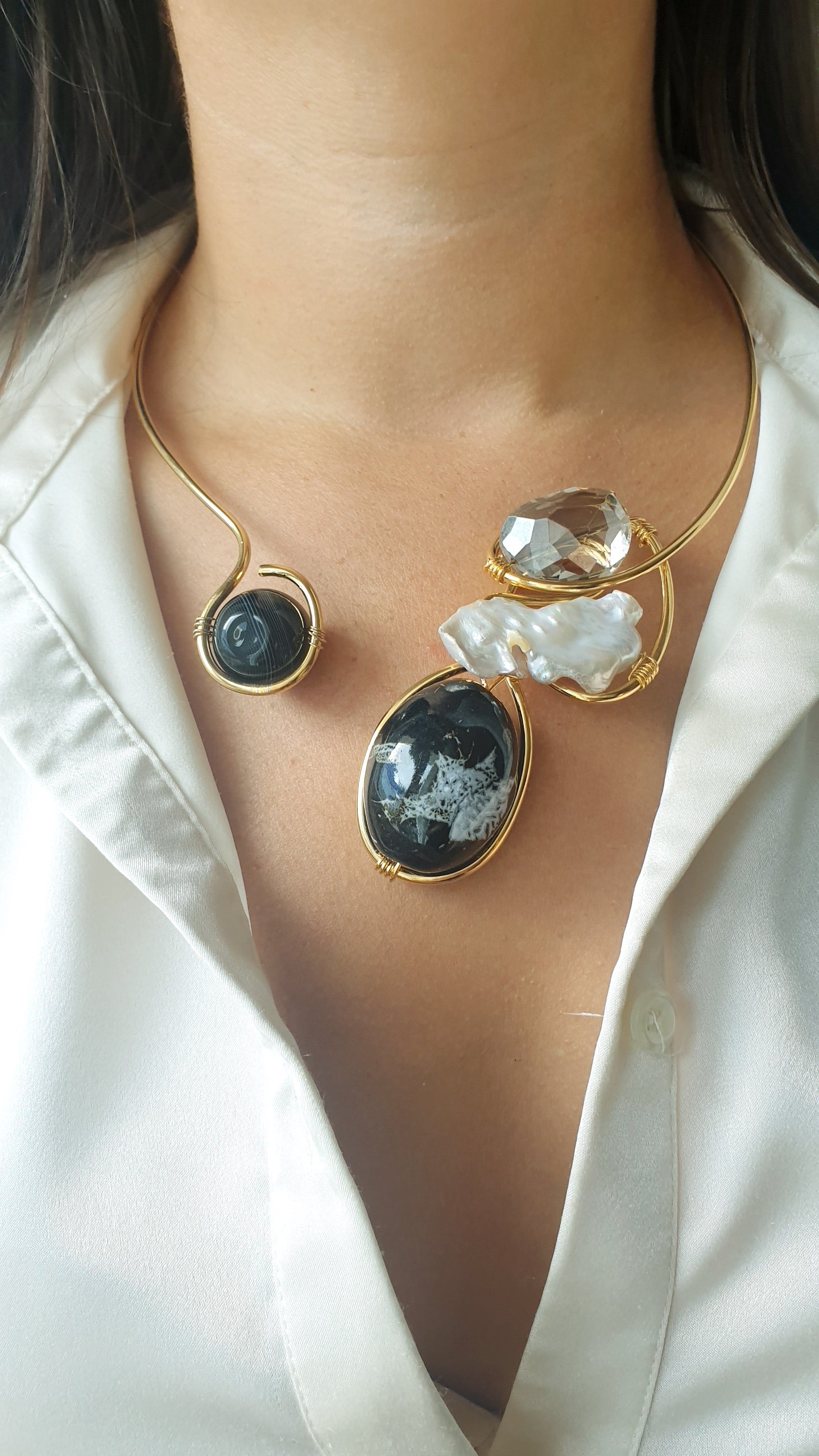 Girocollo placcato oro con perla barocca, cristallo, agata, ceramica