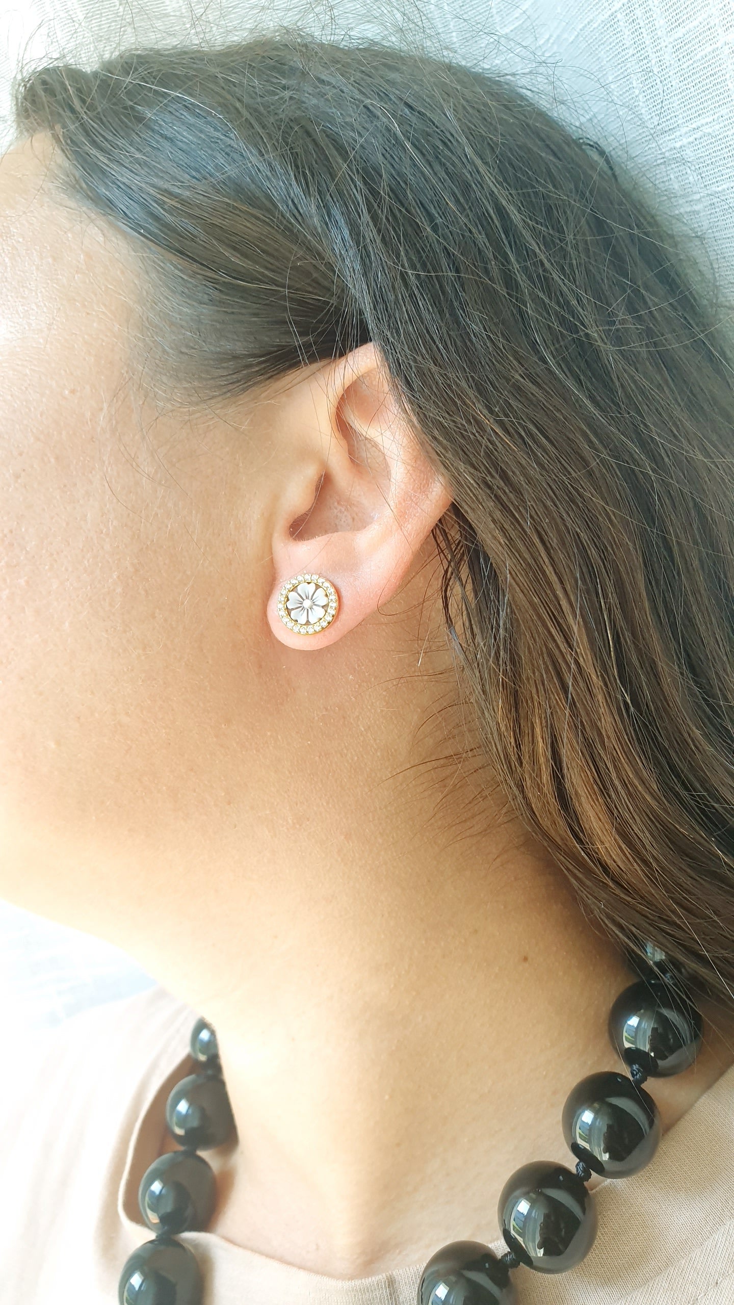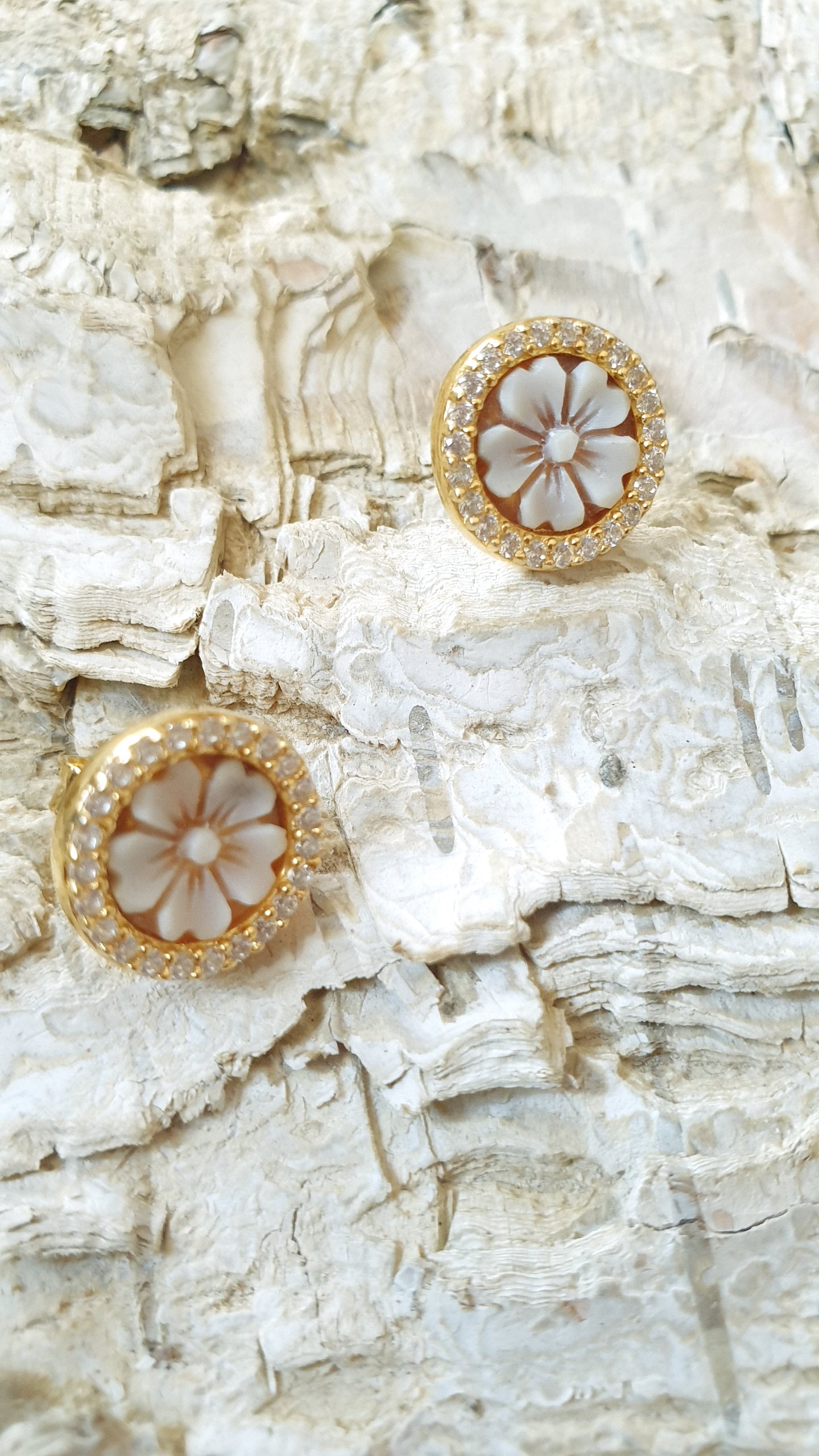 Cammeo floreale inciso su conchiglia da Maestro di Torre del Greco mm. 10, zirconi.