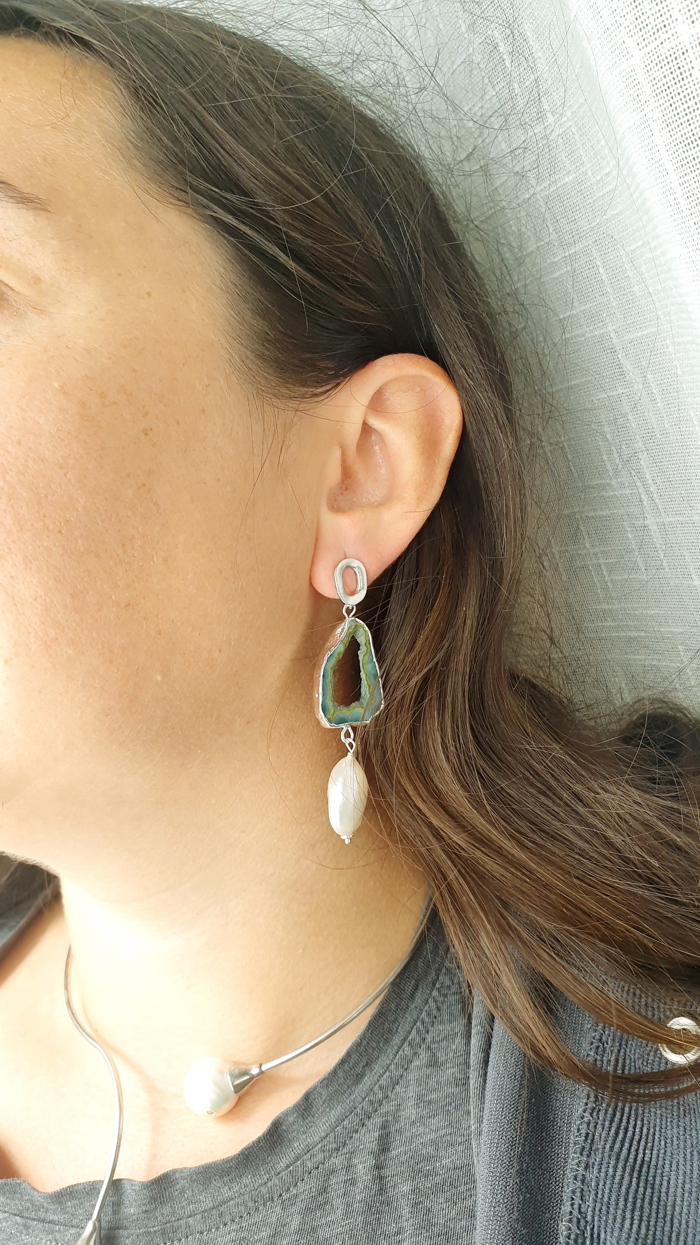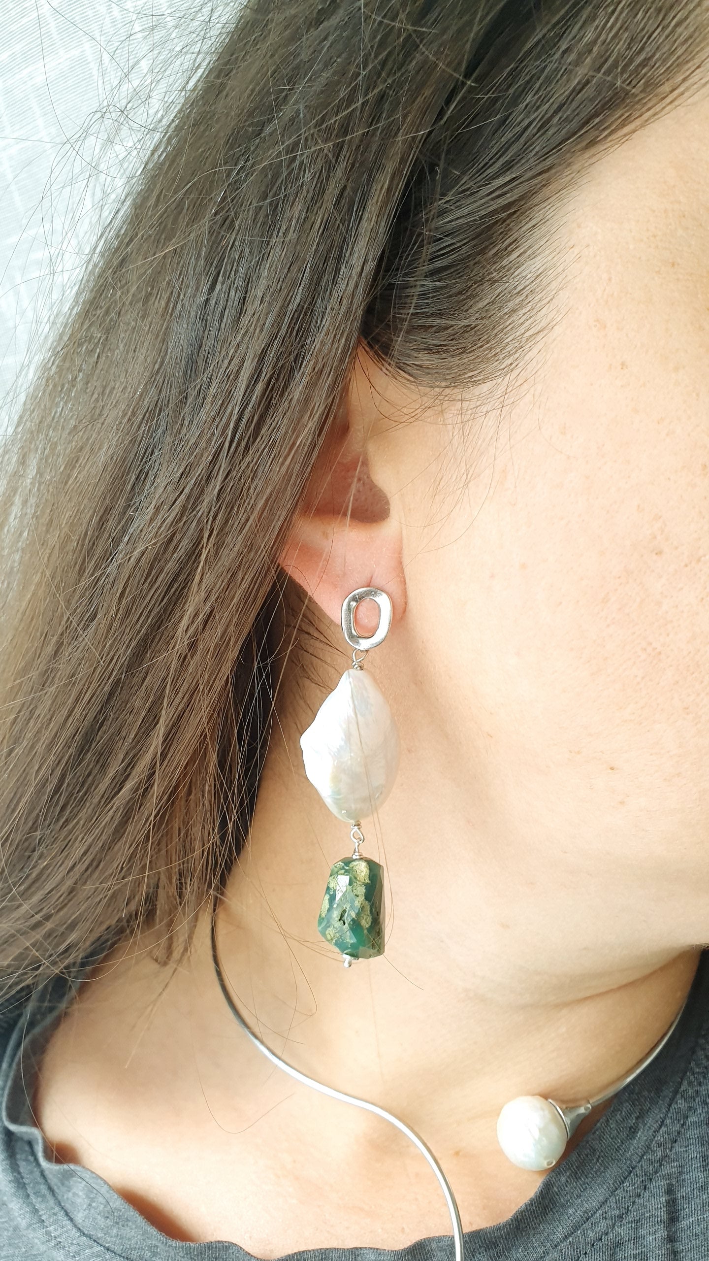 Orecchini in argento con drusa di agata, perle barocche, crisoprasio grezzo