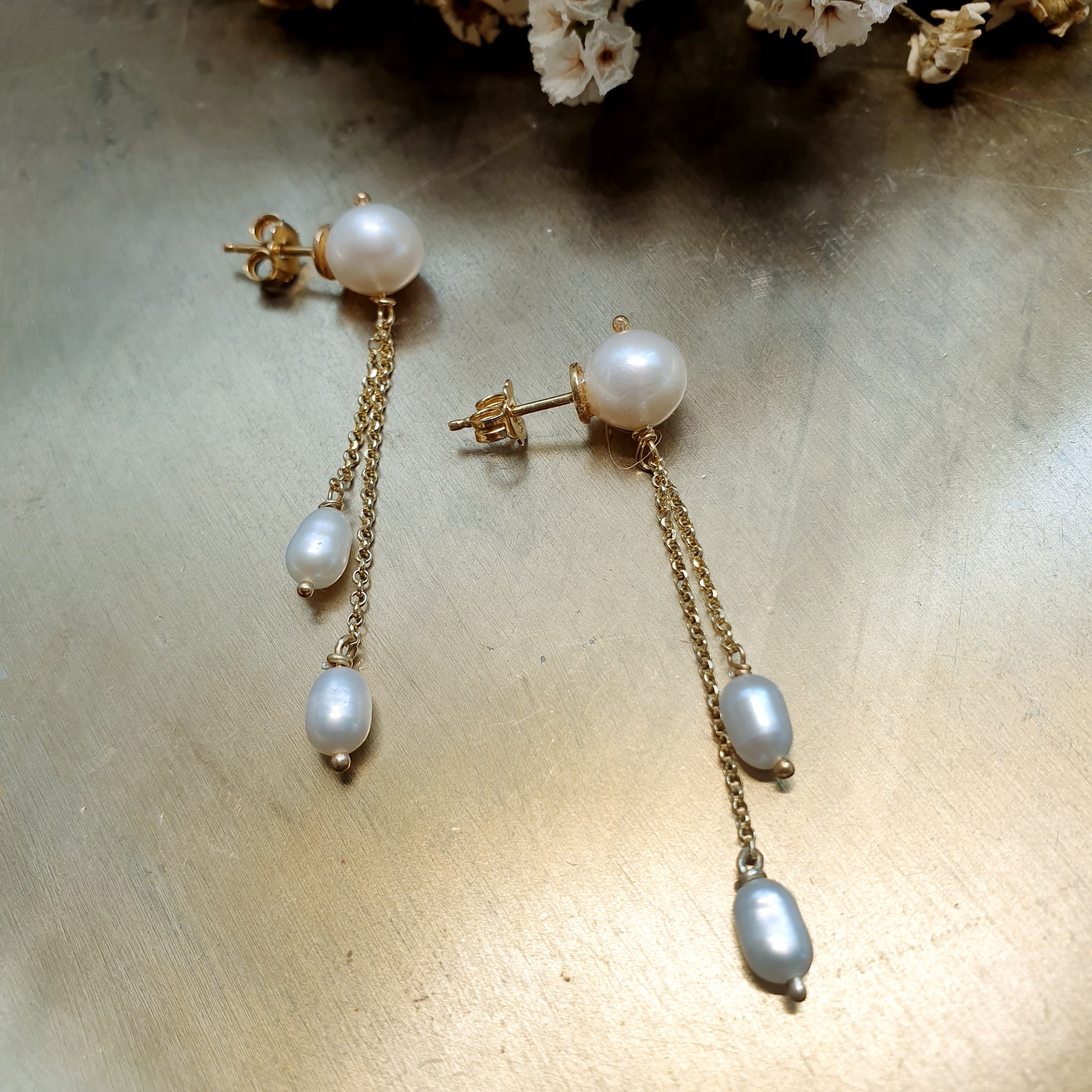 Perla di fiume mm. 8, catena in argento placcato oro, gocce in perle di fiume.