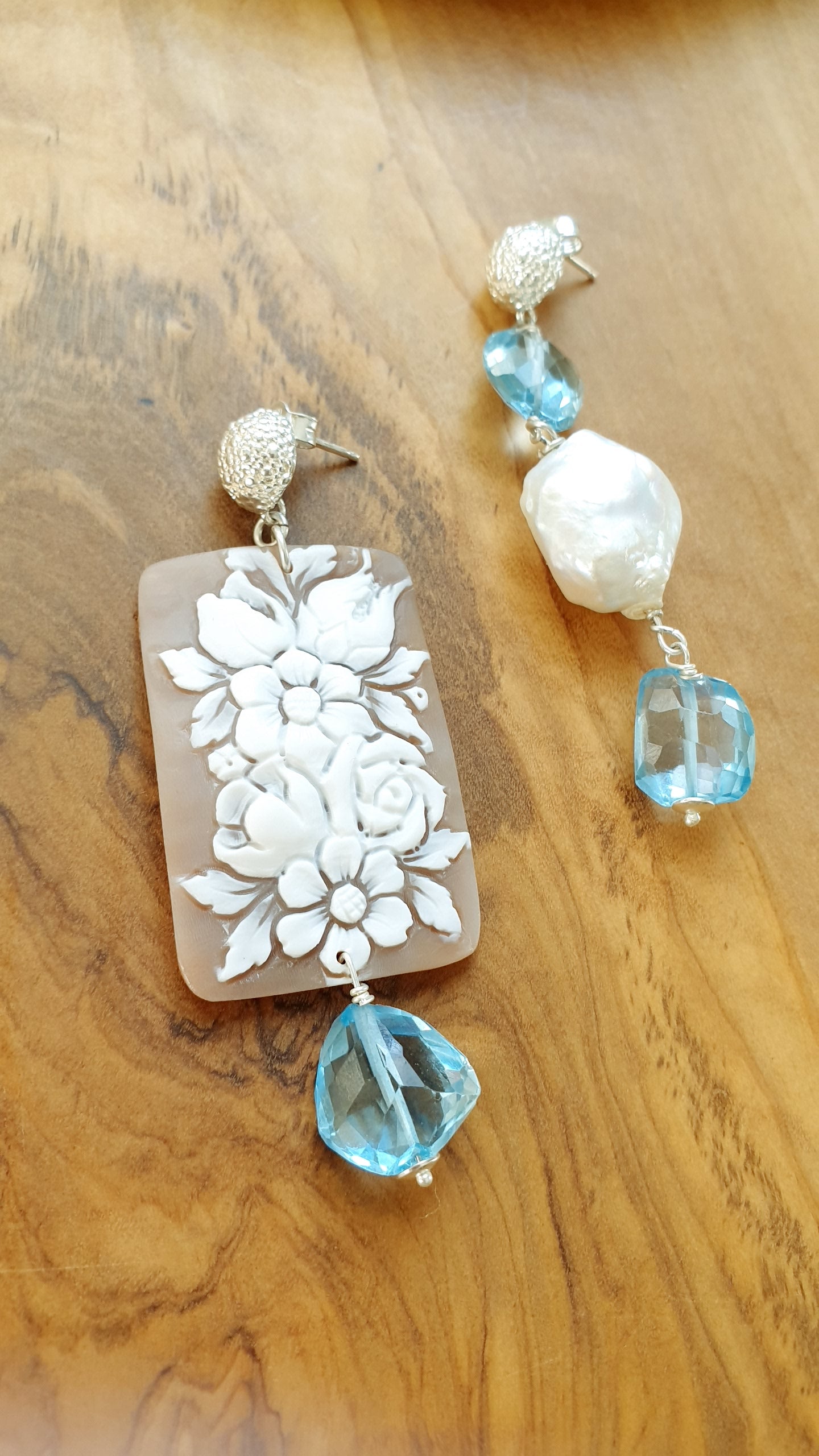 Grande cammeo floreale inciso su conchiglia da Maestro di Torre del Greco cm. 4 x 2.5, ossidiana azzurra tagliata a mano cm. 1.5, perla barocca cm. 2 x 1.5