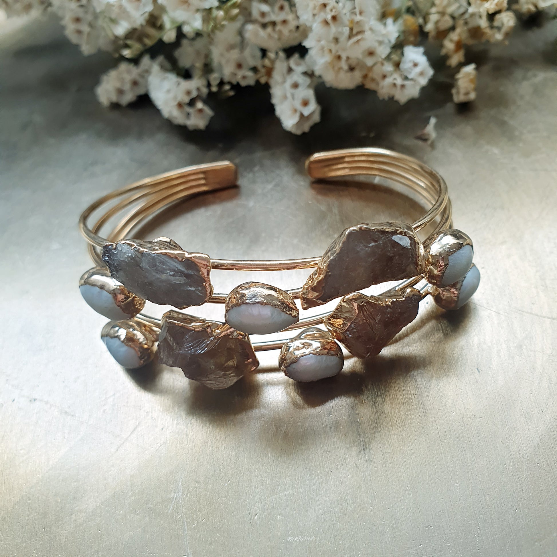Bracciale artigianale realizzato con 4 fili in ottone, perle di fiume e druse.