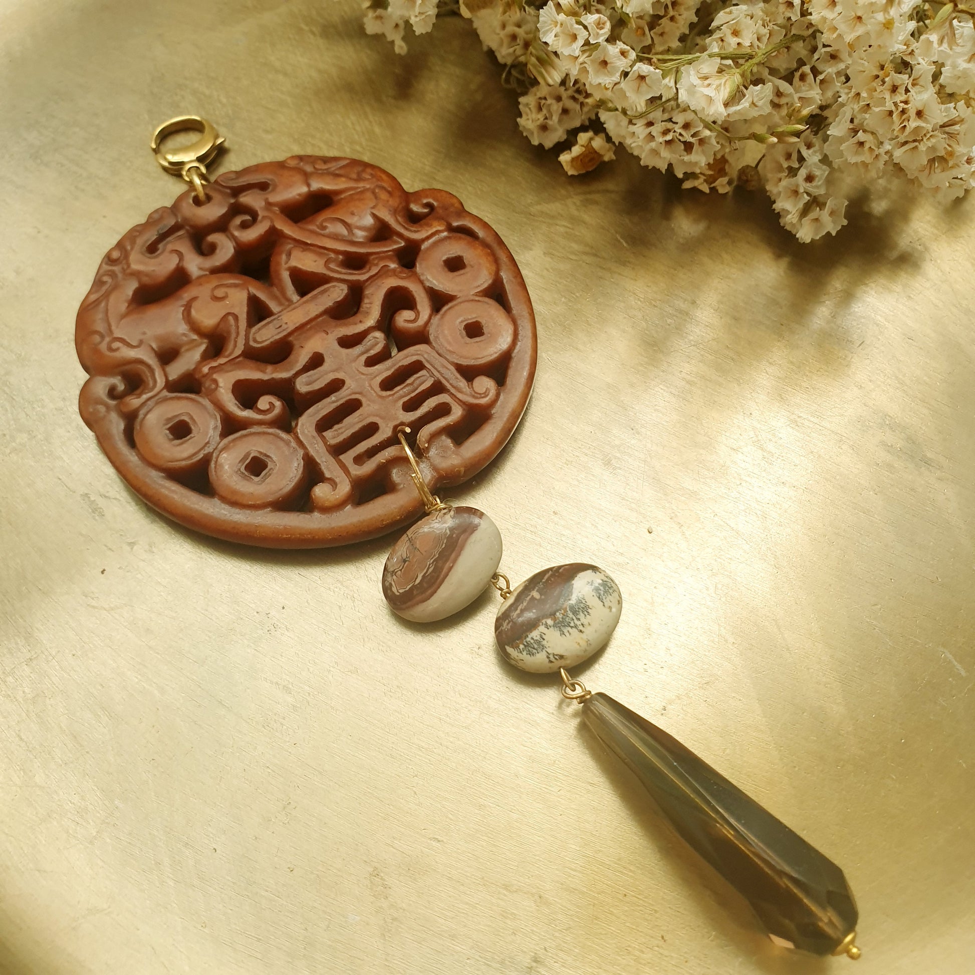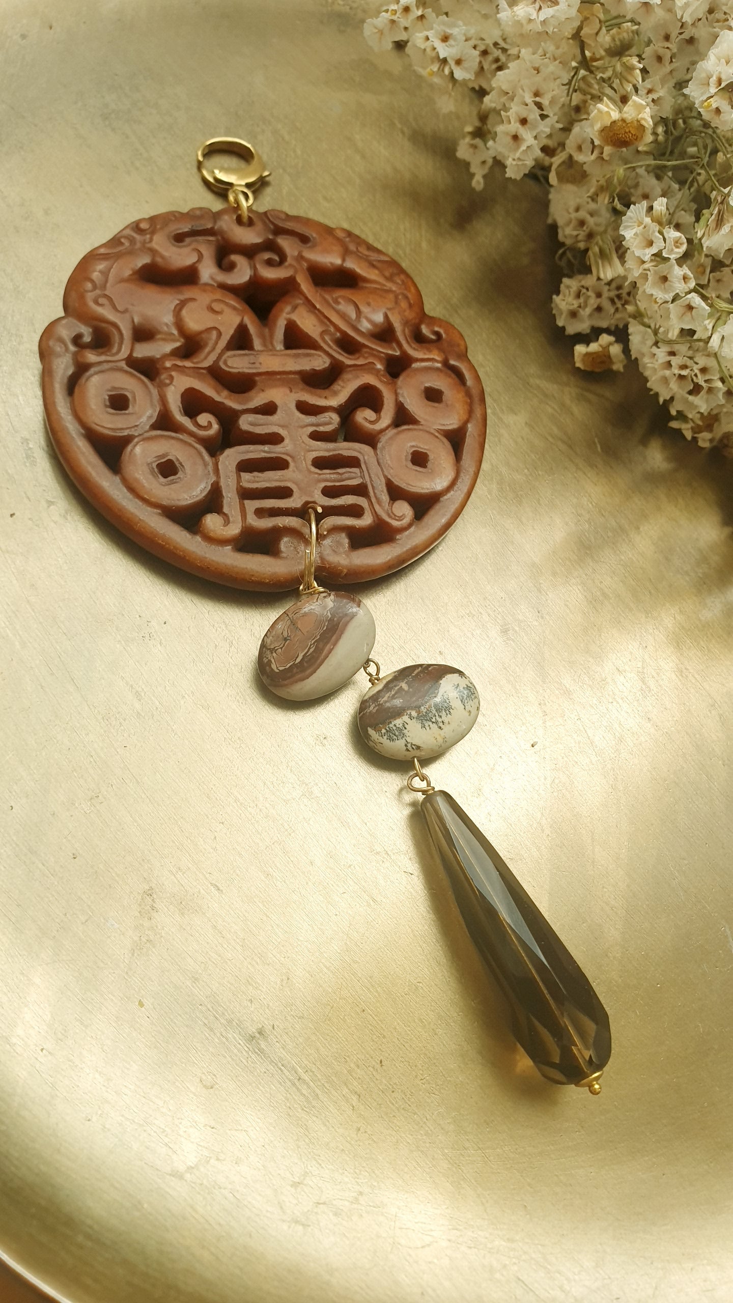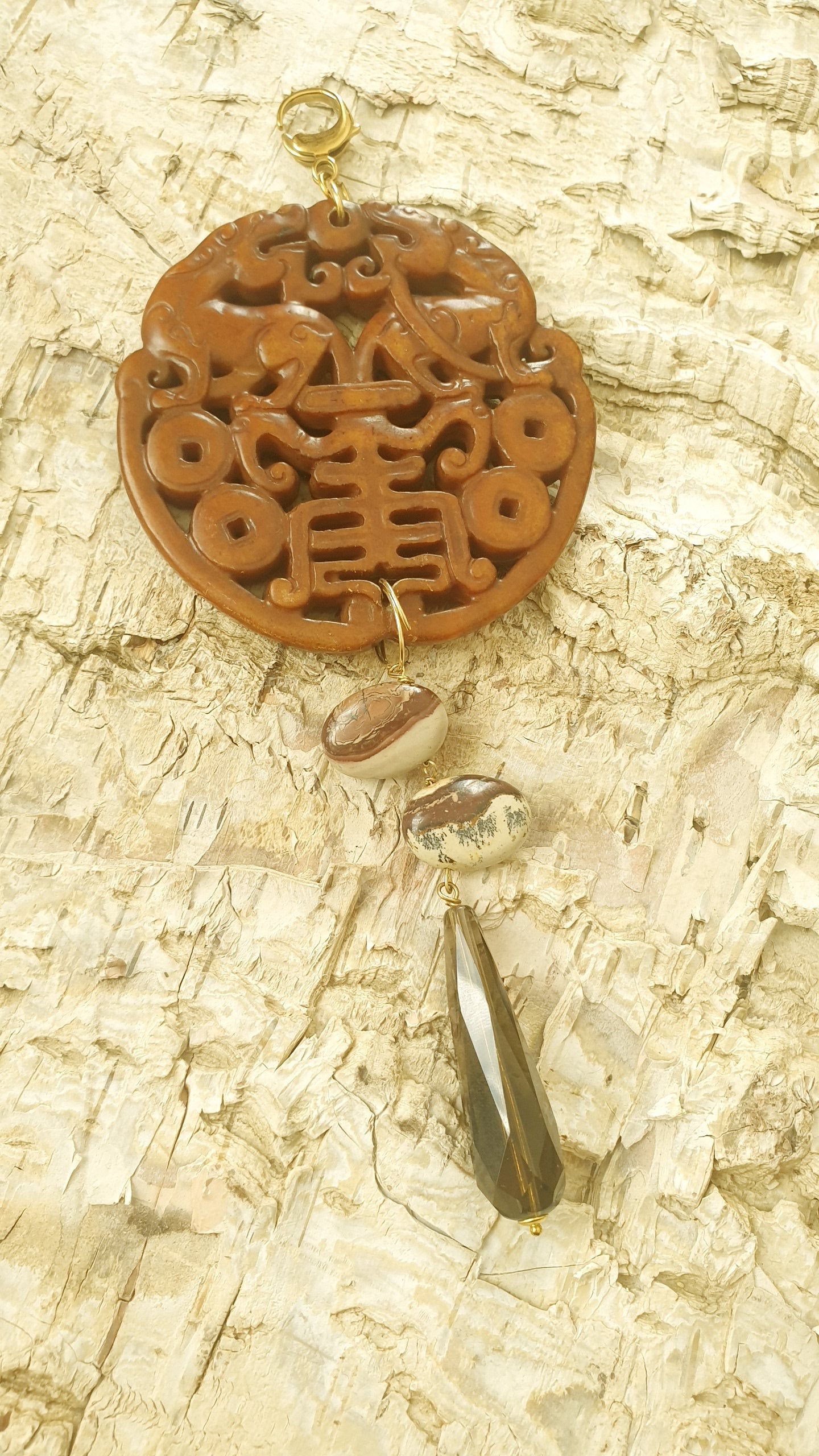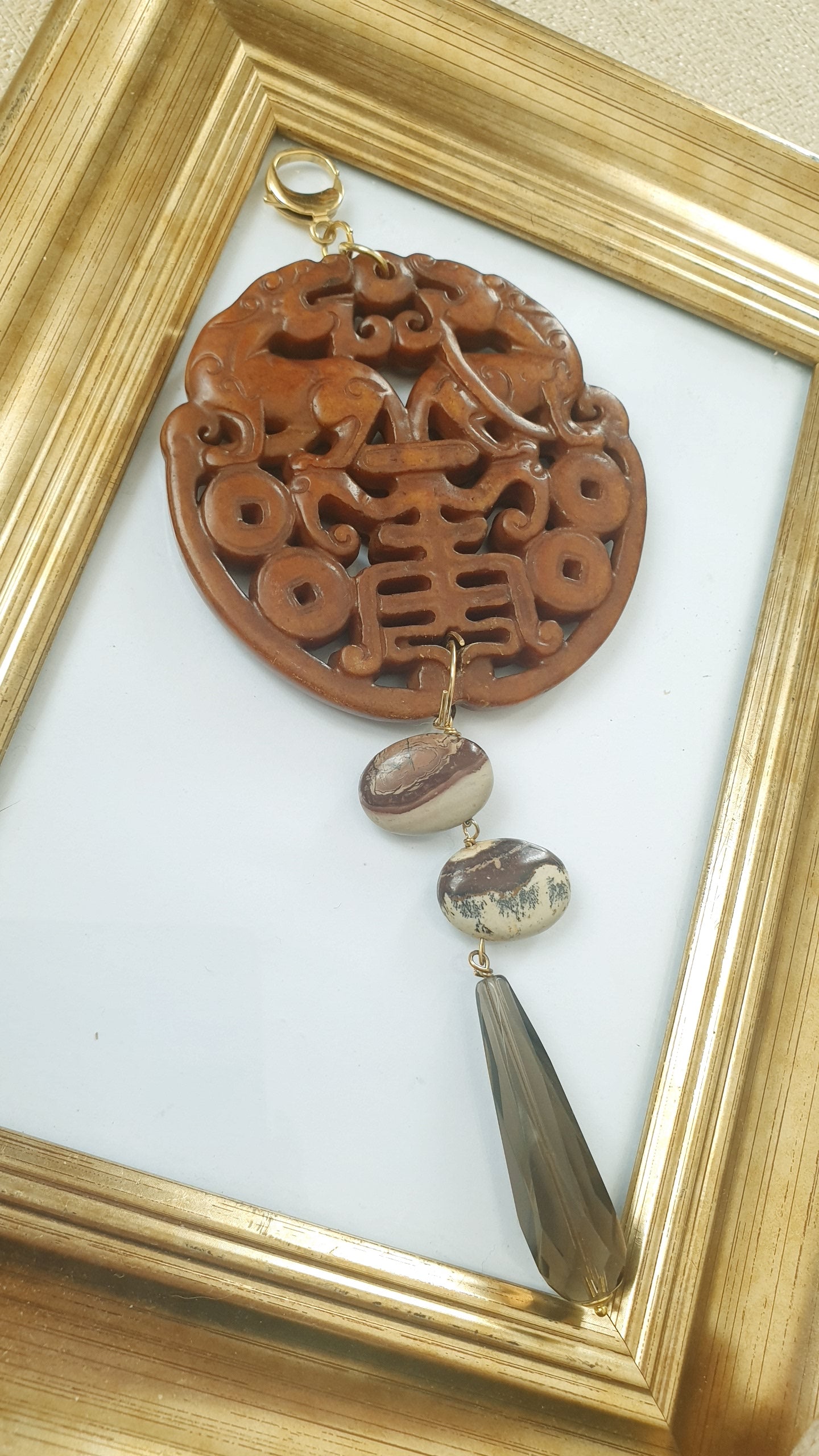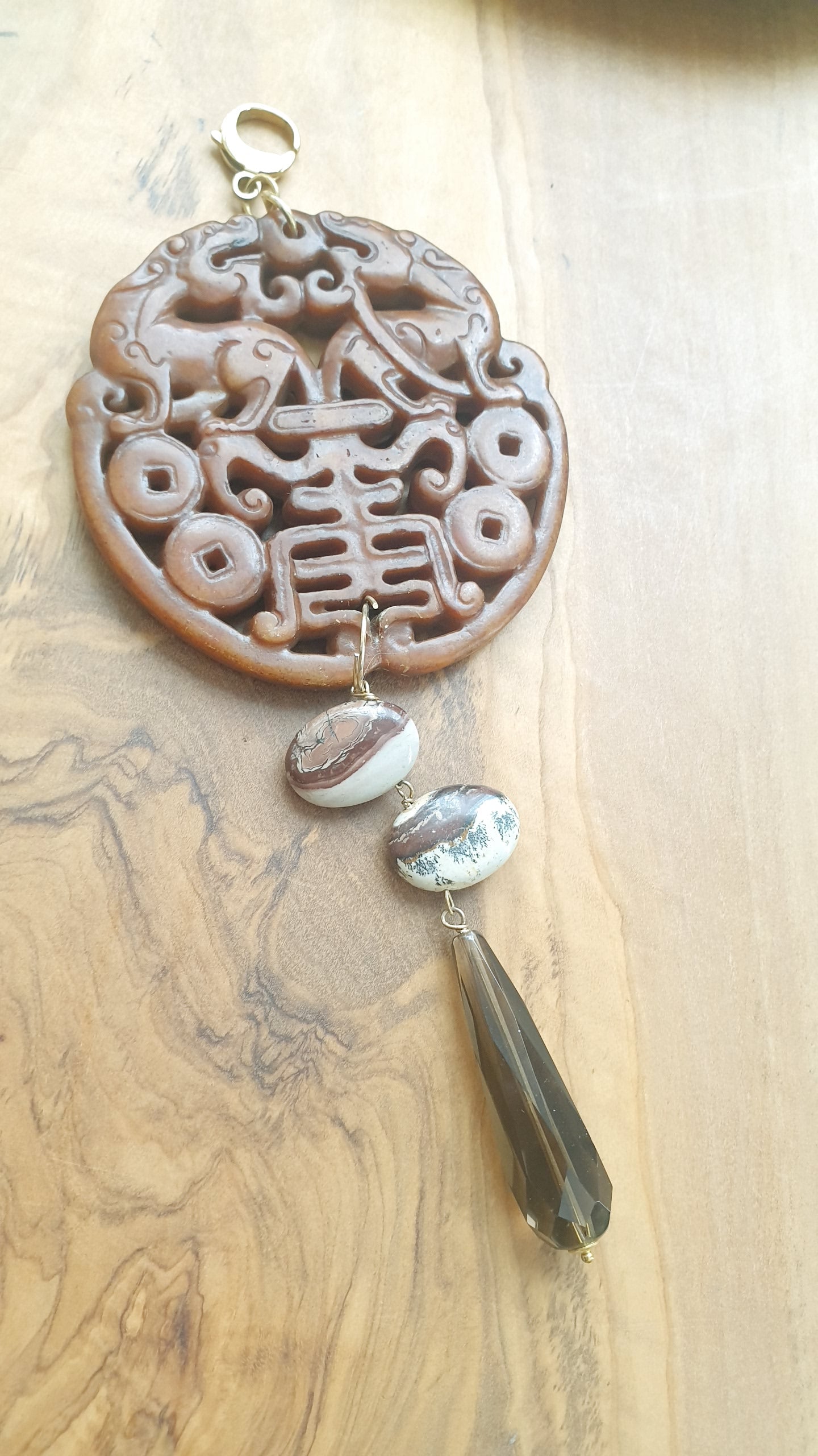 Ciondolo mala realizzato con giada intagliata cm. 7, agata e grande goccia in quarzo fumo cm. 4. gancio in acciaio.