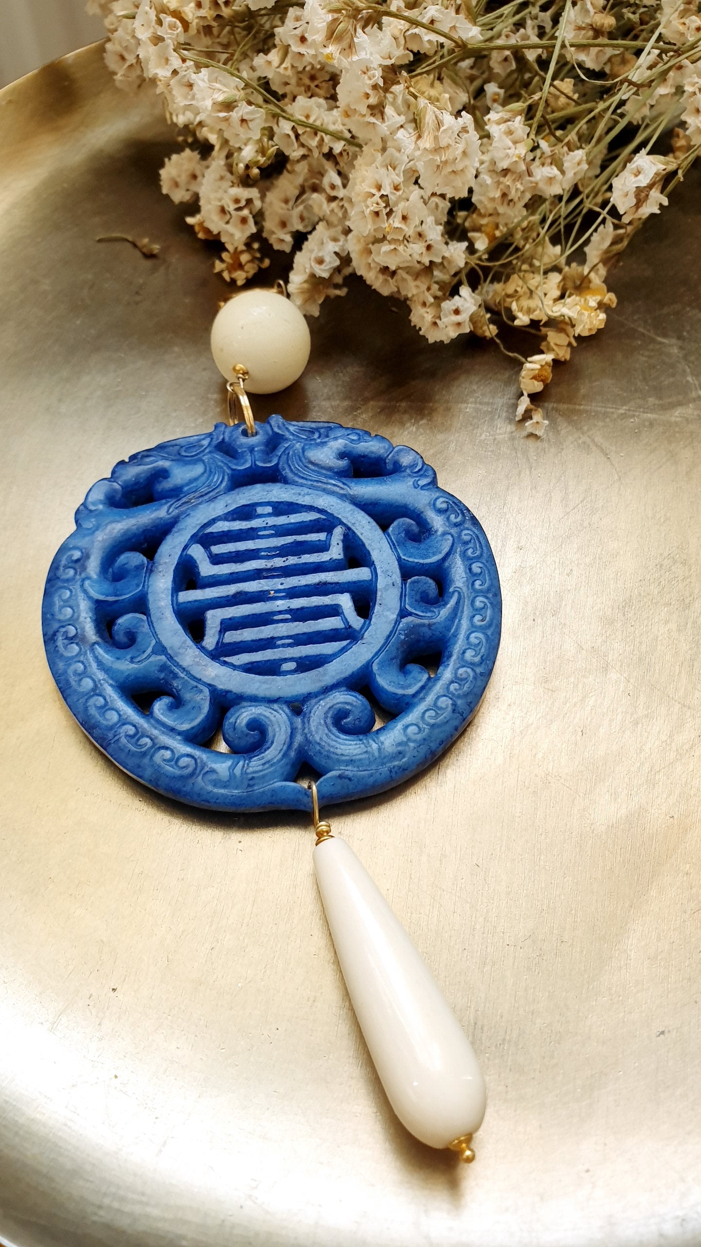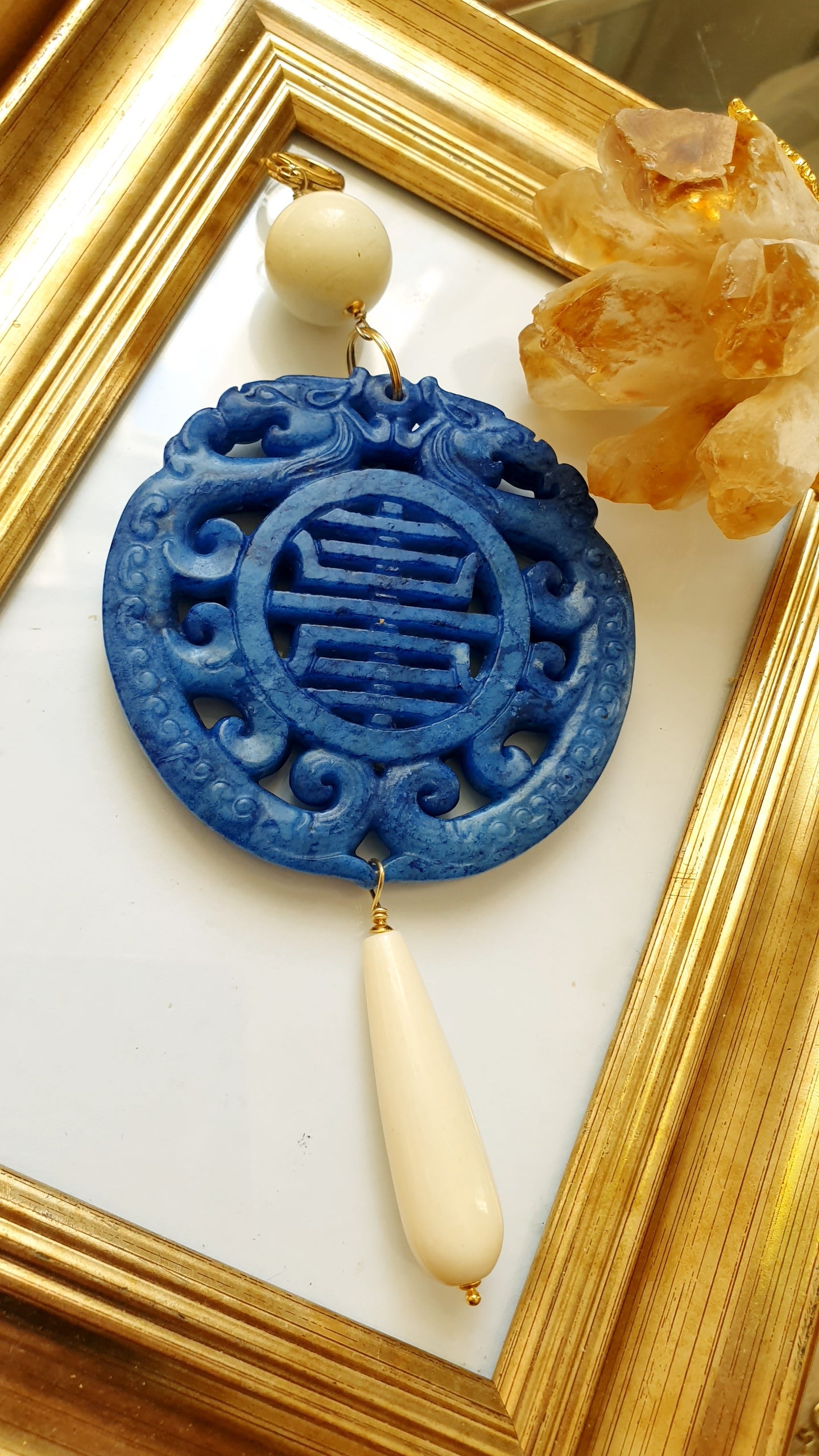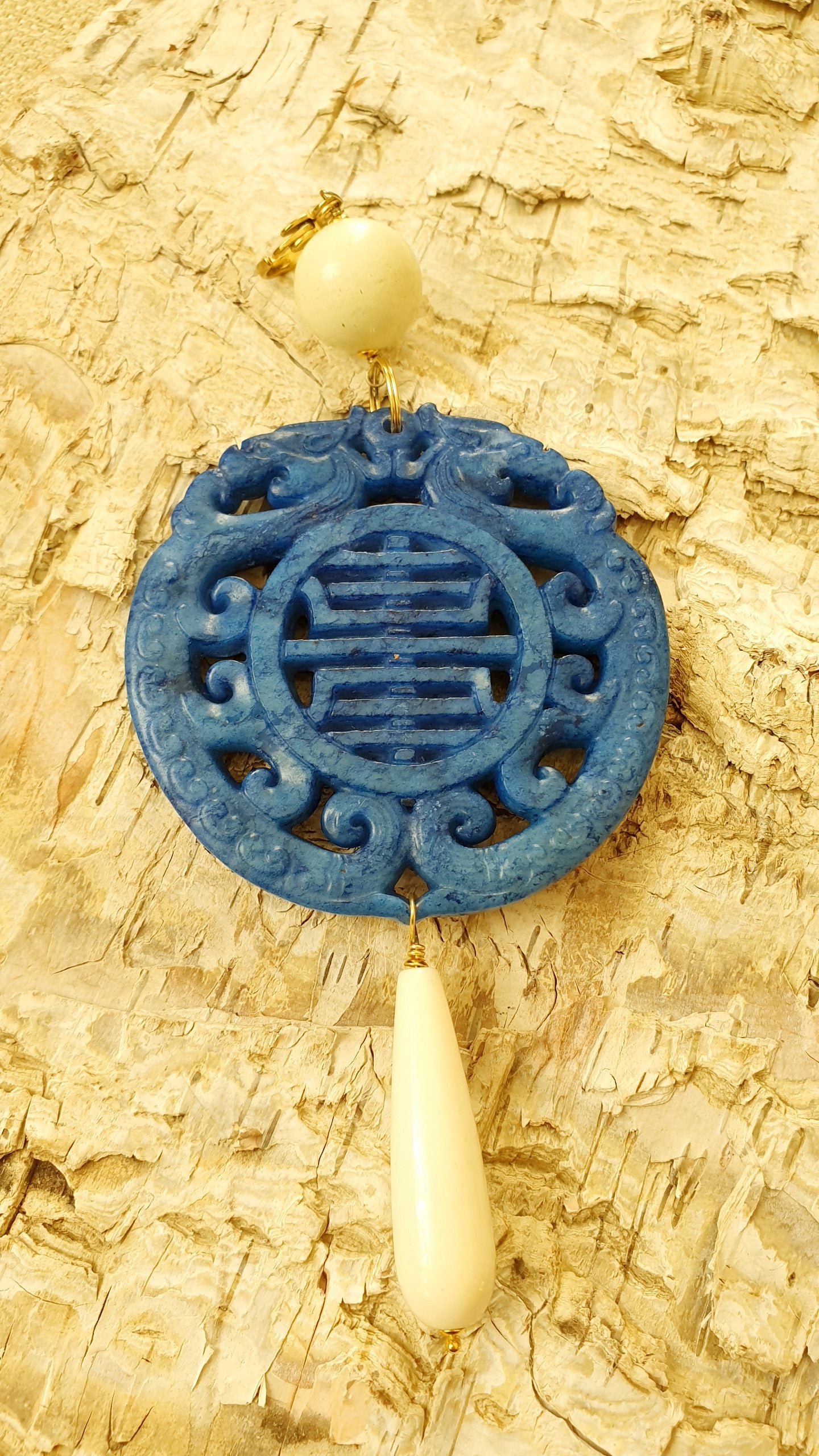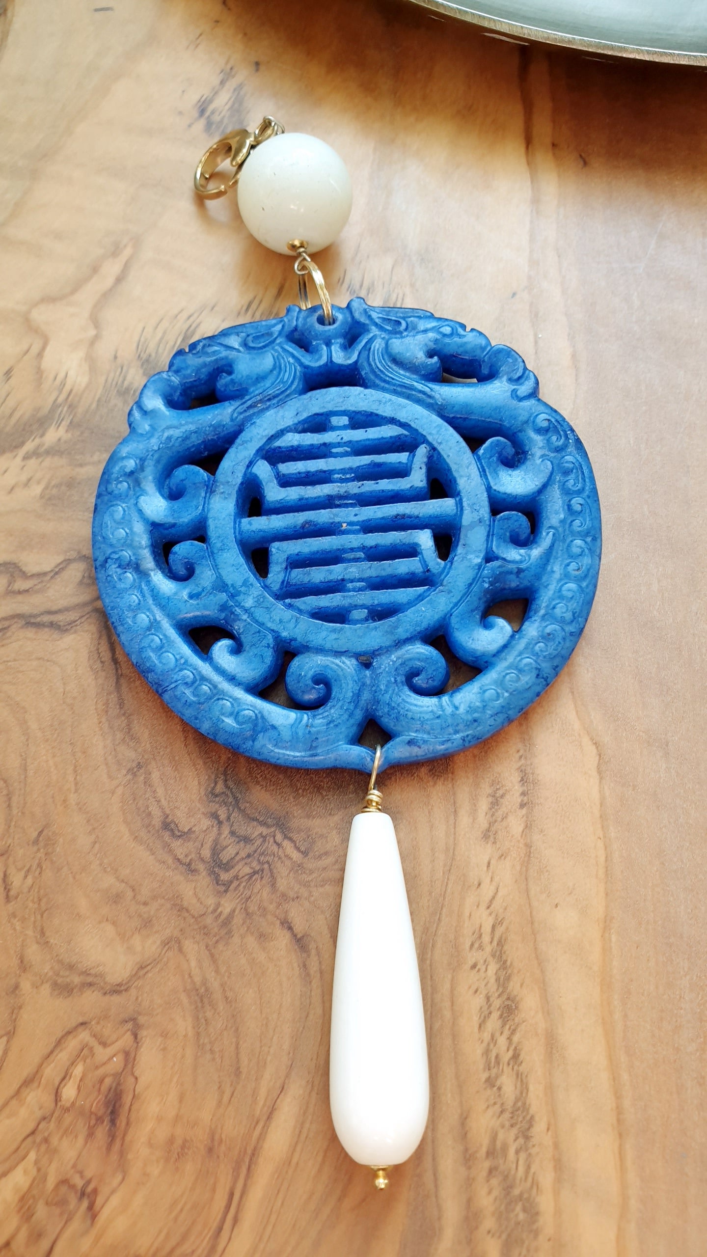 Grande giada intagliata blu cm. 7, sfera in agata bianca mm. 20, goccia in agata bianca cm. 4.5.