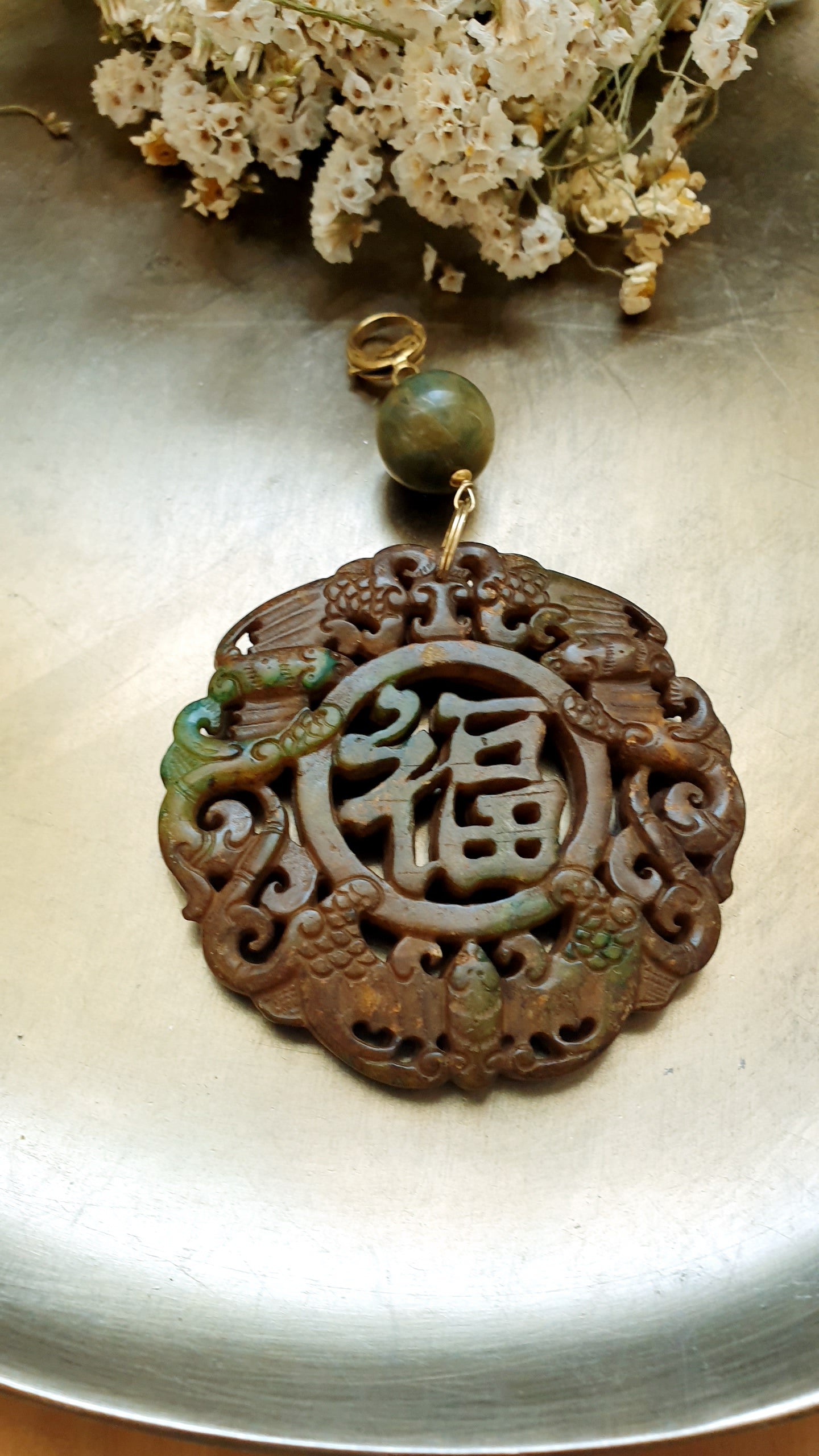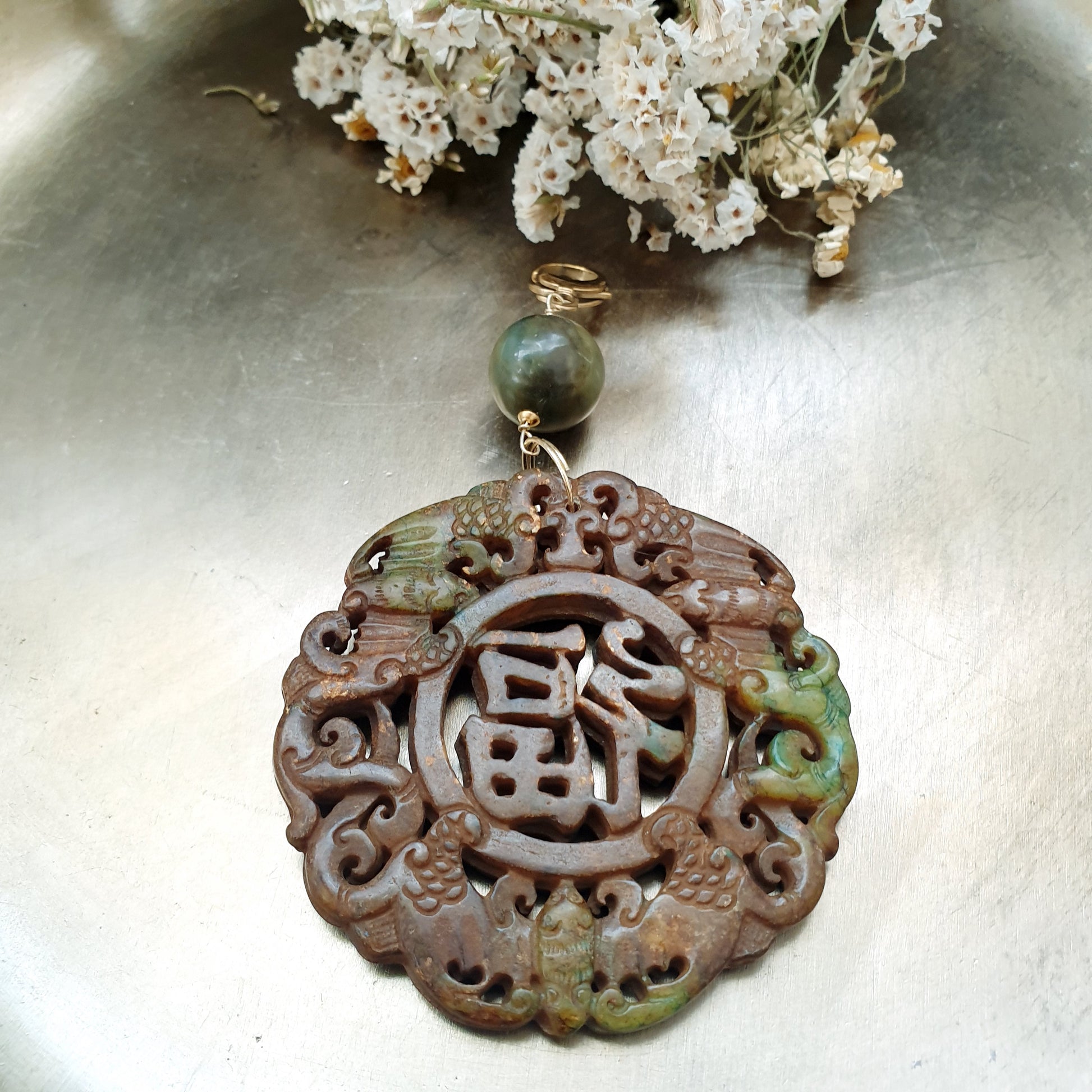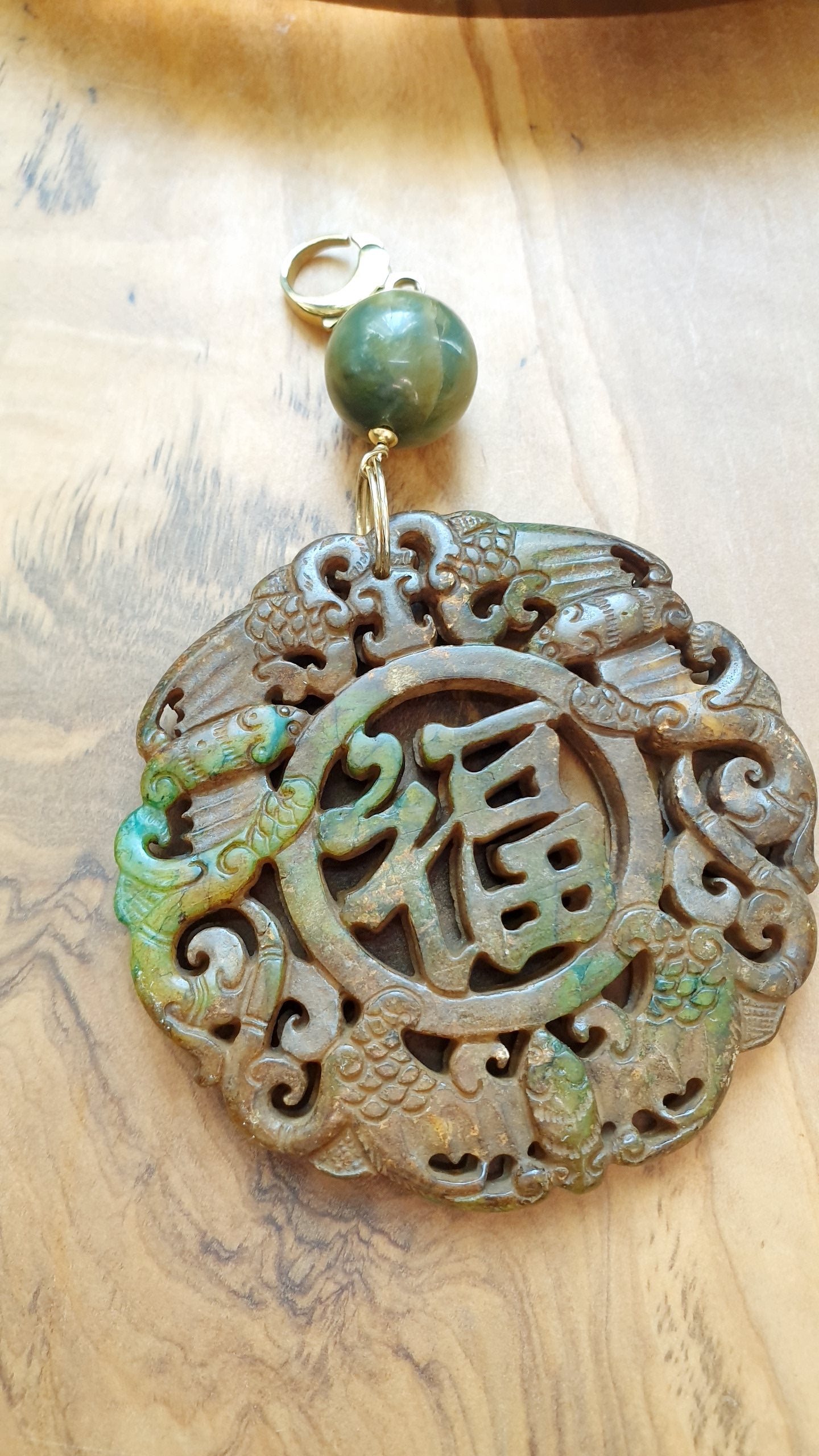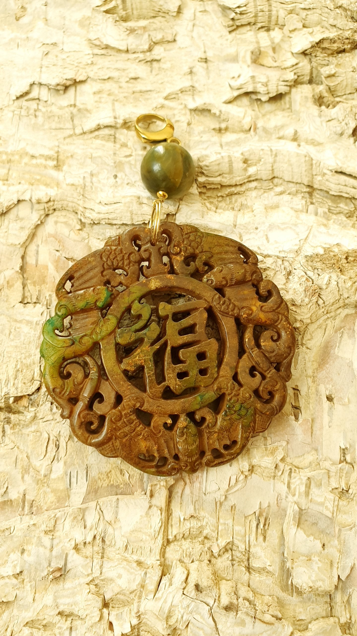 Grande giada intagliata verde/marrone cm. 7, sfera in labradorite mm. 18.