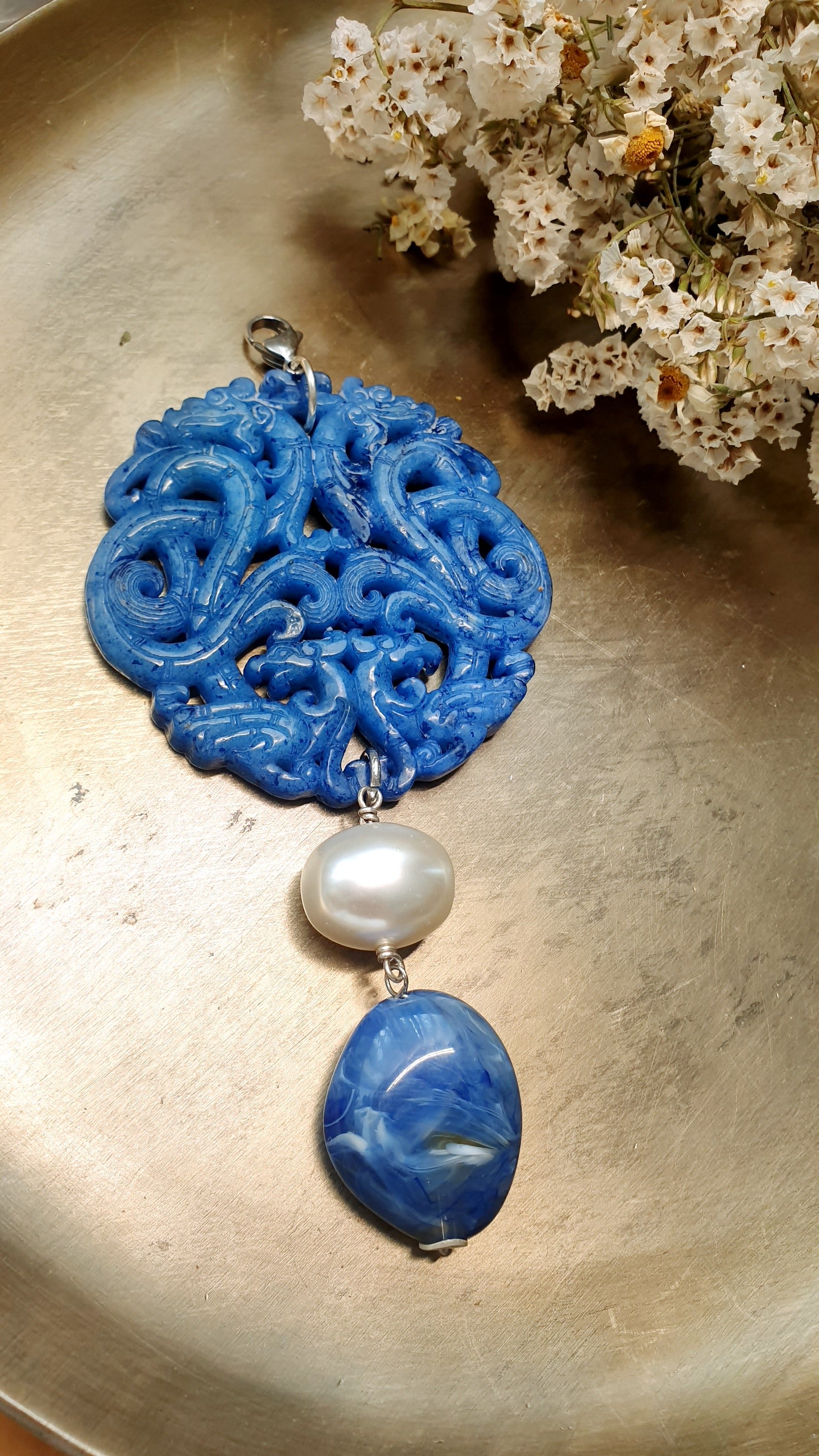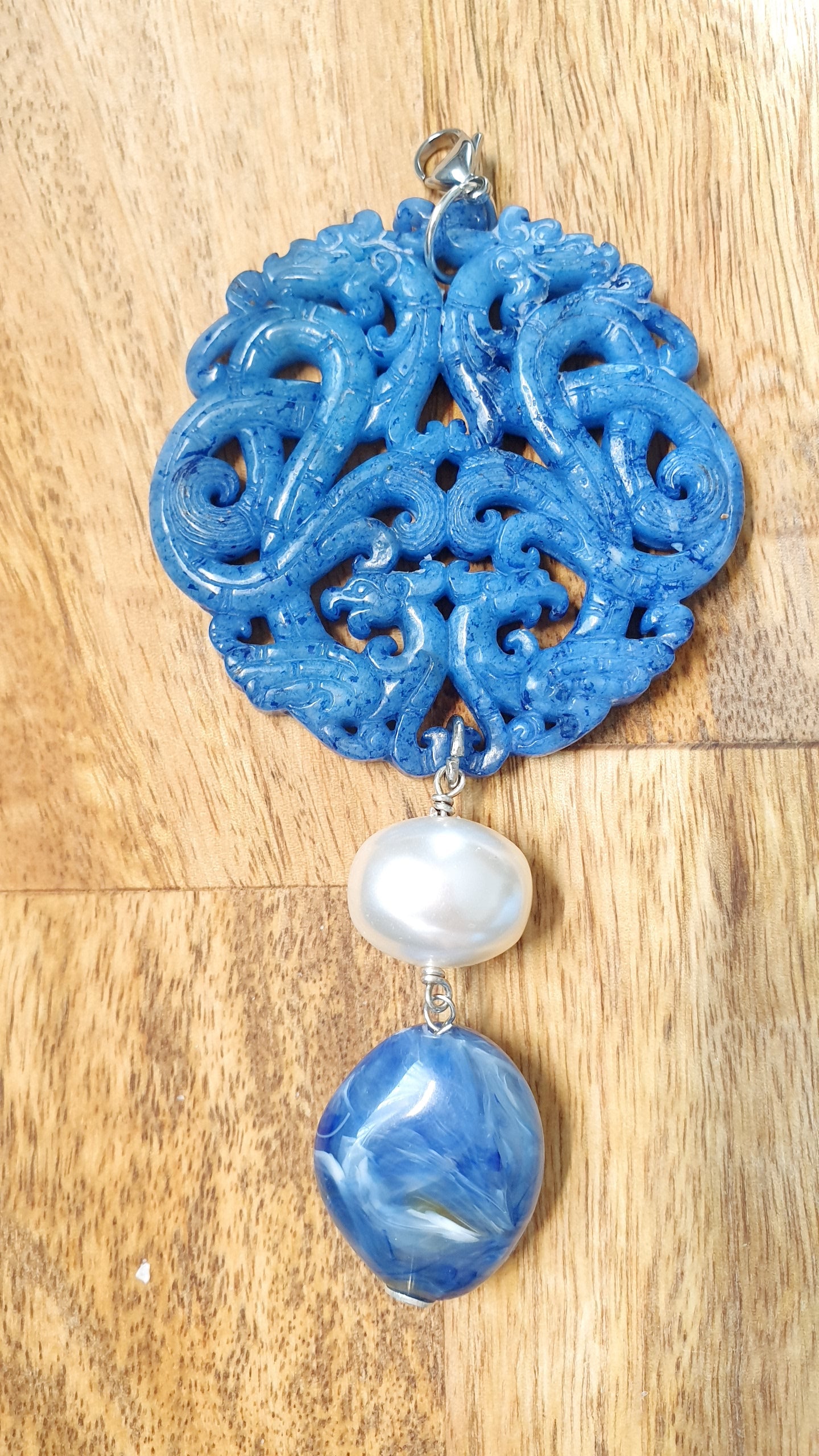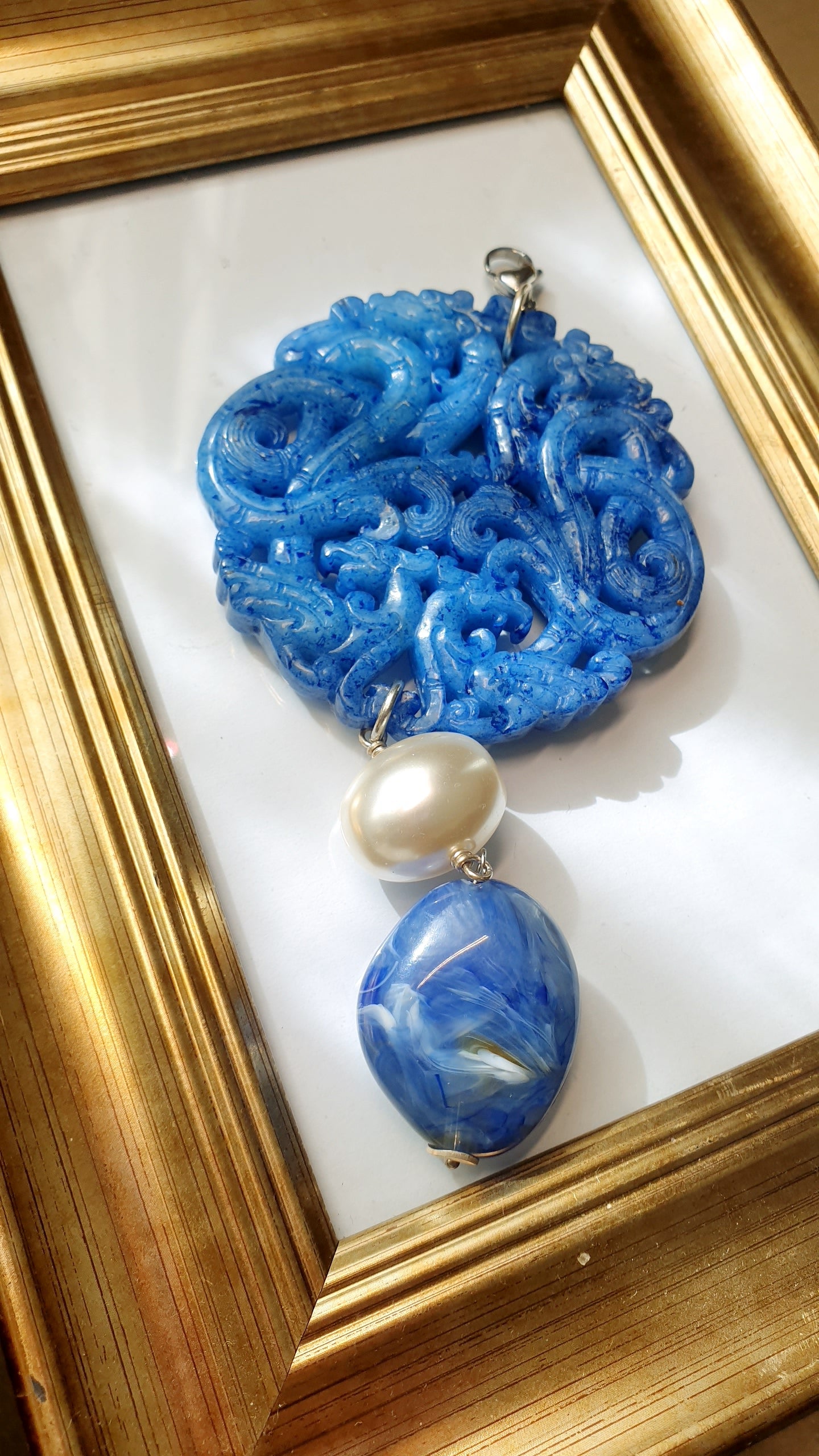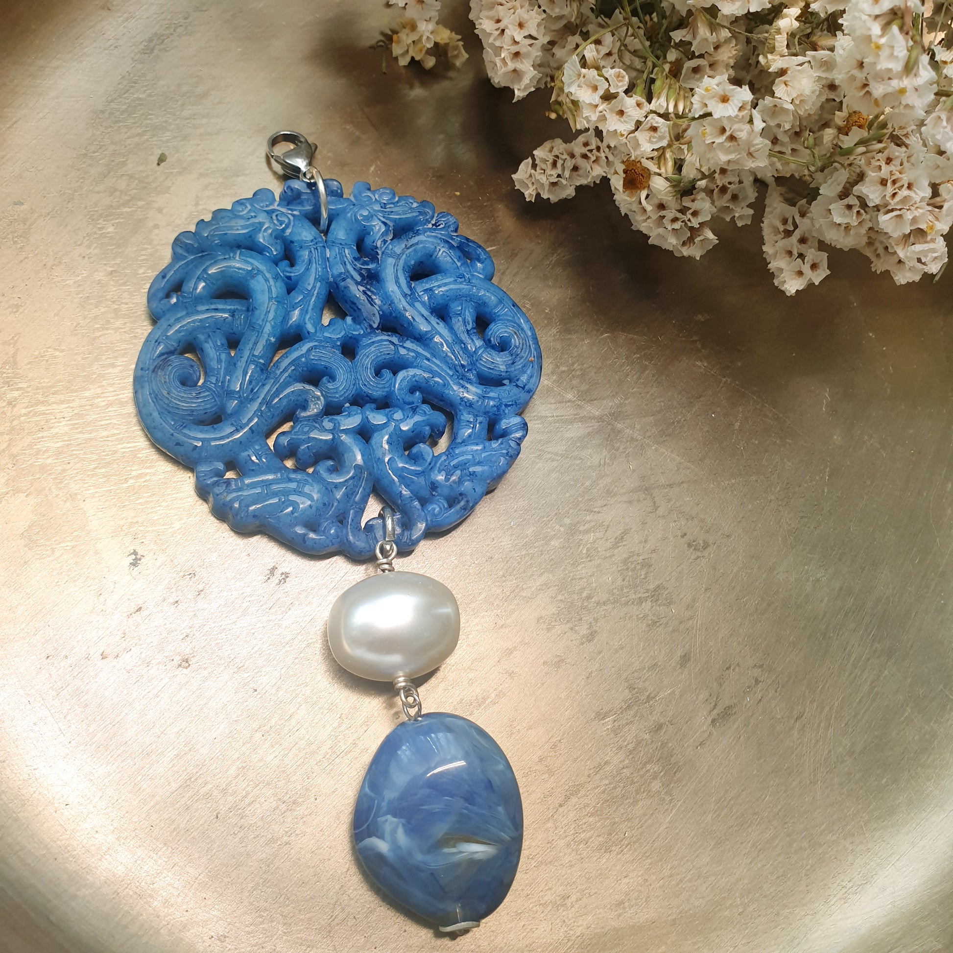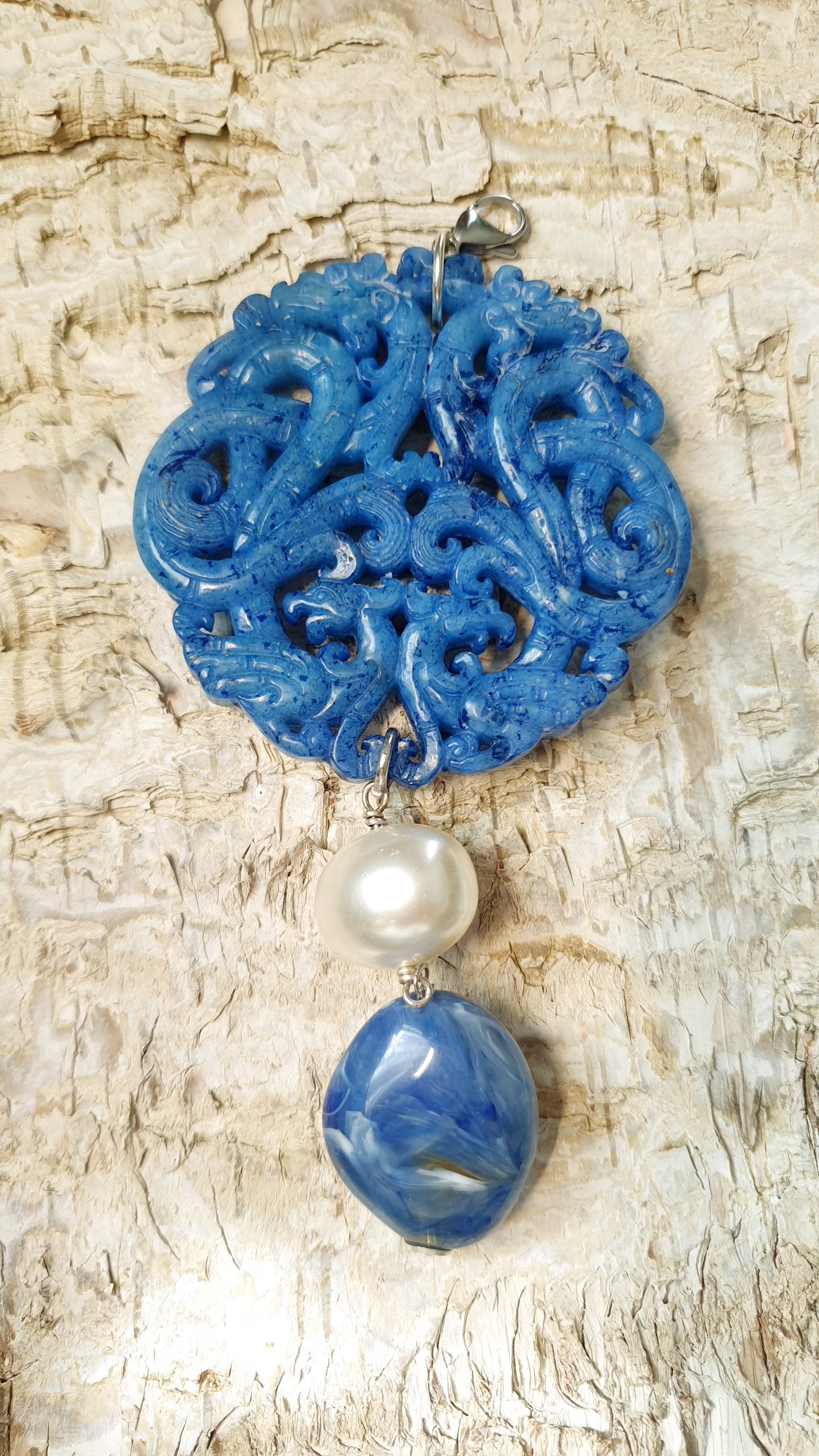 Grande guada blu intagliata cm. 7, pendente in resina blu cm. 3 x 2.5, perla di Maiorca mm. 14.