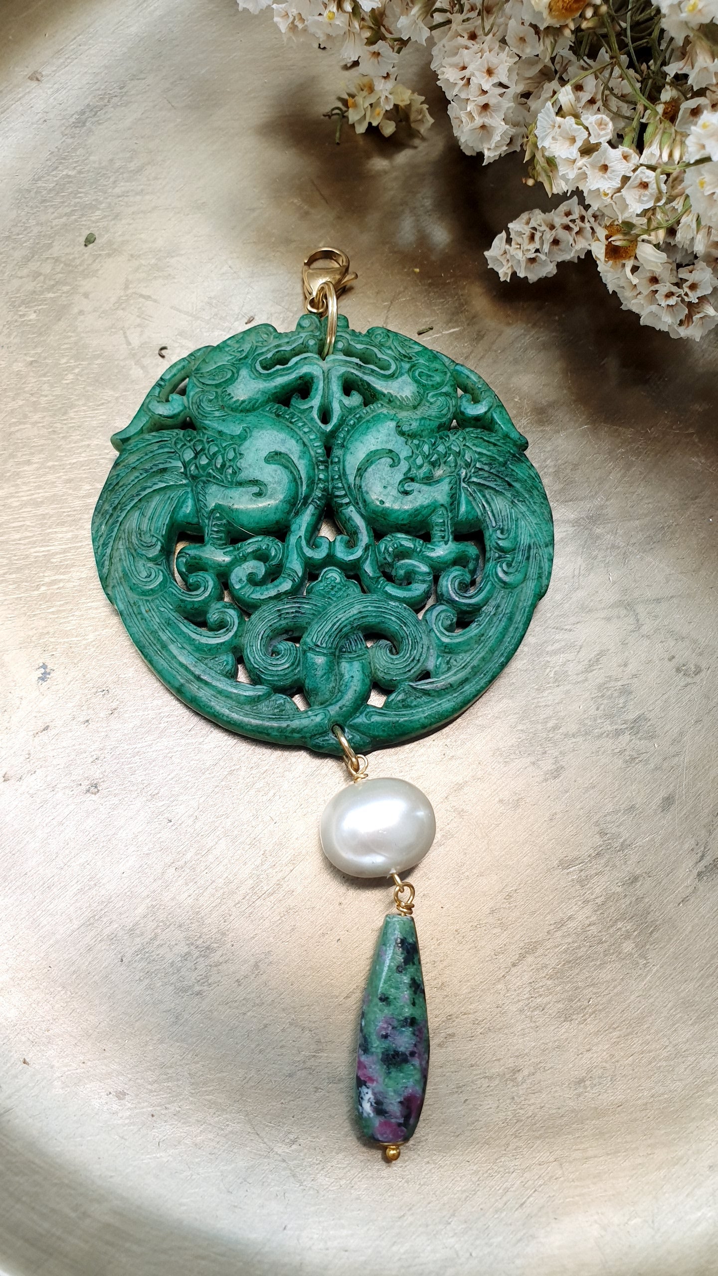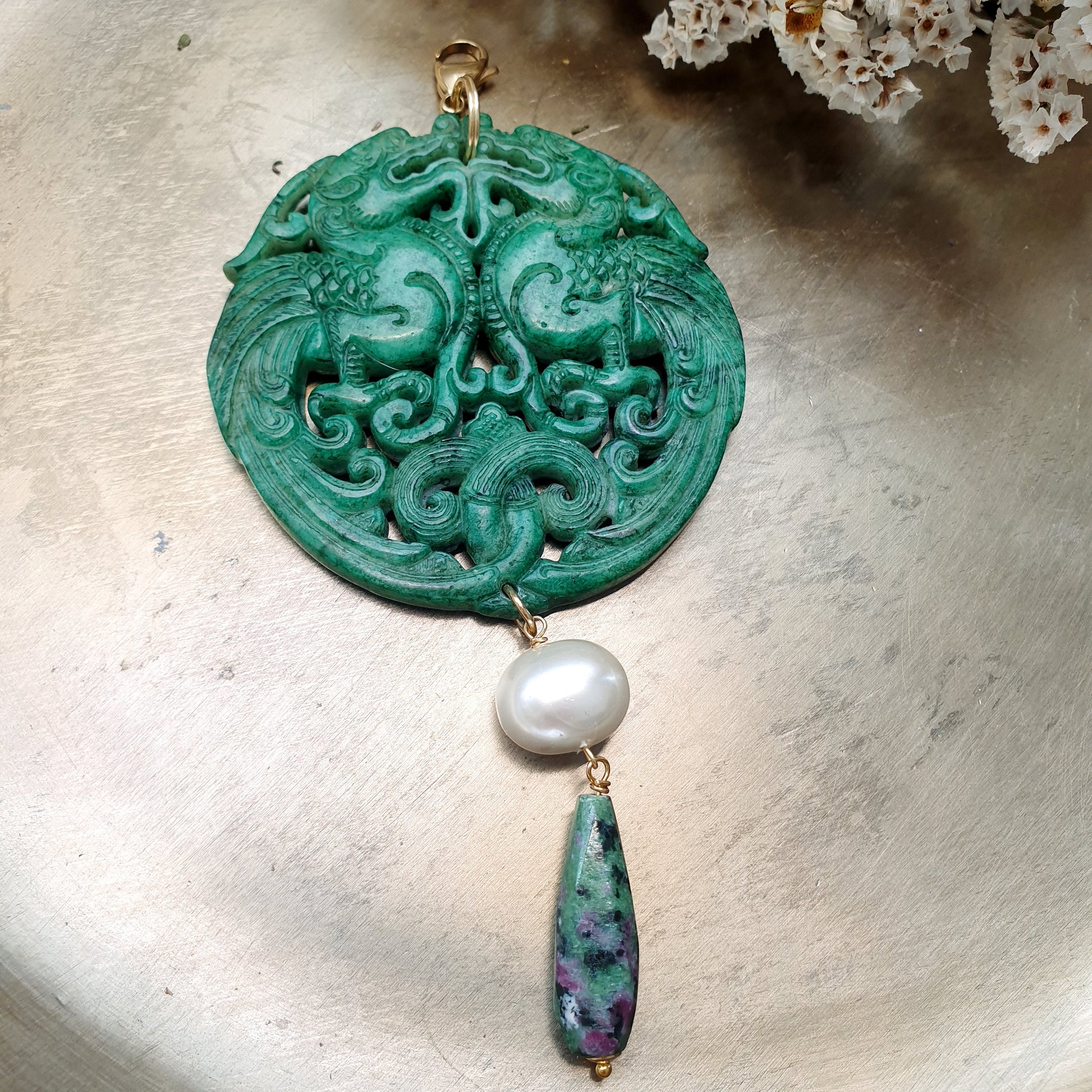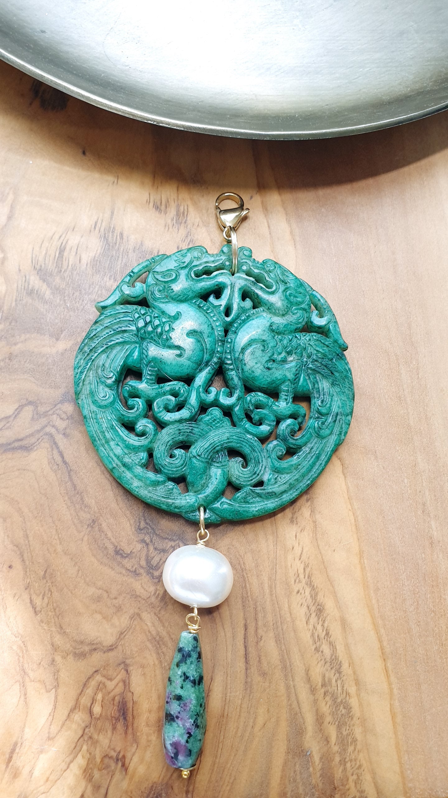 Grande giada verde intagliata cm. 7, goccia in rubizoisite cm. 3, perla di Maiorca mm. 14.