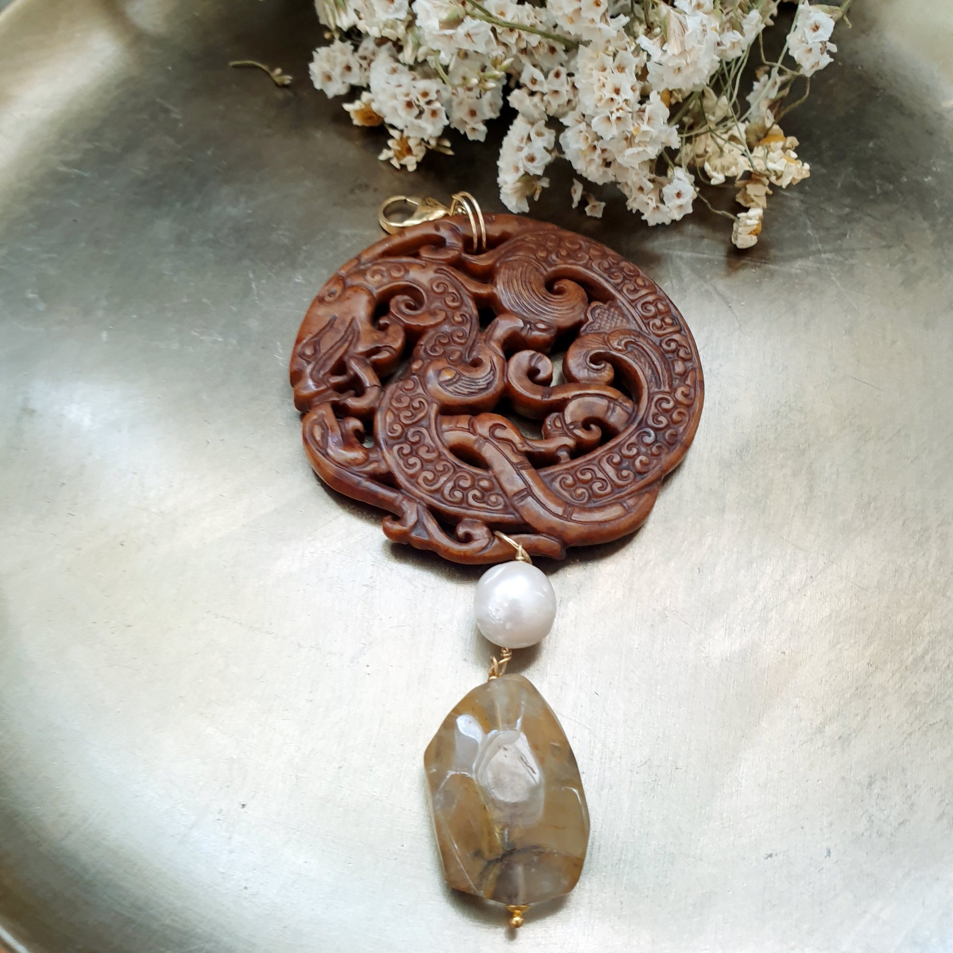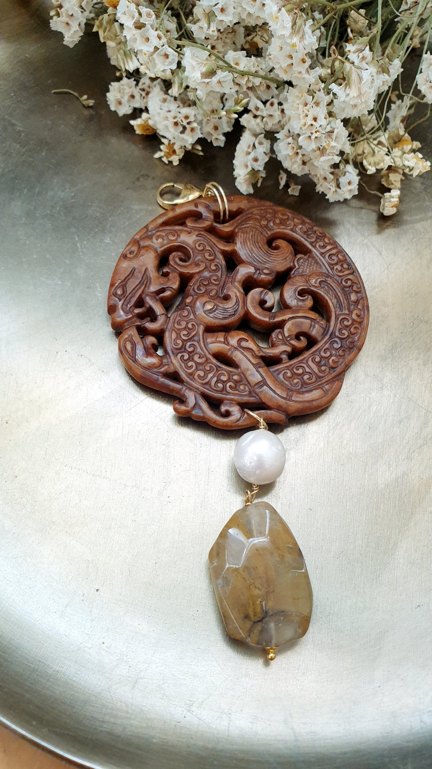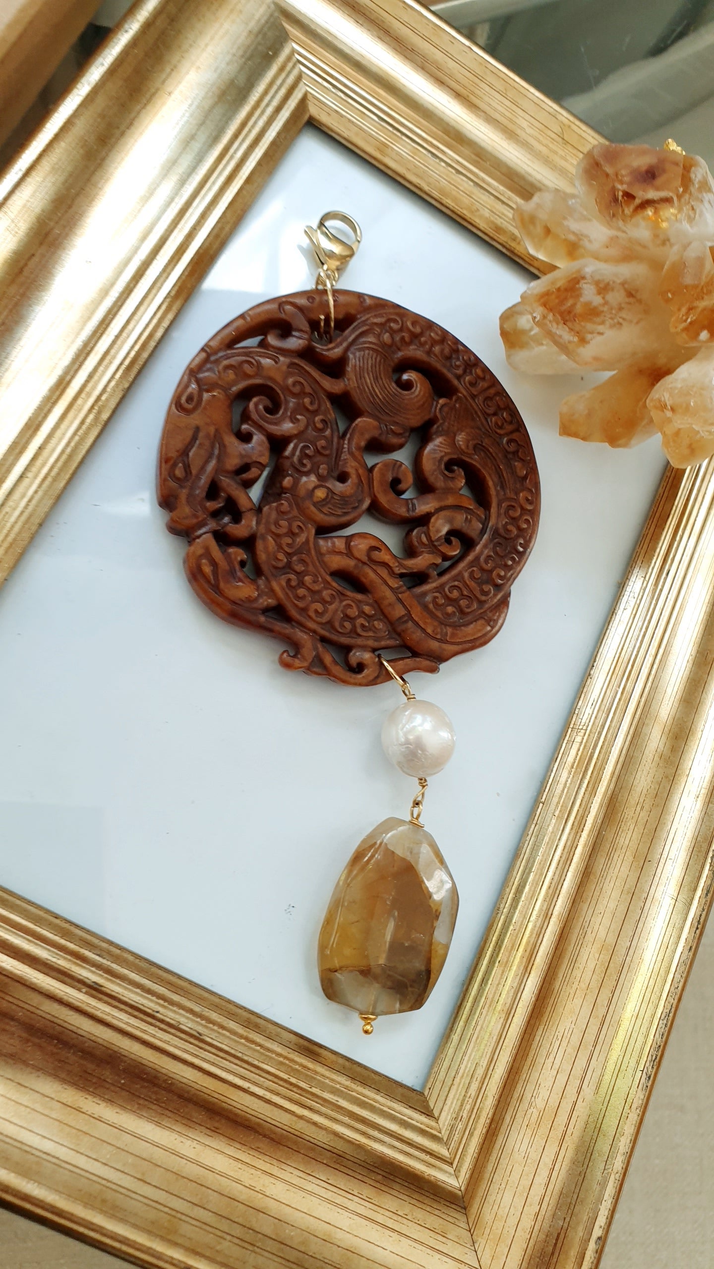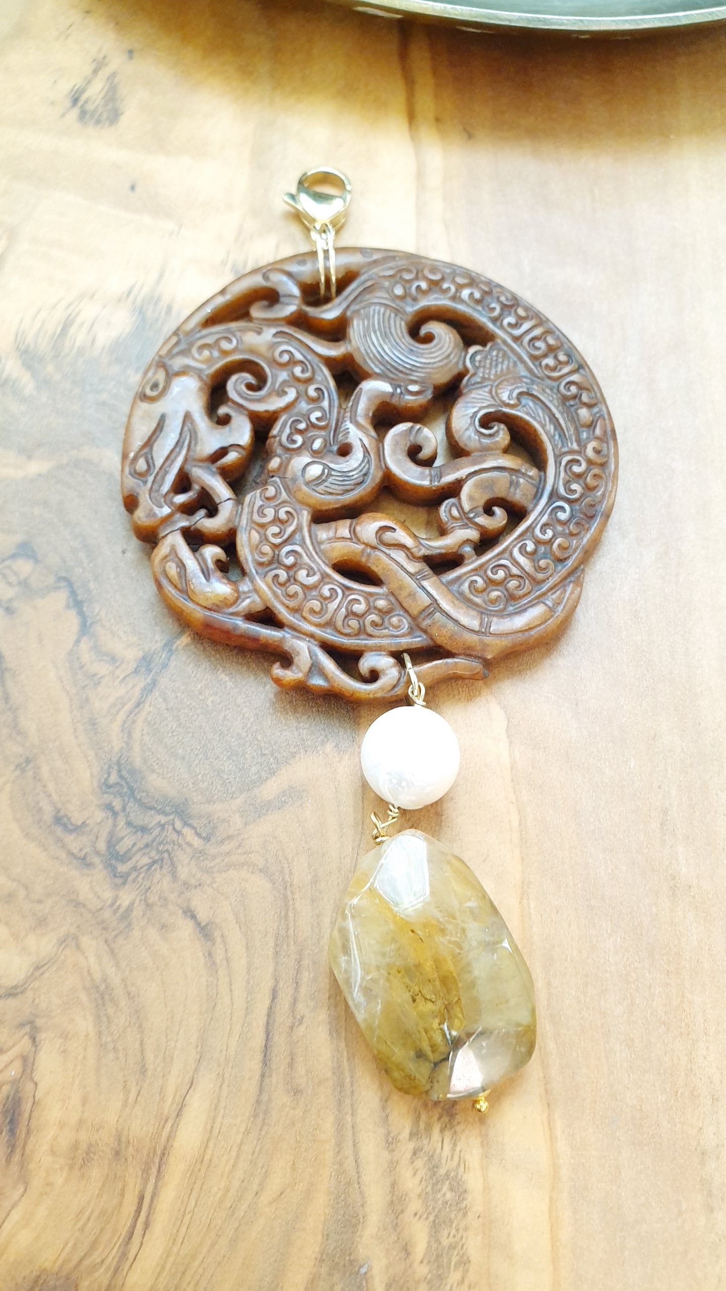 Grande giada intagliata marrone cm. 7, perla barocca mm. 15, quarzo citrino cm. 3 x 2