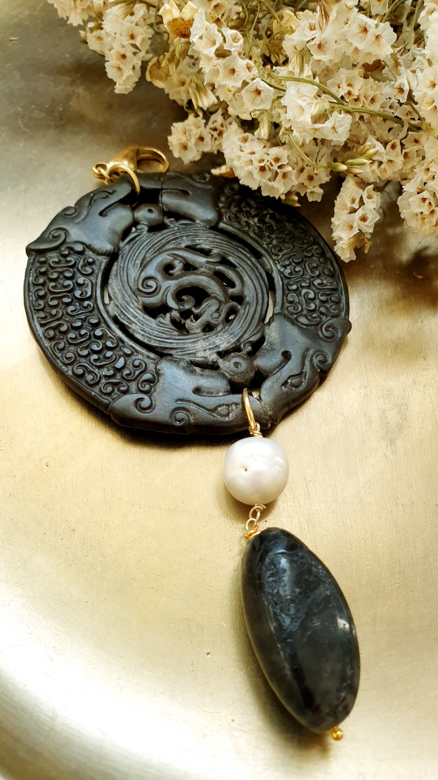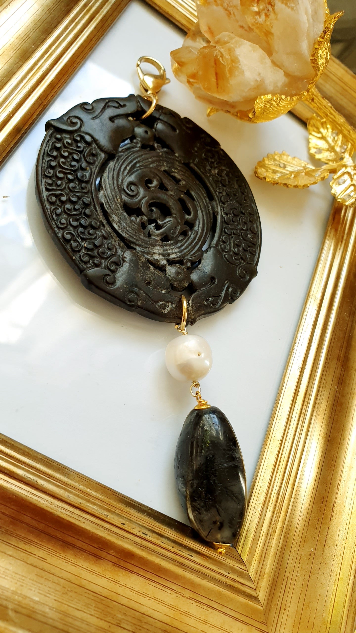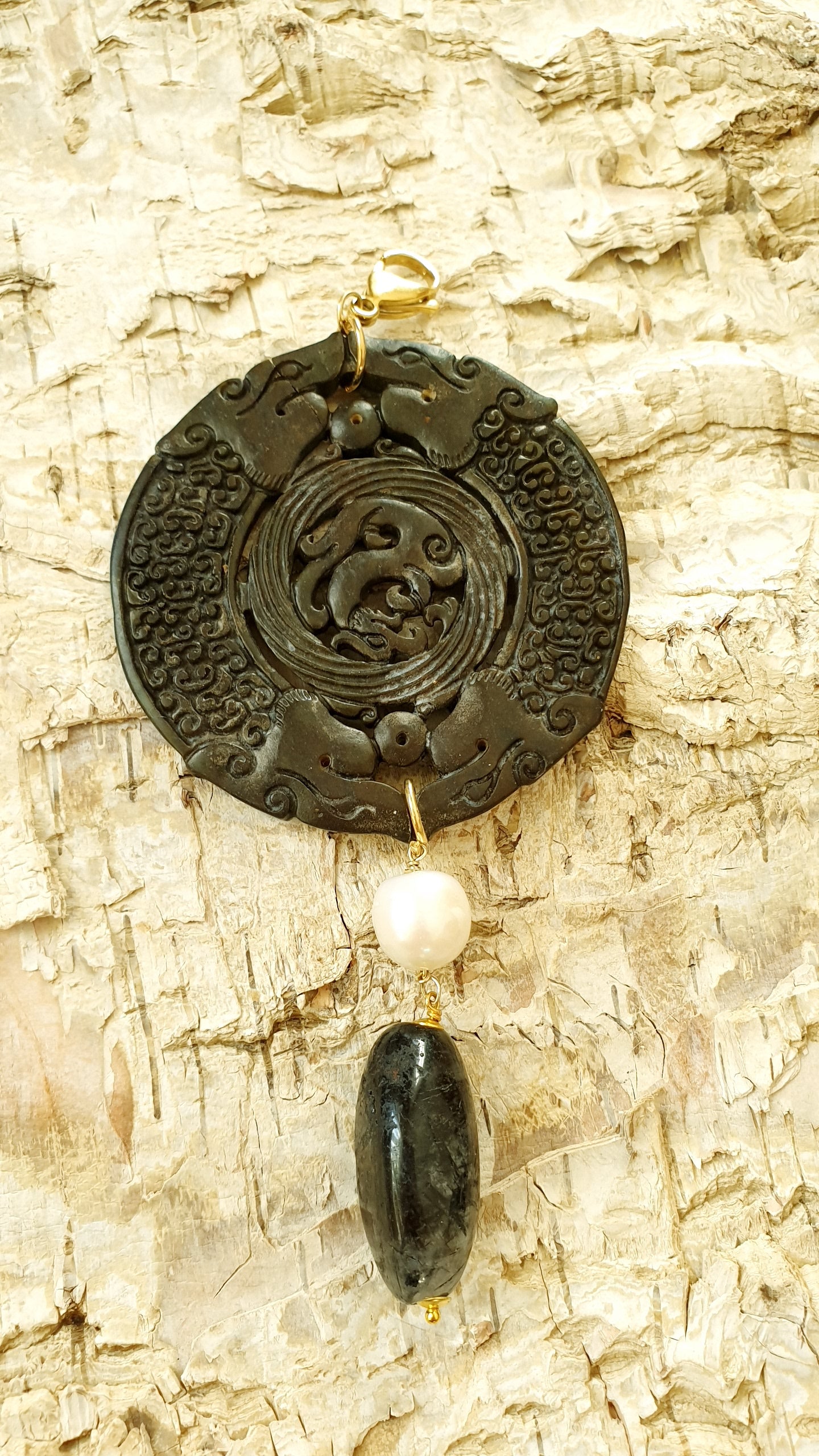 Grande giada intagliata nera cm. 7, perla barocca mm. 10, quarzo tormalinato cm. 4