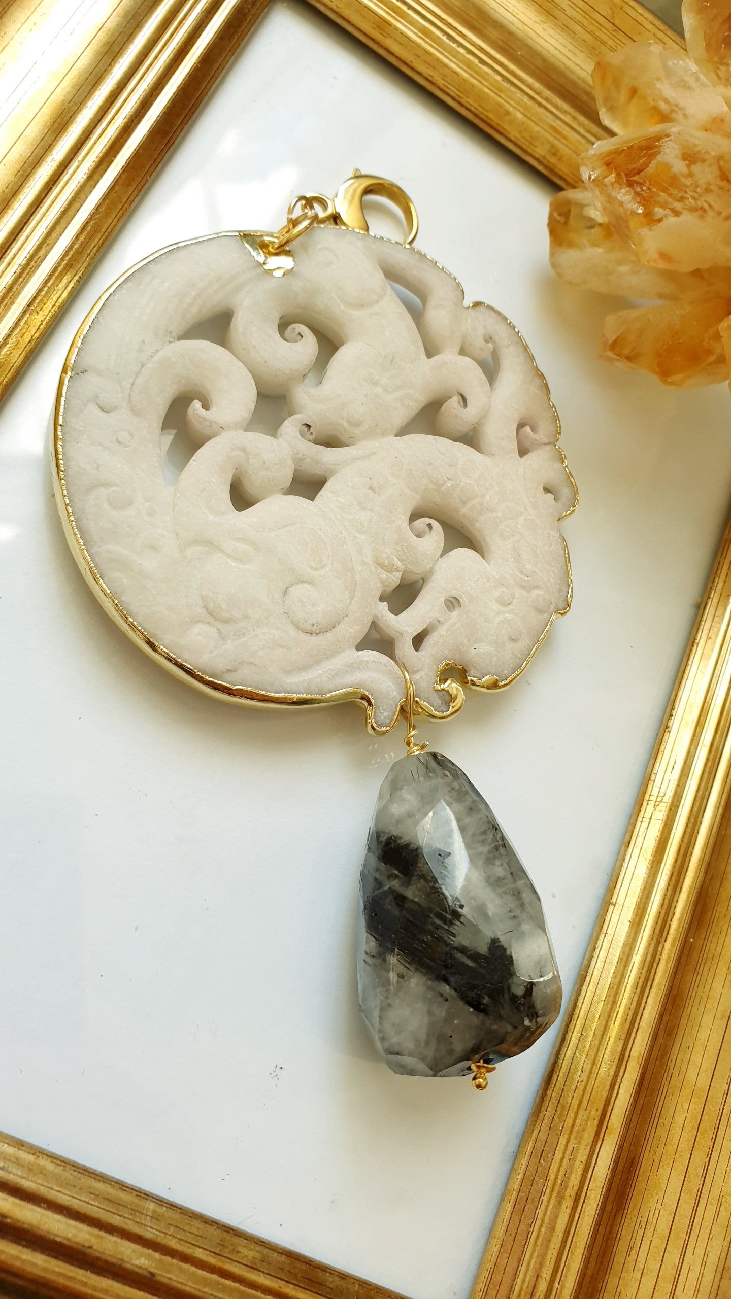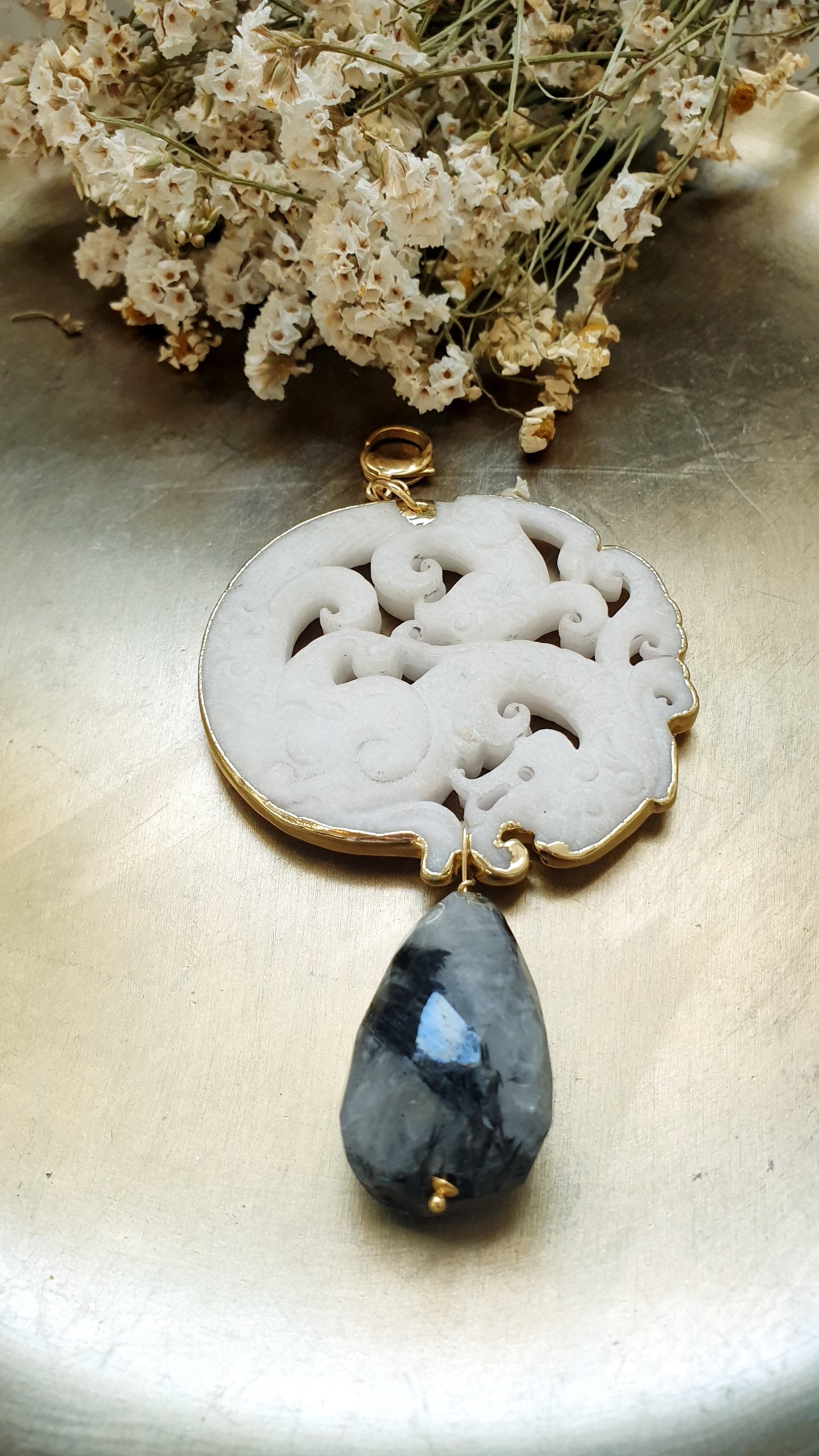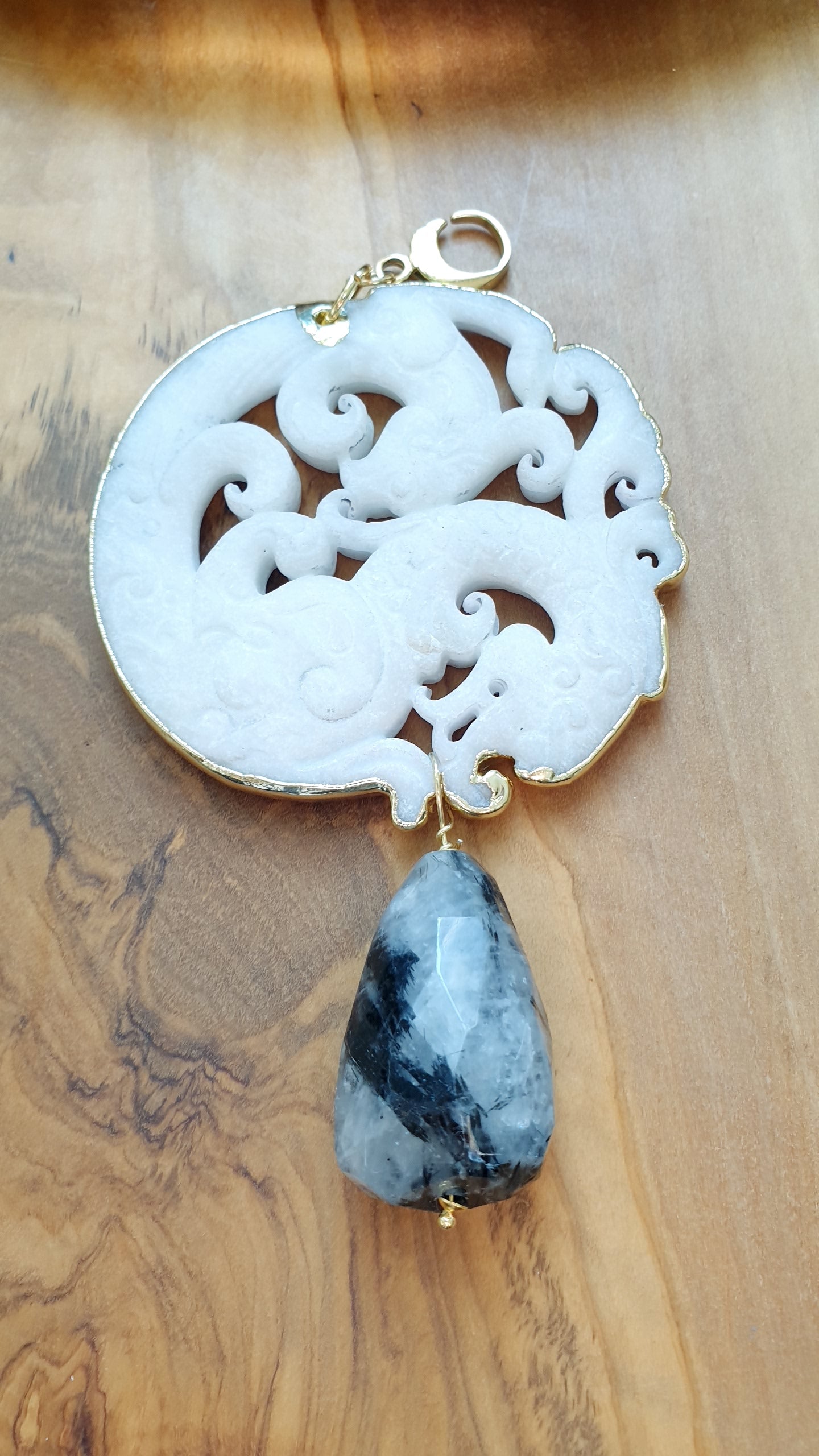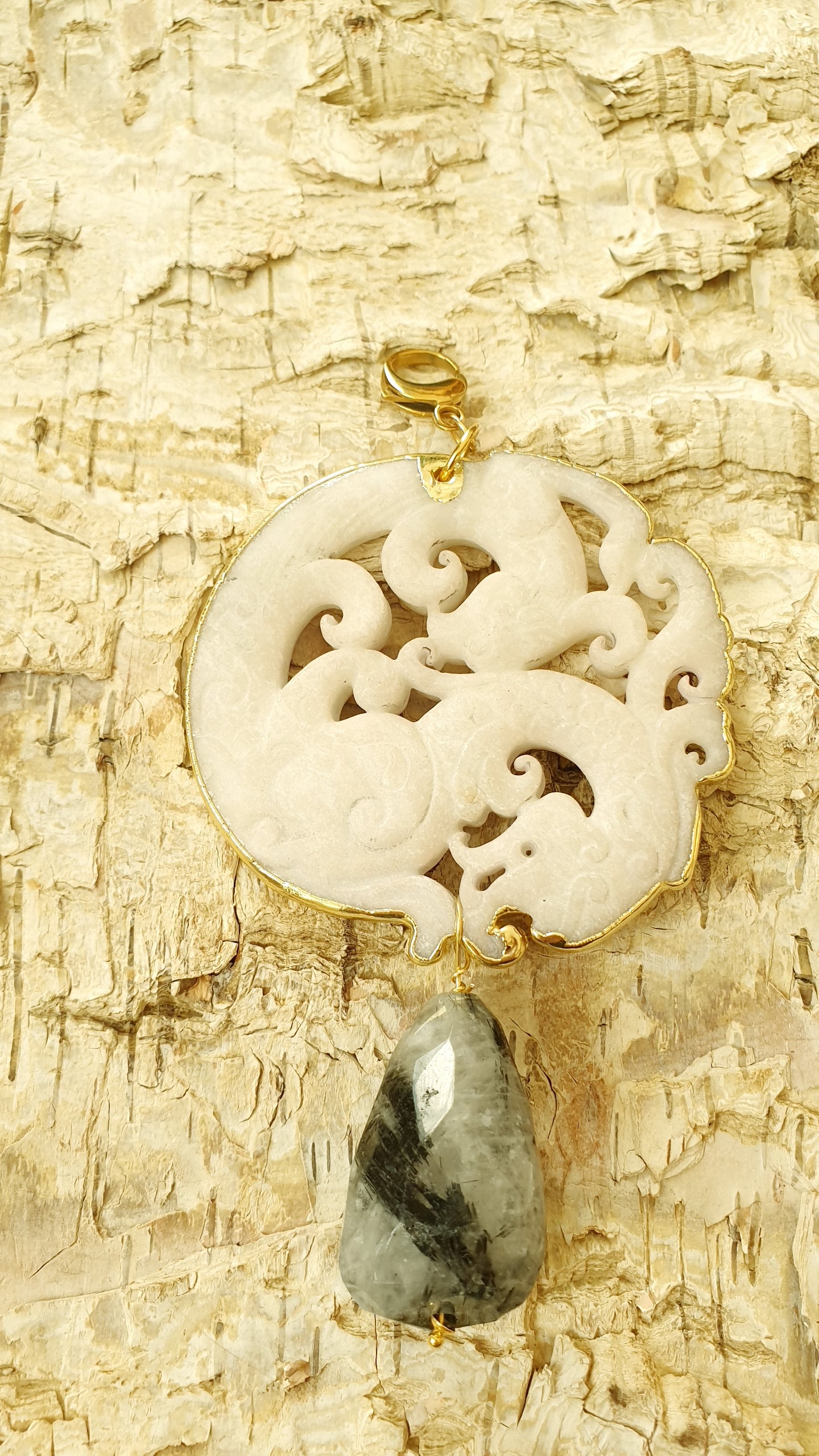 Ciondolo mala artigianale realizzato com gancio in acciaio, grnde giada intagliata cm. 7, grande goccia in quarzo tromalinato cm. 3.5 x 2