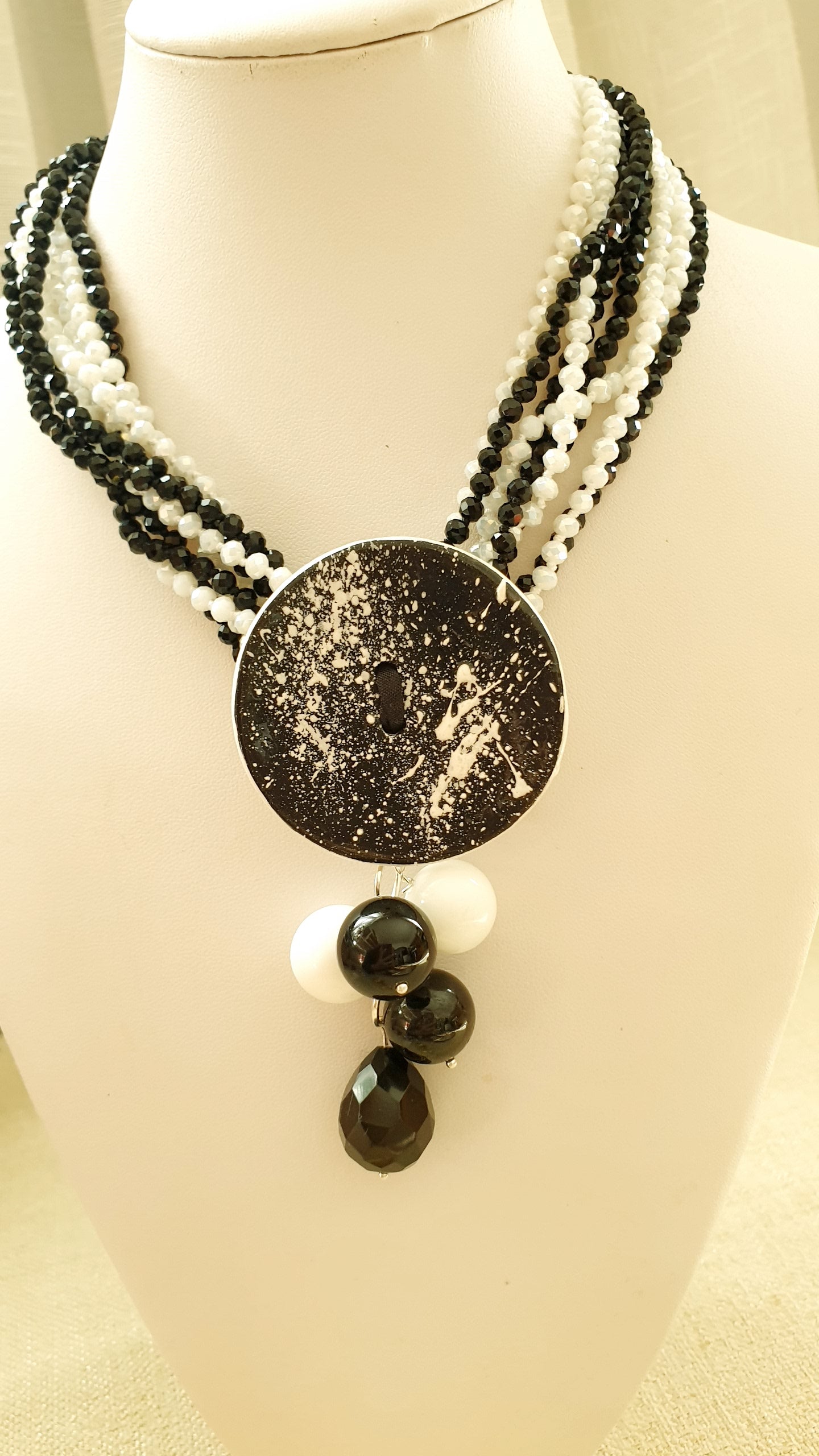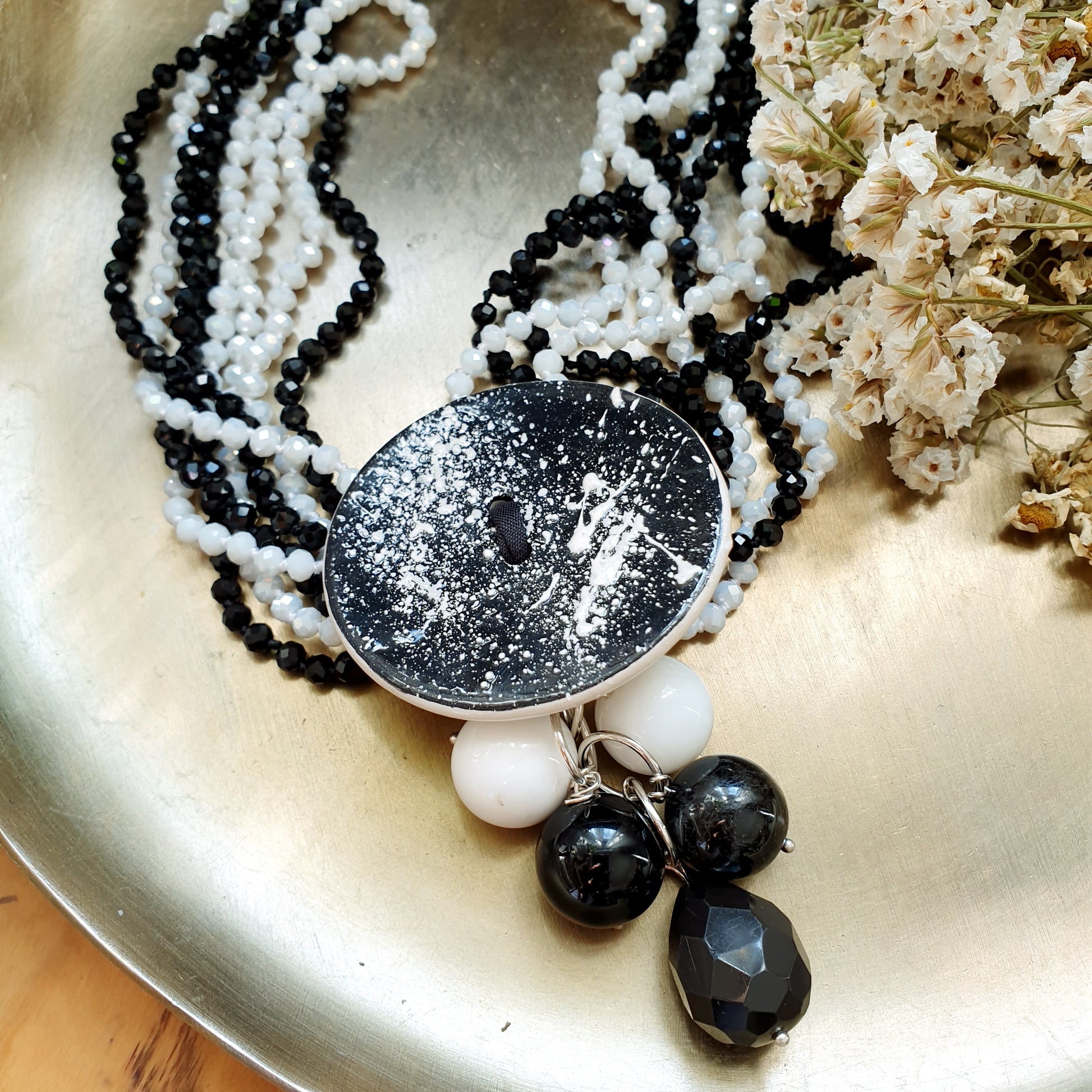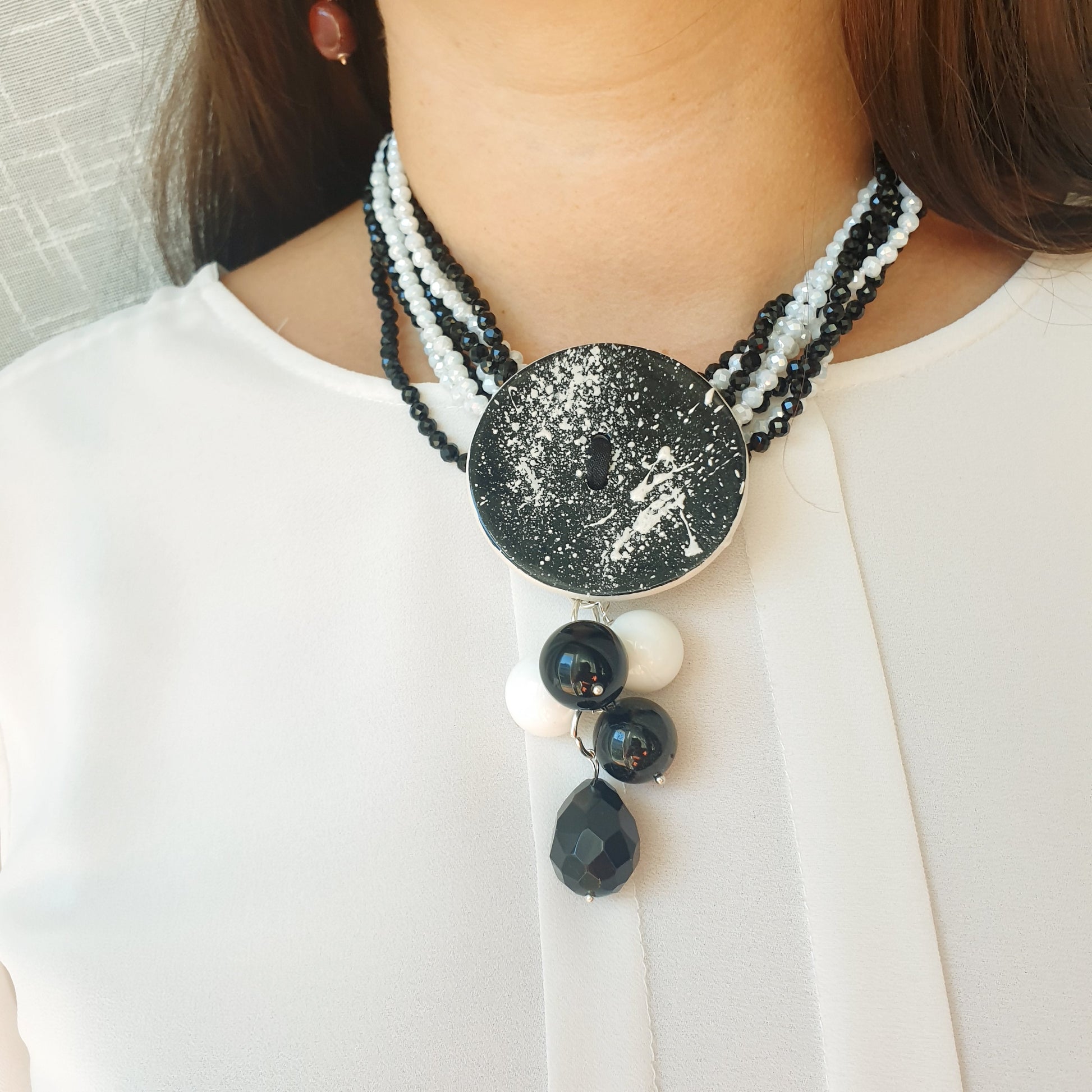 Collana artigianale realizzata con girocollo di cristallini neri e bianchi, centrale in ceramica realizzata a mano, grappolo con onice e agata bianca.