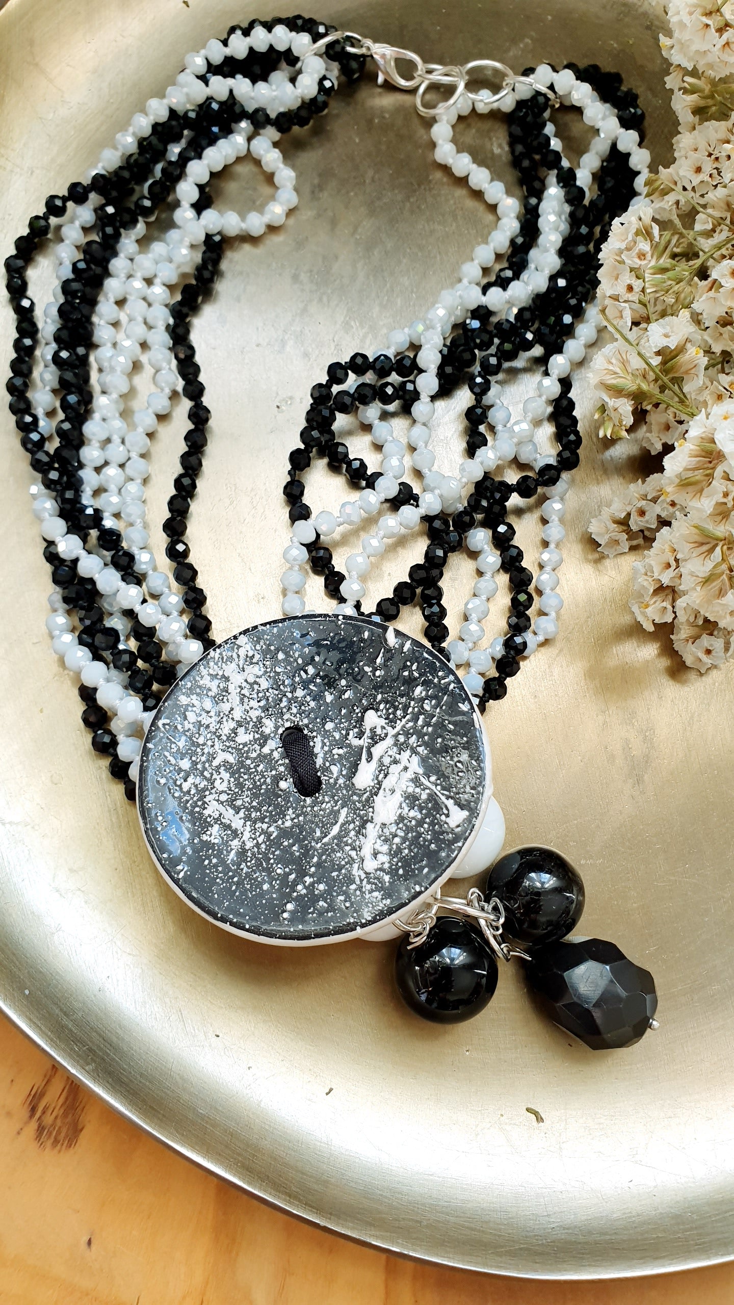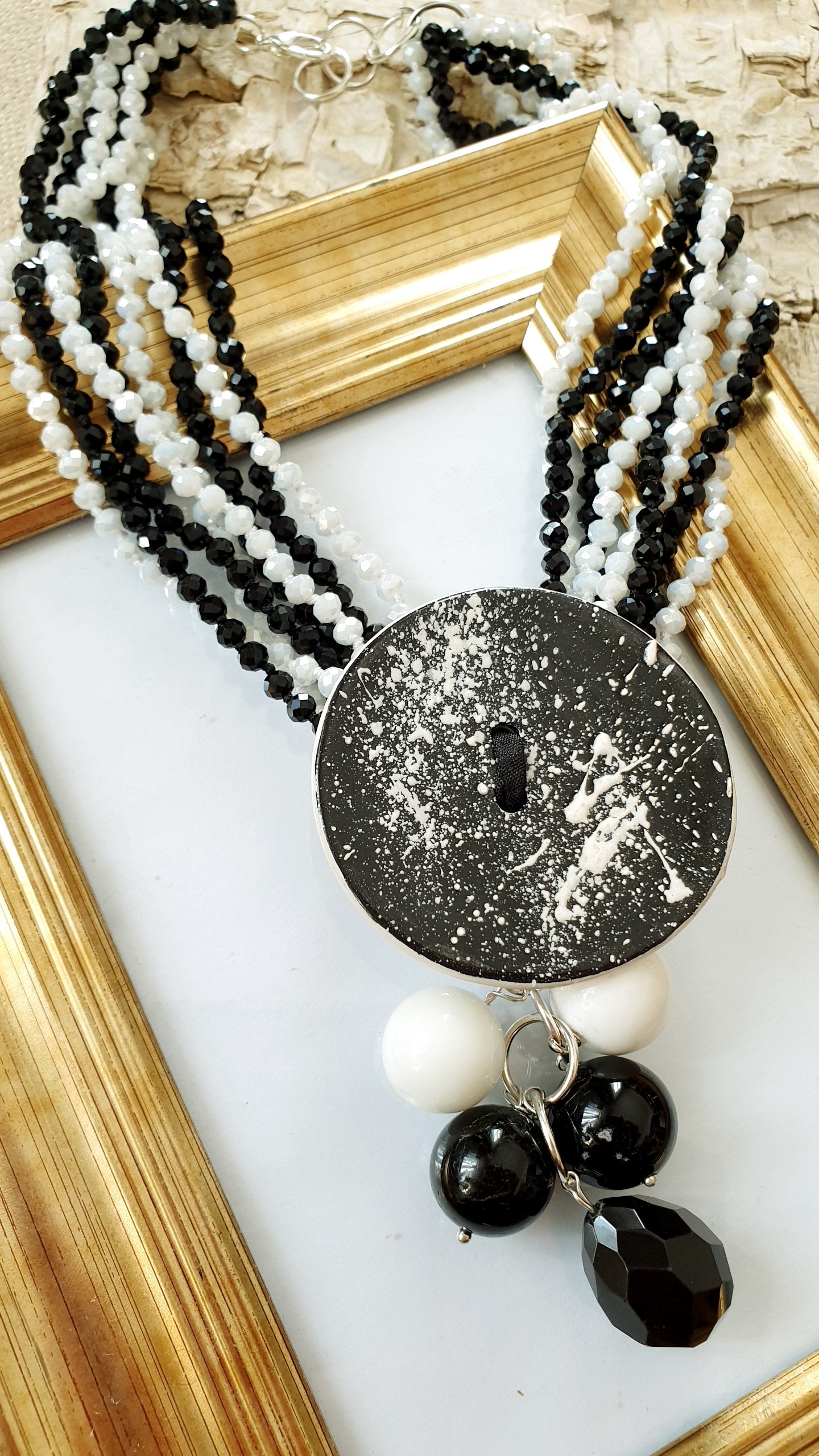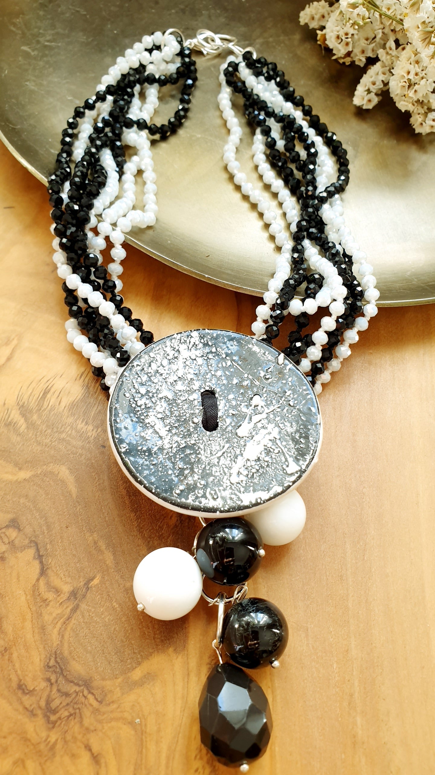 Collana artigianale realizzata con girocollo di cristallini neri e bianchi, centrale in ceramica realizzata a mano, grappolo con onice e agata bianca.