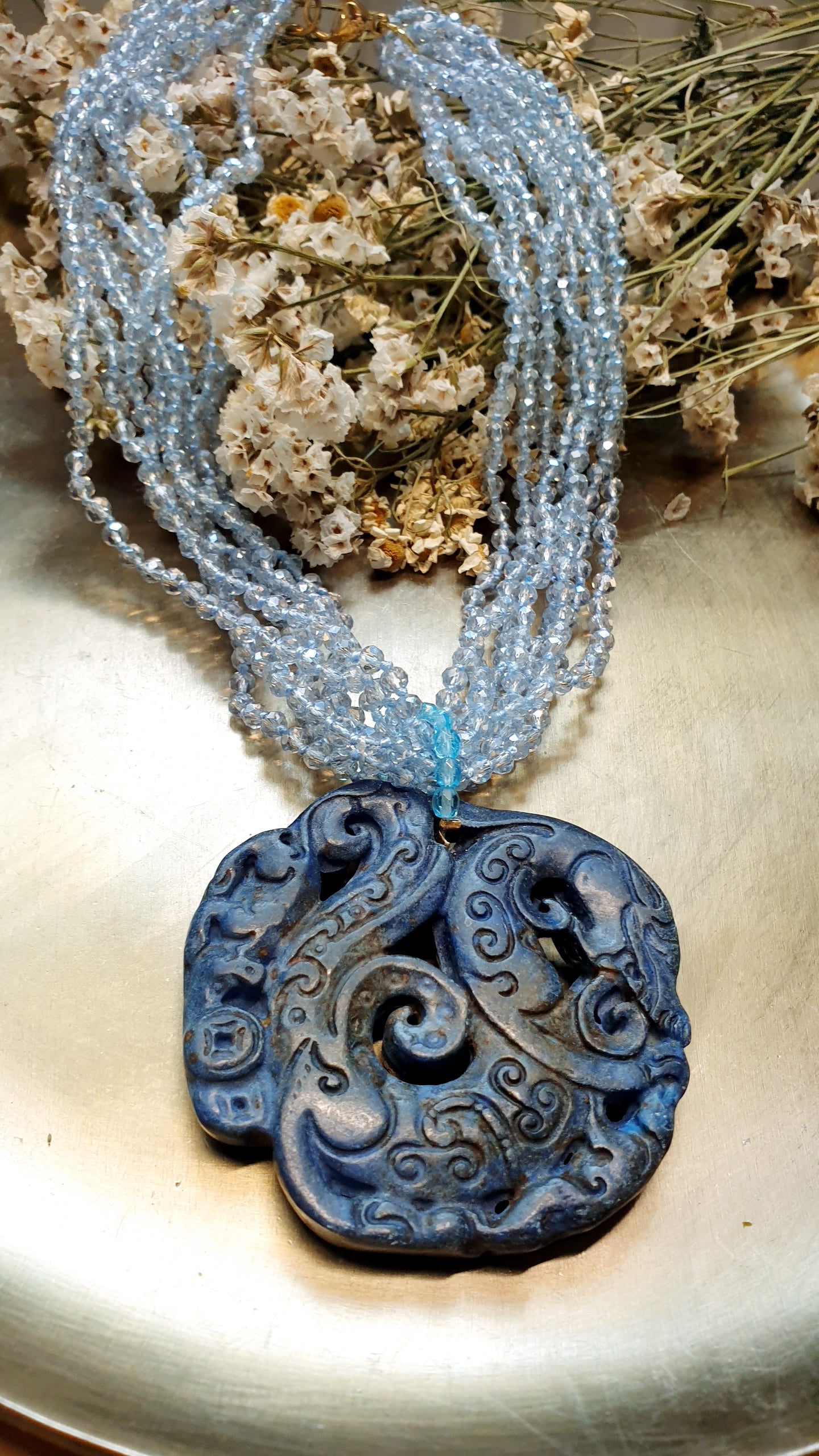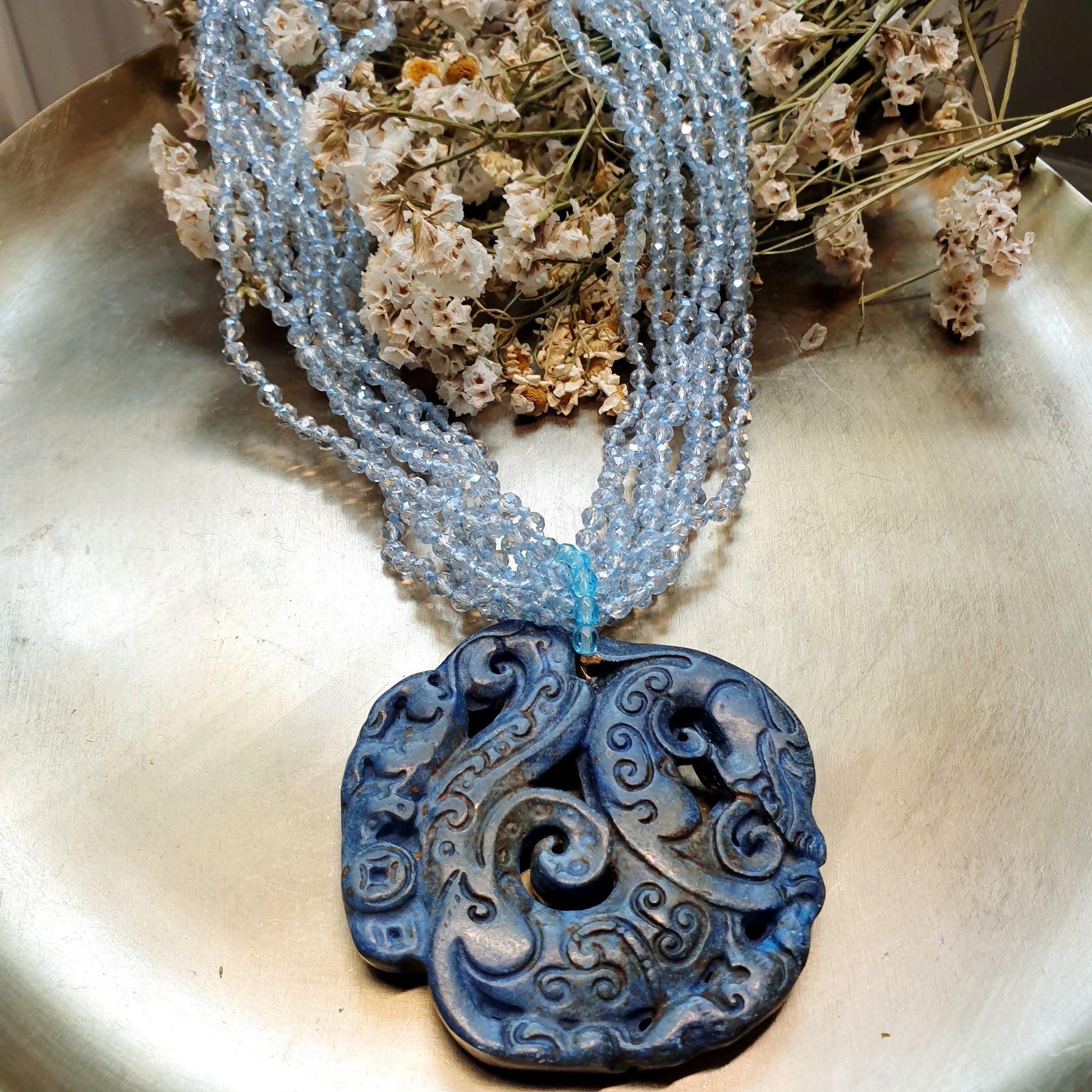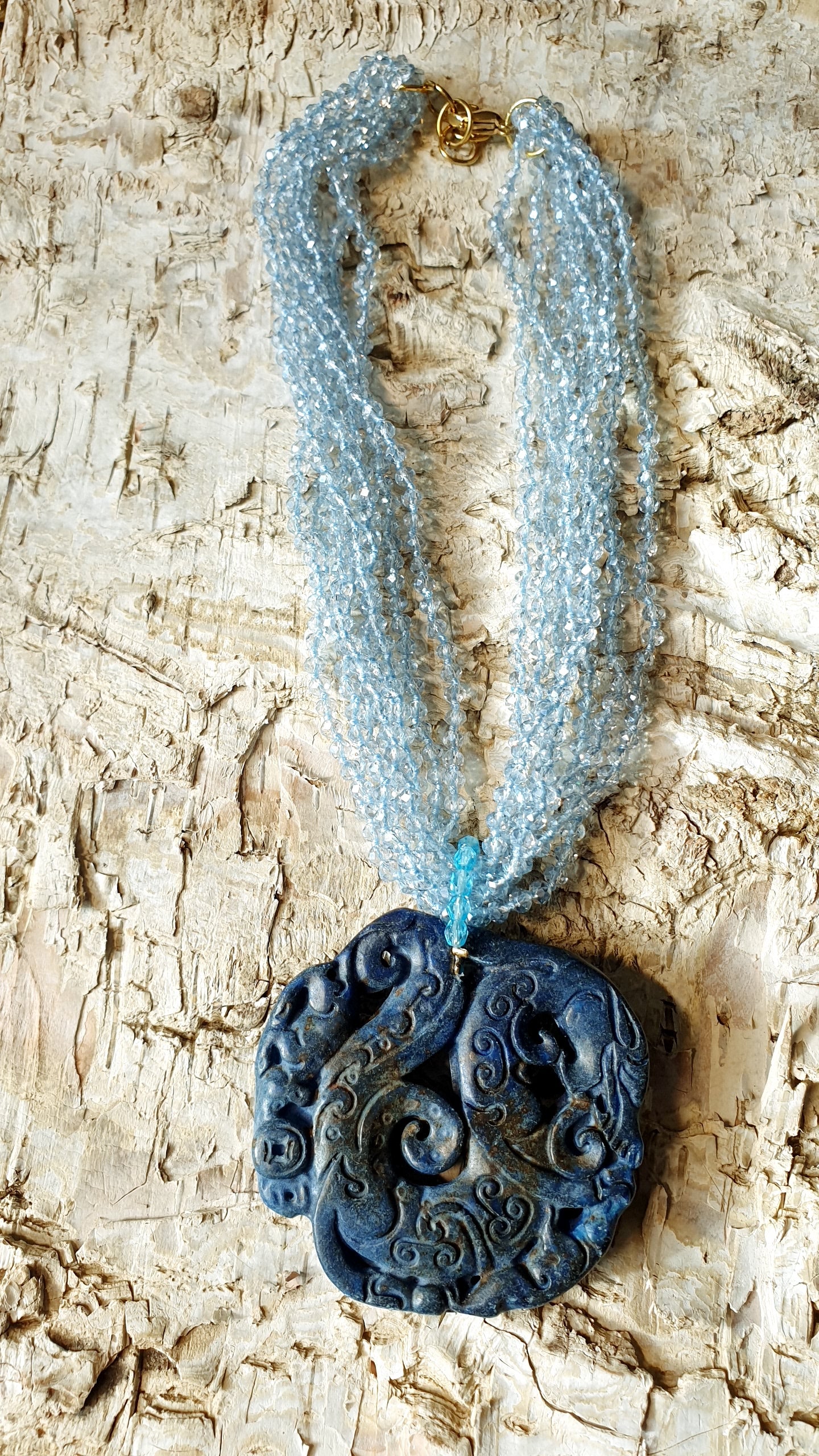 Collana artiginale realizzata con girocollo in cristallini azzurri, grande giada intagliata cm. 6.5