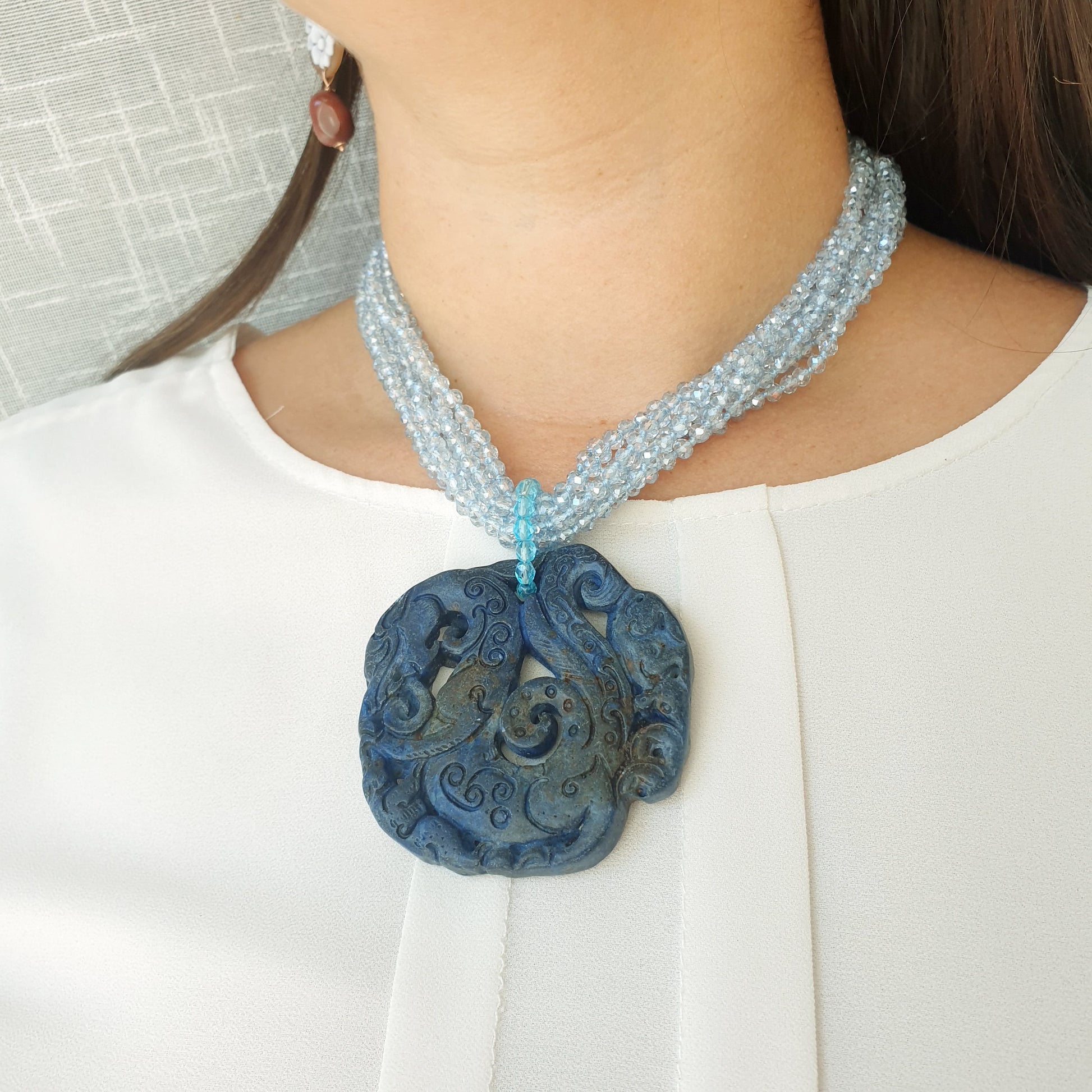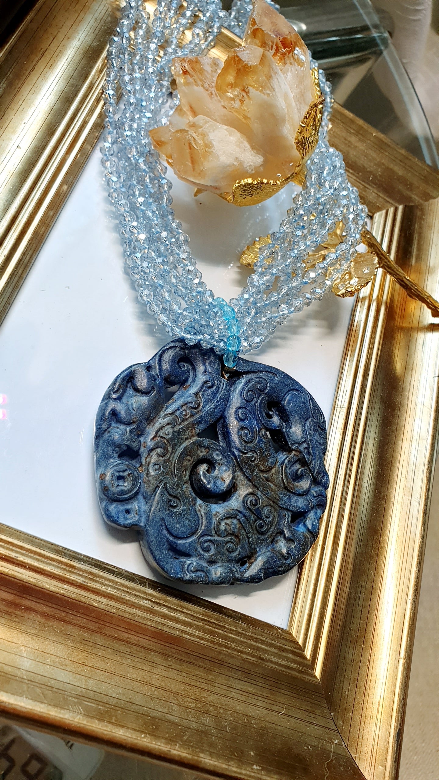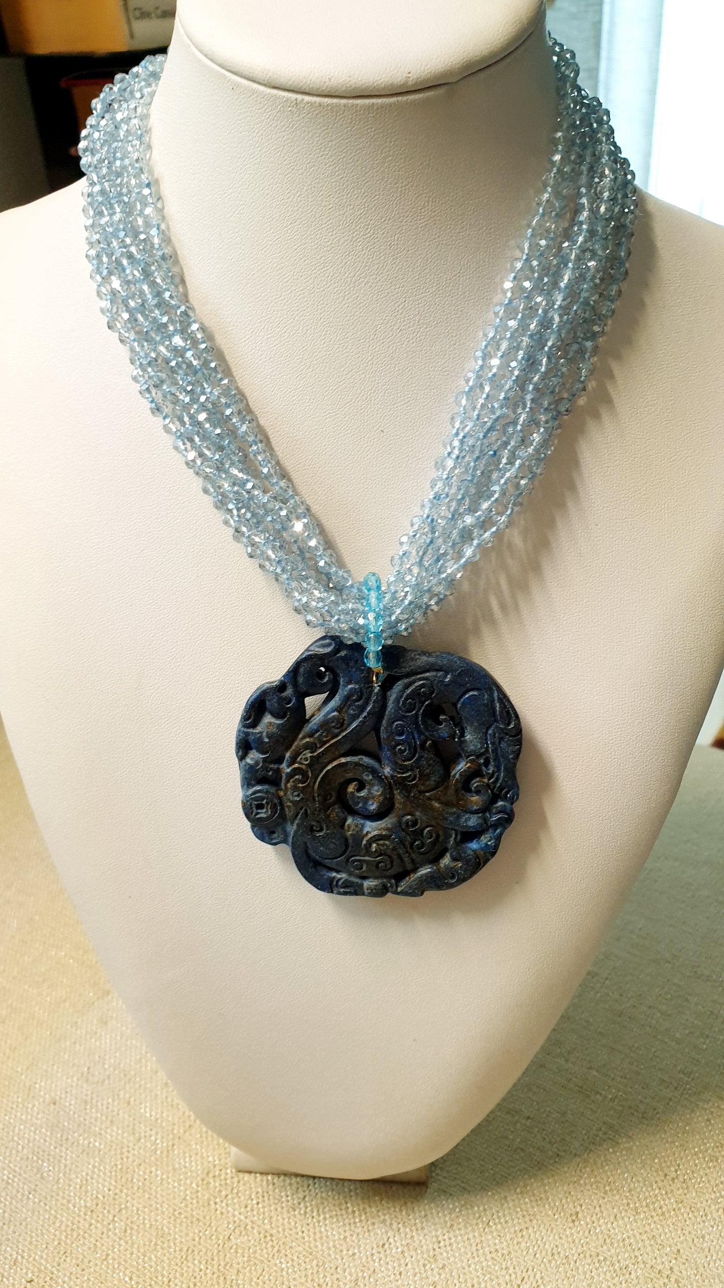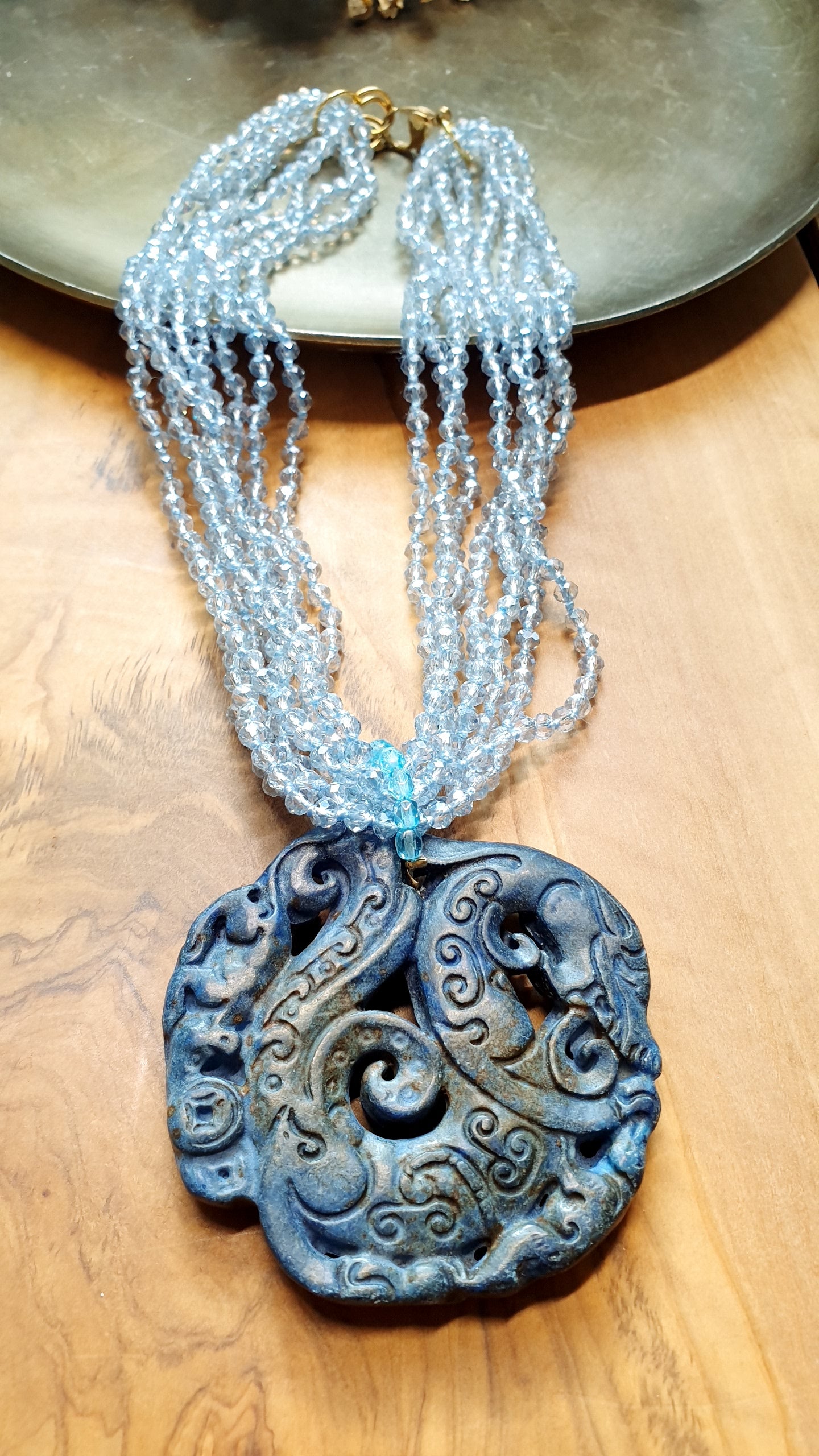 Collana artiginale realizzata con girocollo in cristallini azzurri, grande giada intagliata cm. 6.5