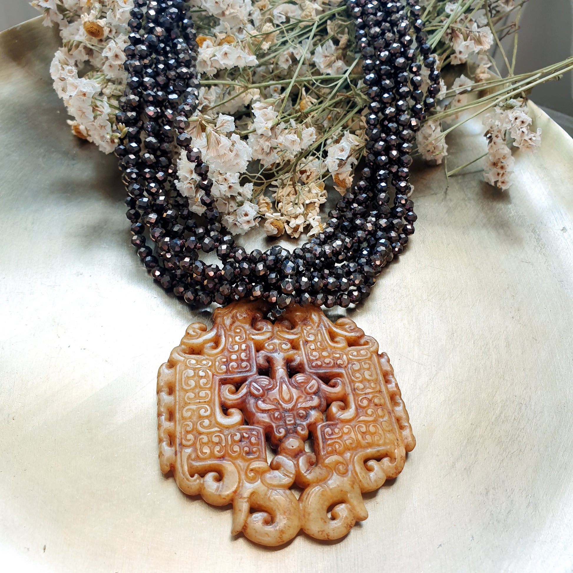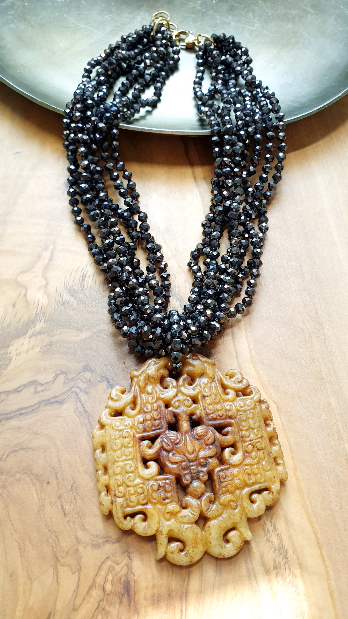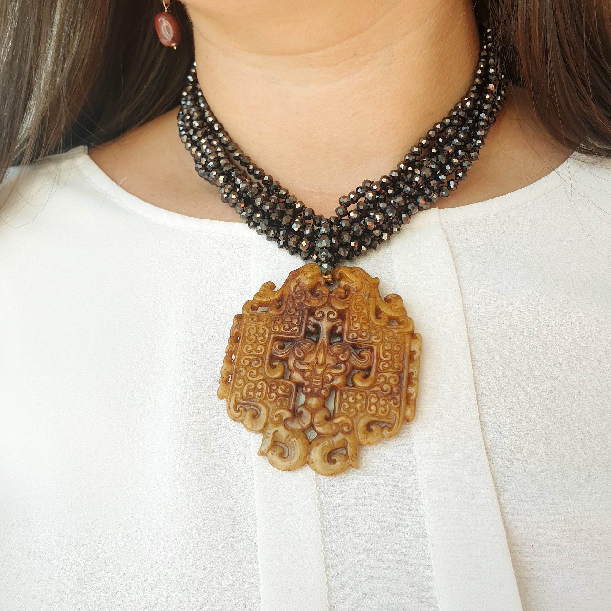 Collana artigianale realizzata con girocollo di cristallini marroni e chiusura in acciaio, grande giada intagliata cm. 6.5