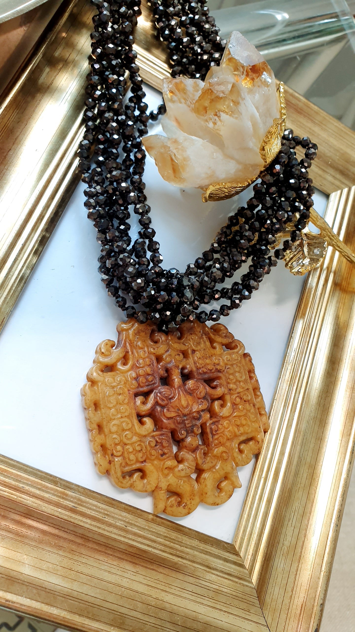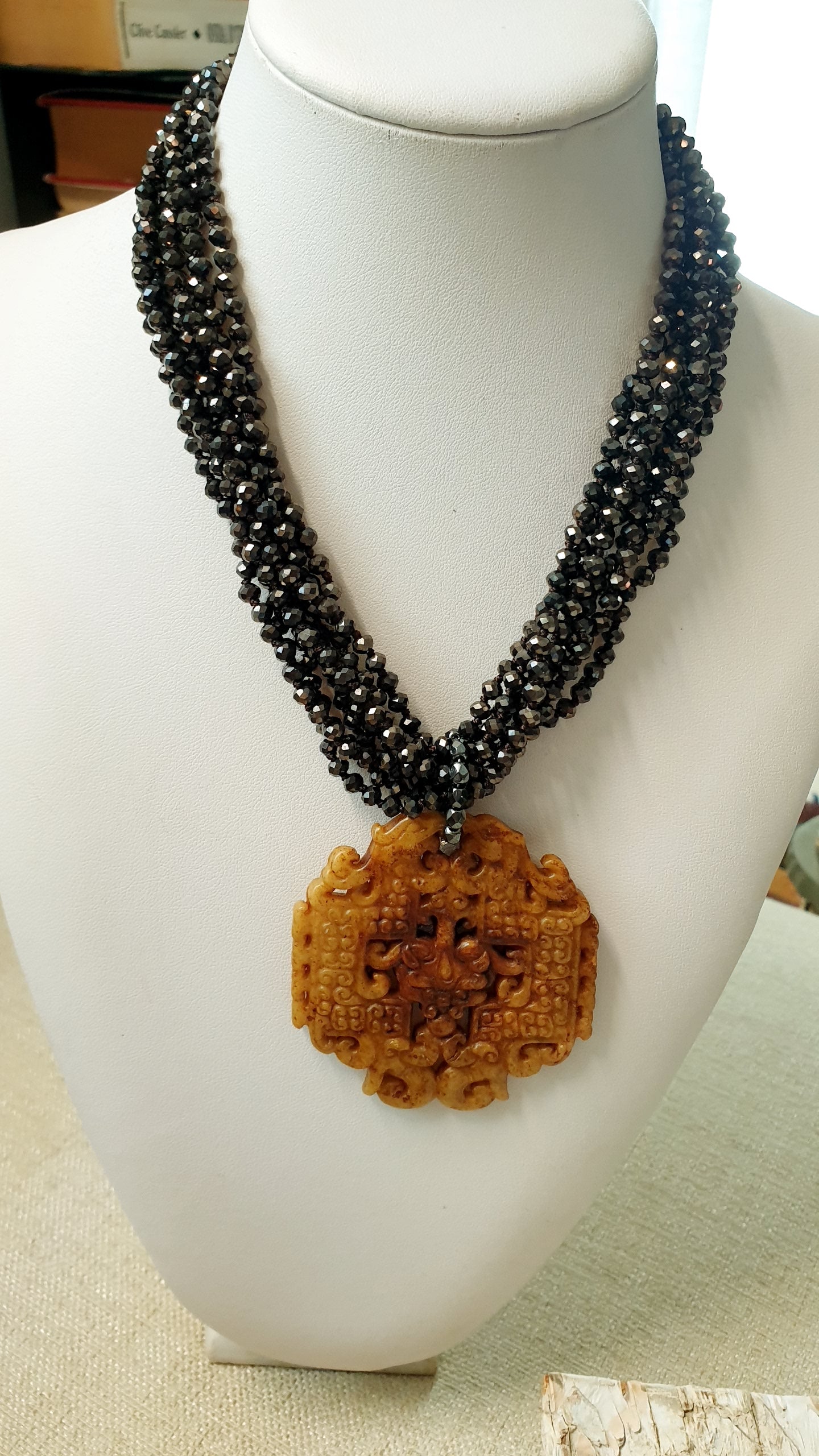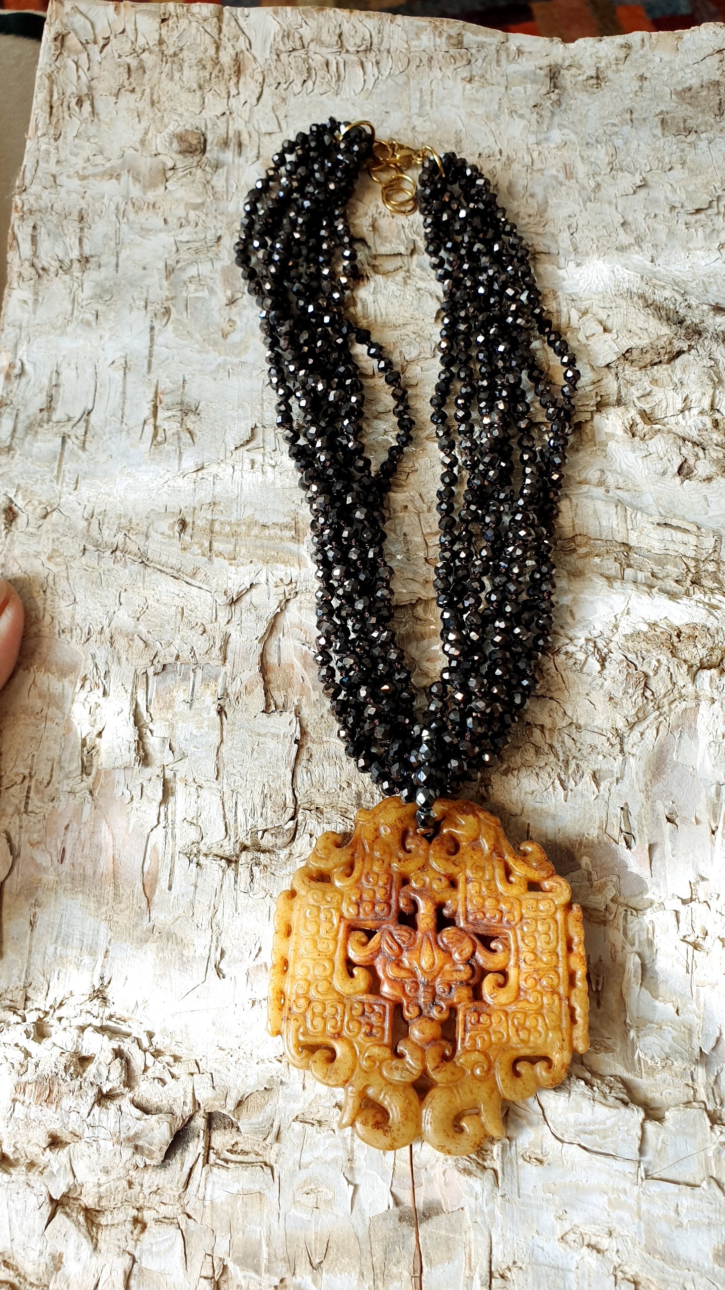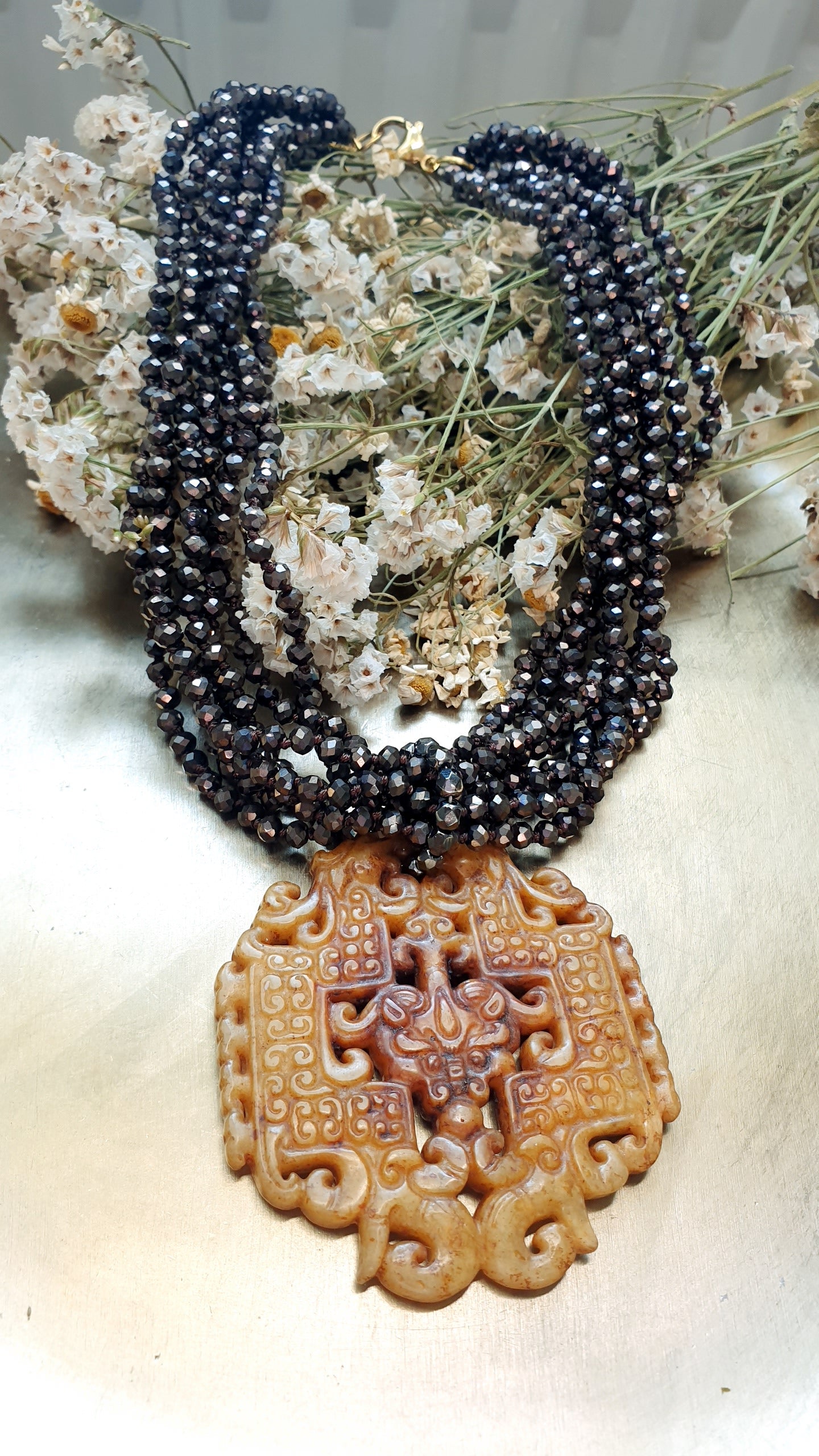 Collana artigianale realizzata con girocollo di cristallini marroni e chiusura in acciaio, grande giada intagliata cm. 6.5