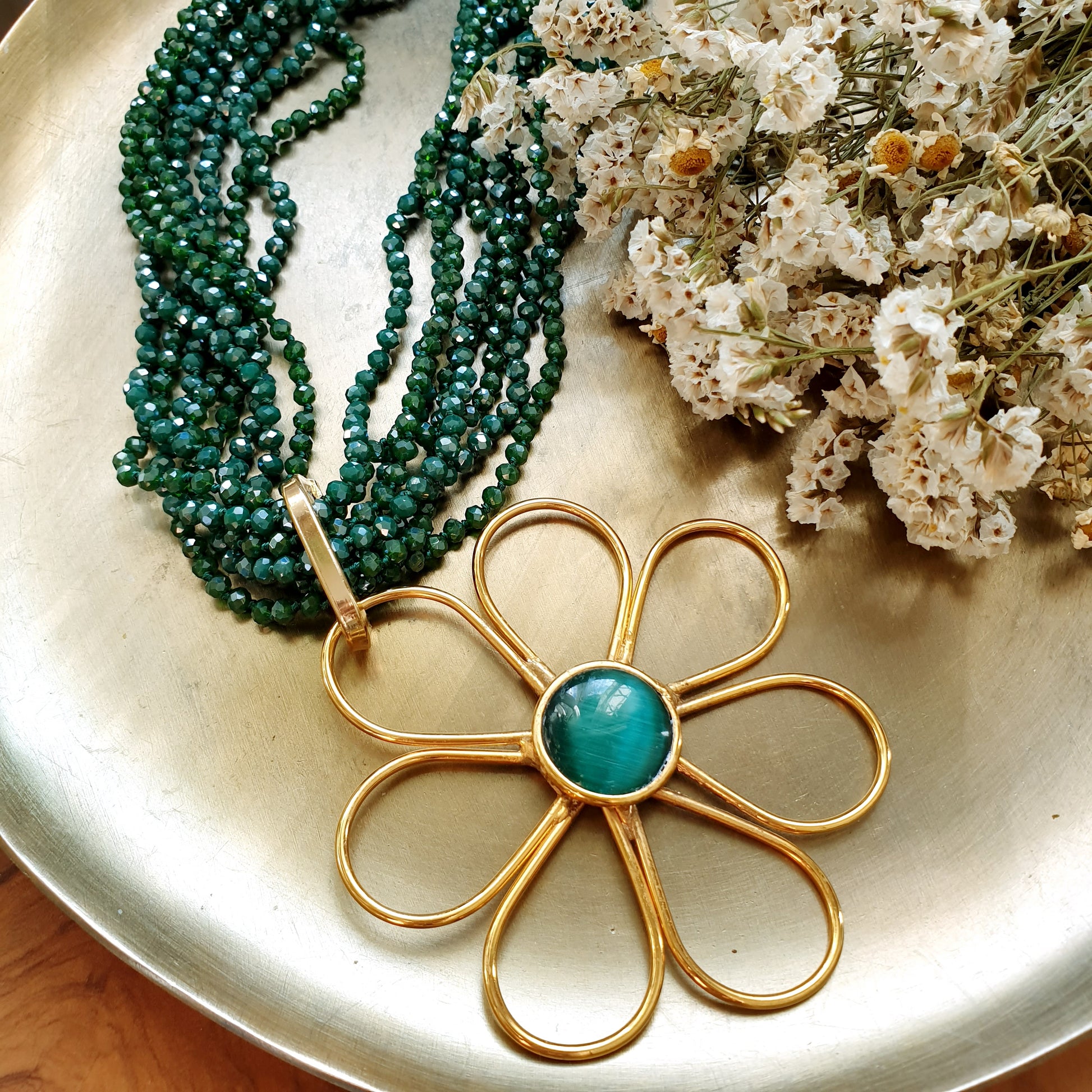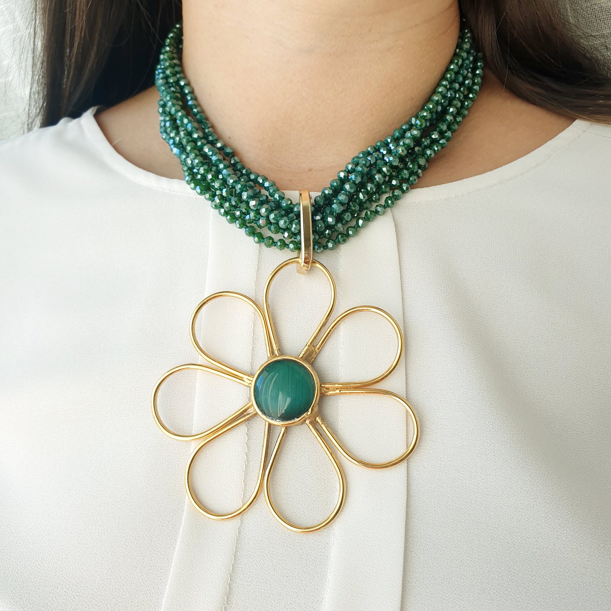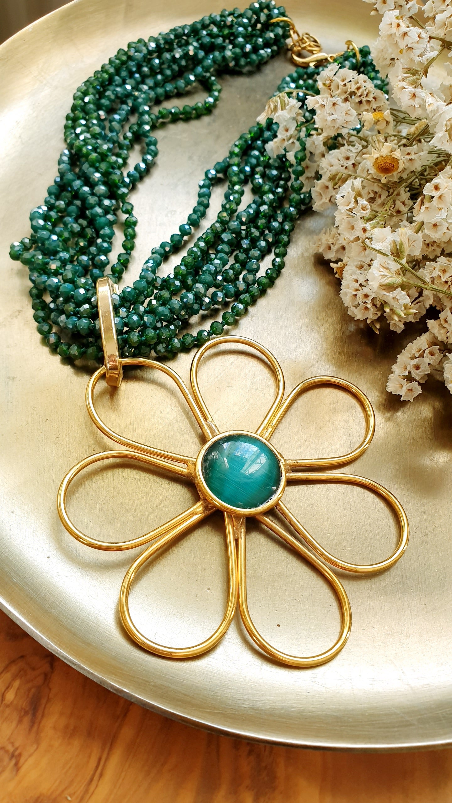 Collana artigianale realizzata con girocollo in cristallini verdi, grande fiore modellato a mano poi placcato oro cm. 9, occhio di gatto verde cm. 2.
