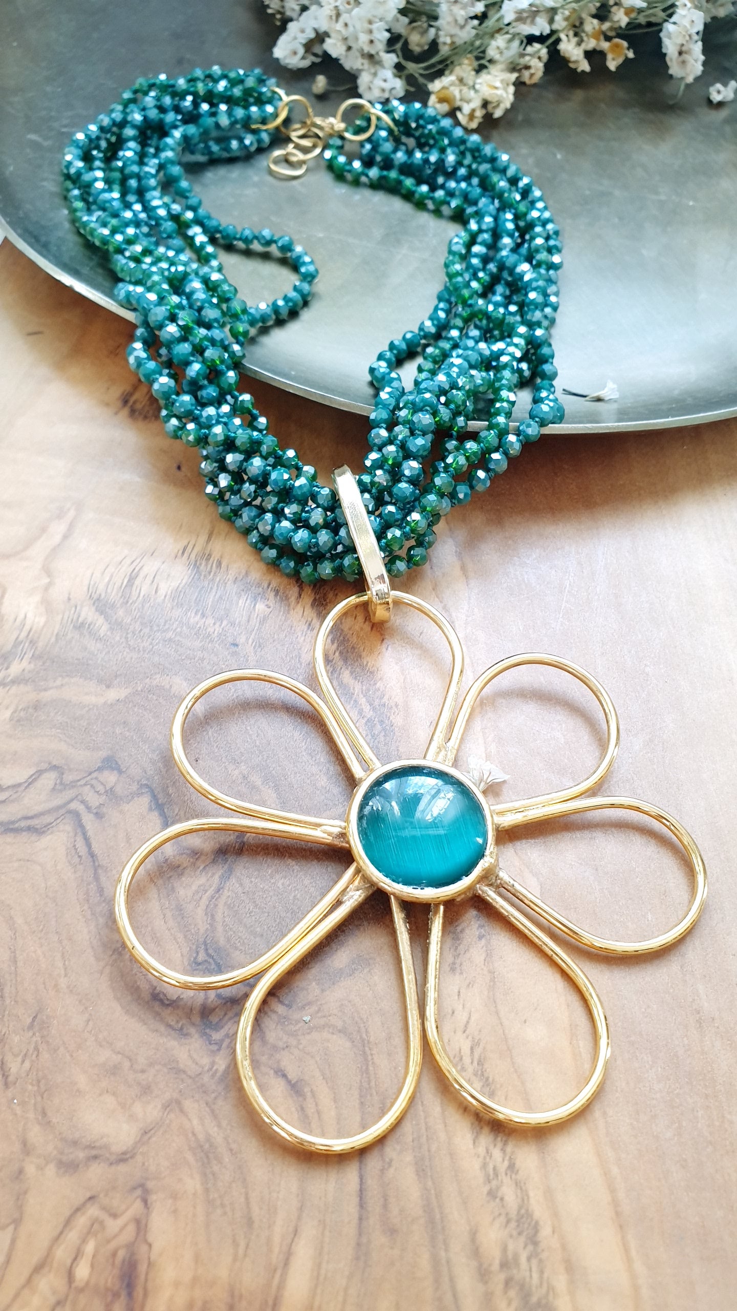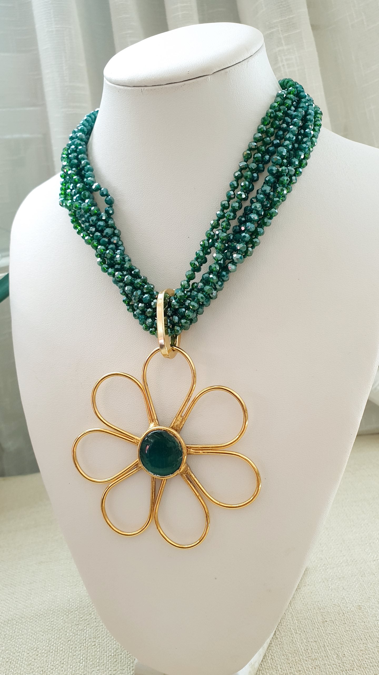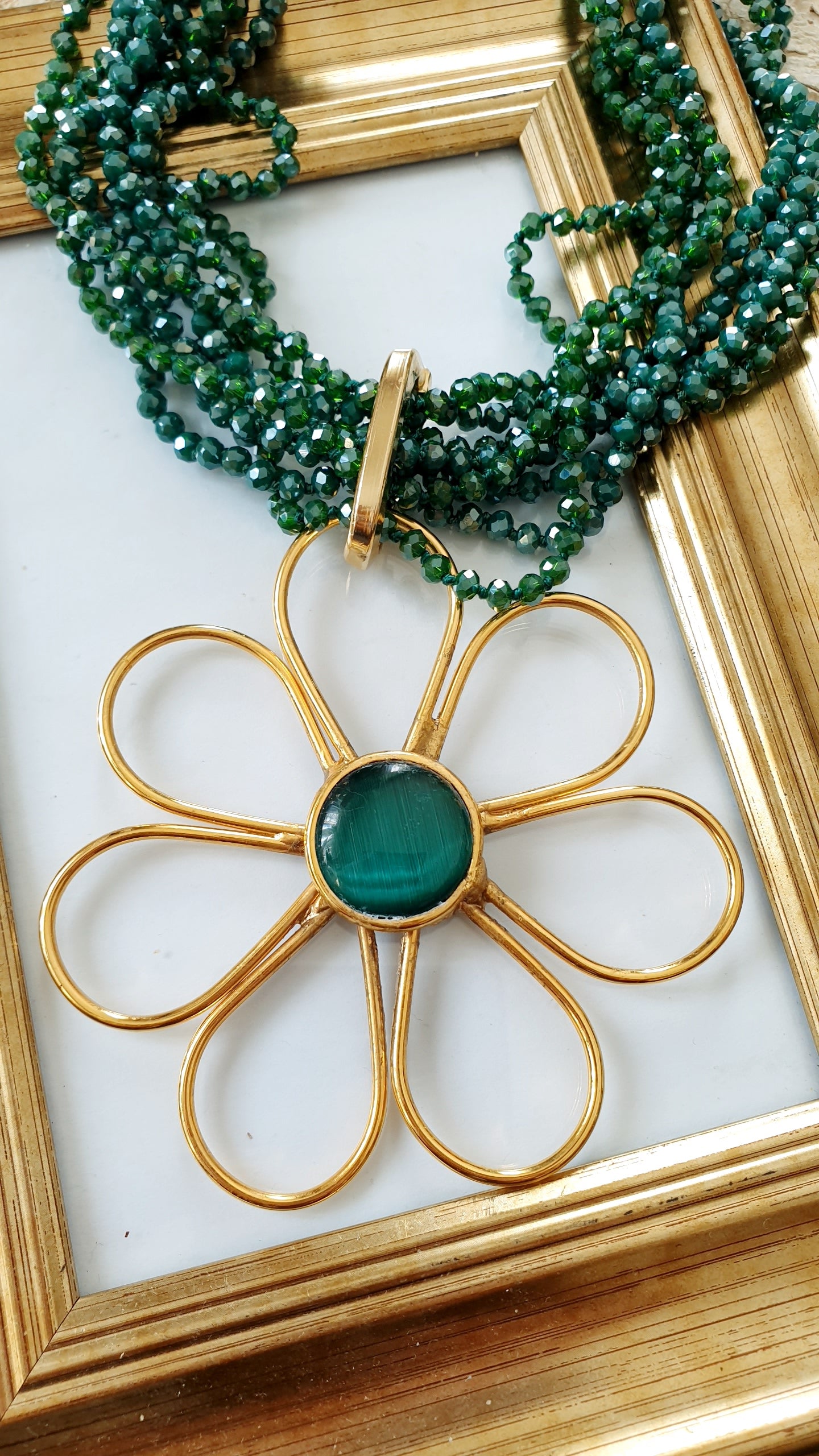 Collana artigianale realizzata con girocollo in cristallini verdi, grande fiore modellato a mano poi placcato oro cm. 9, occhio di gatto verde cm. 2.