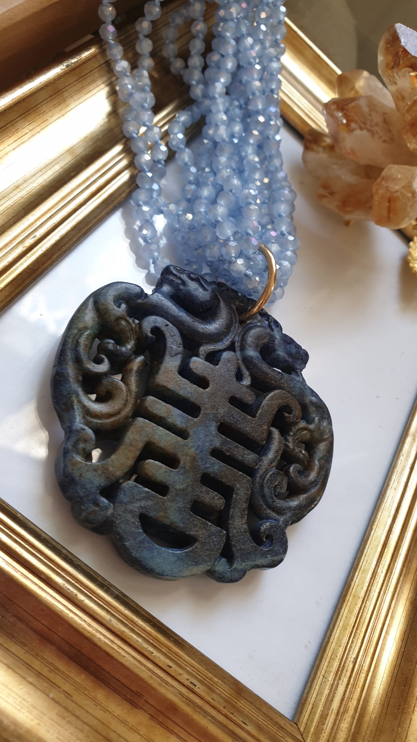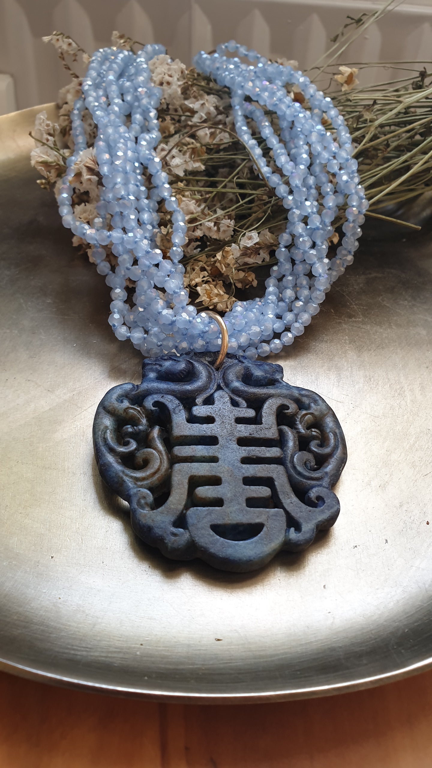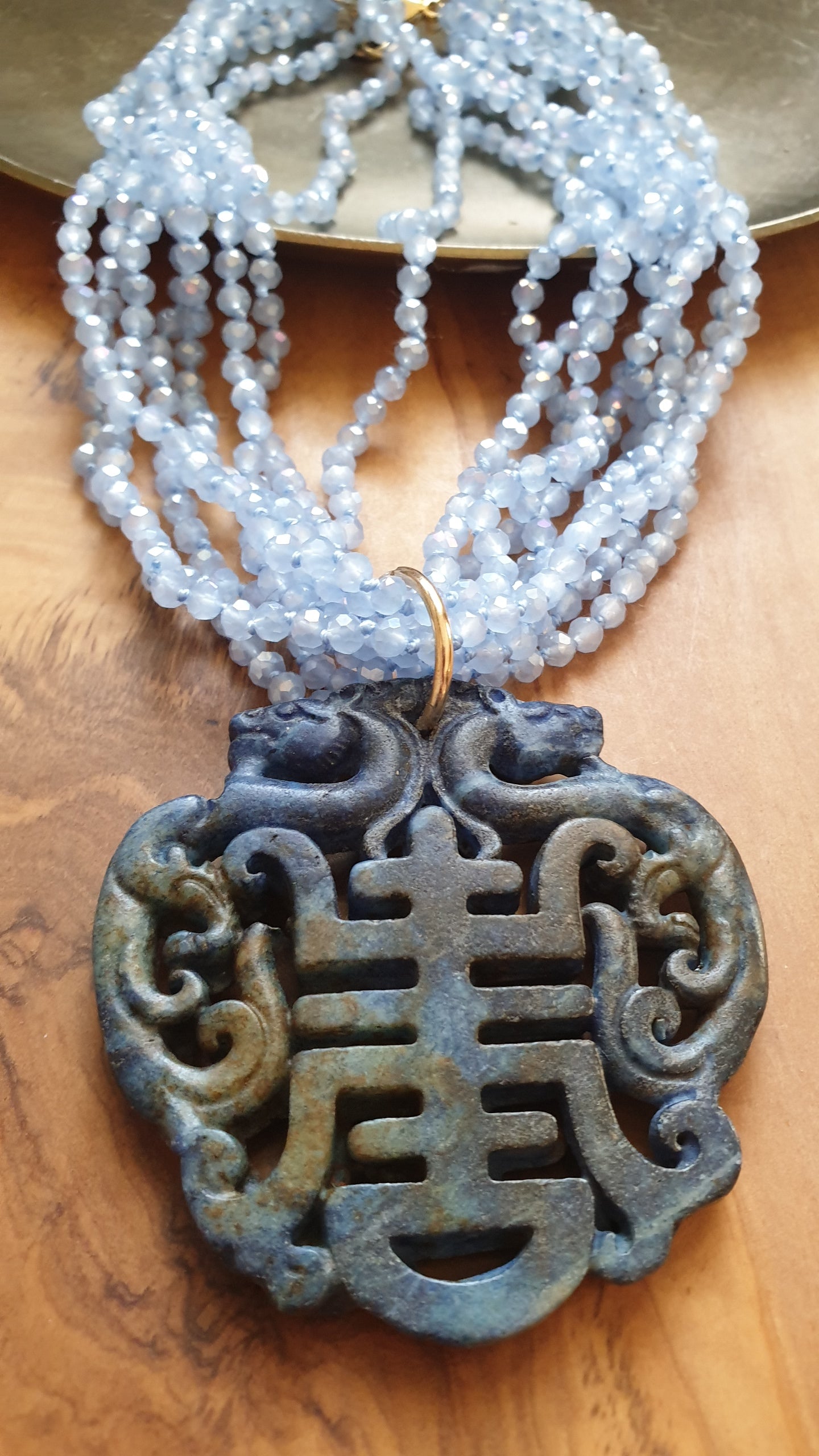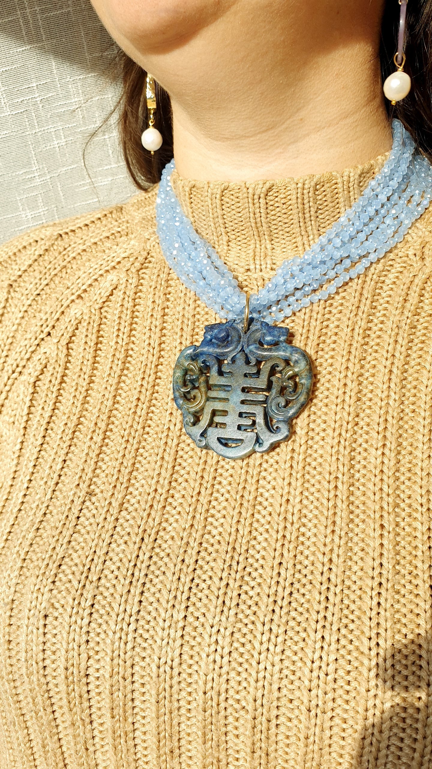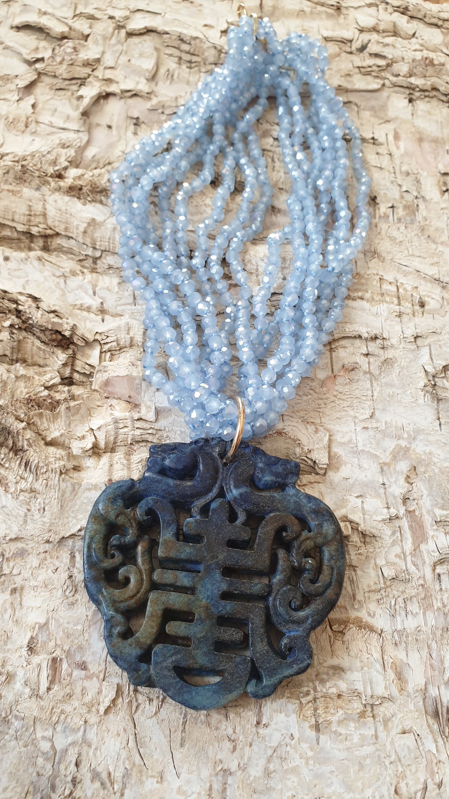 Collana artigianale realizzata con giroco9llo di cristallini azzurri e chiusura in ottone.
