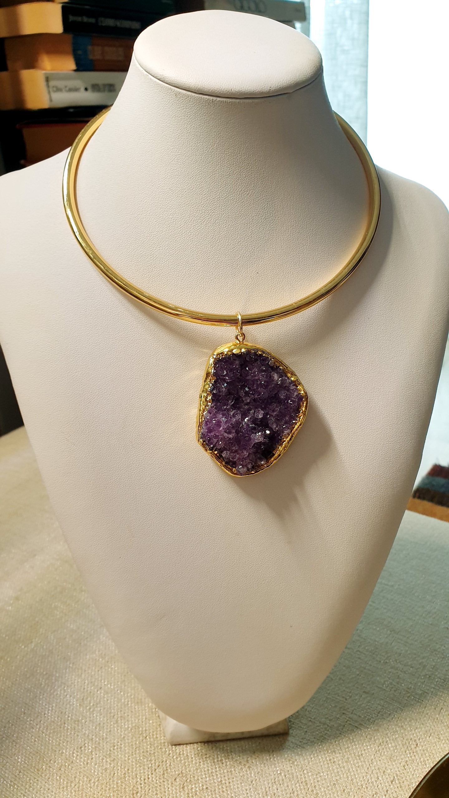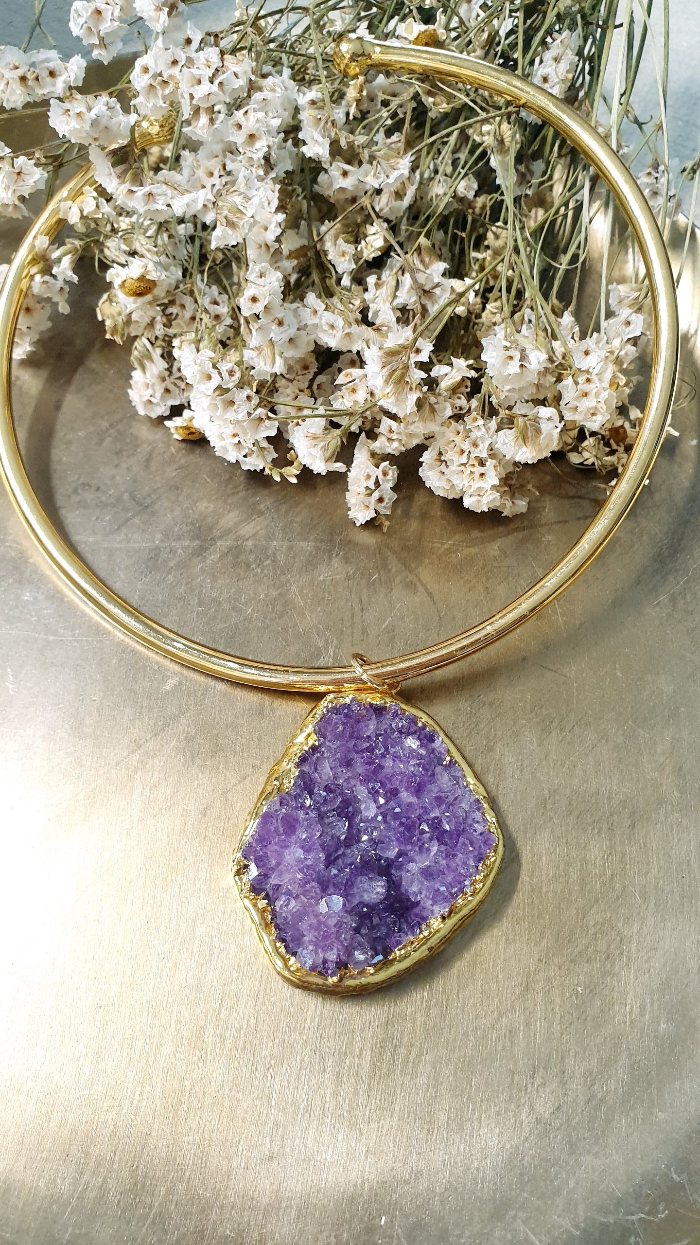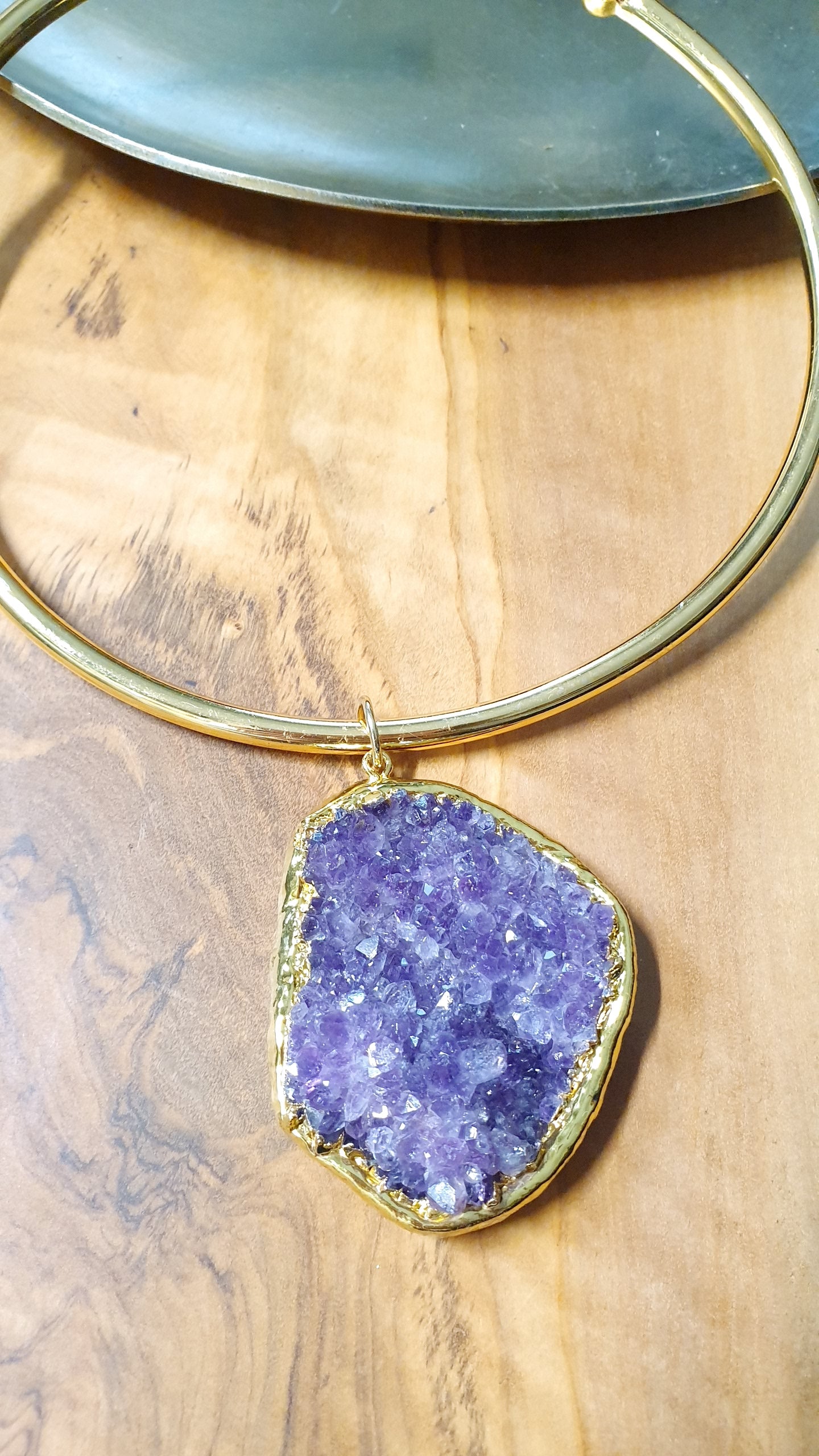 Collana artigianale realizzata con girocollo in ottone placcato oro con grande drusa di ametista cm. 6 x 5