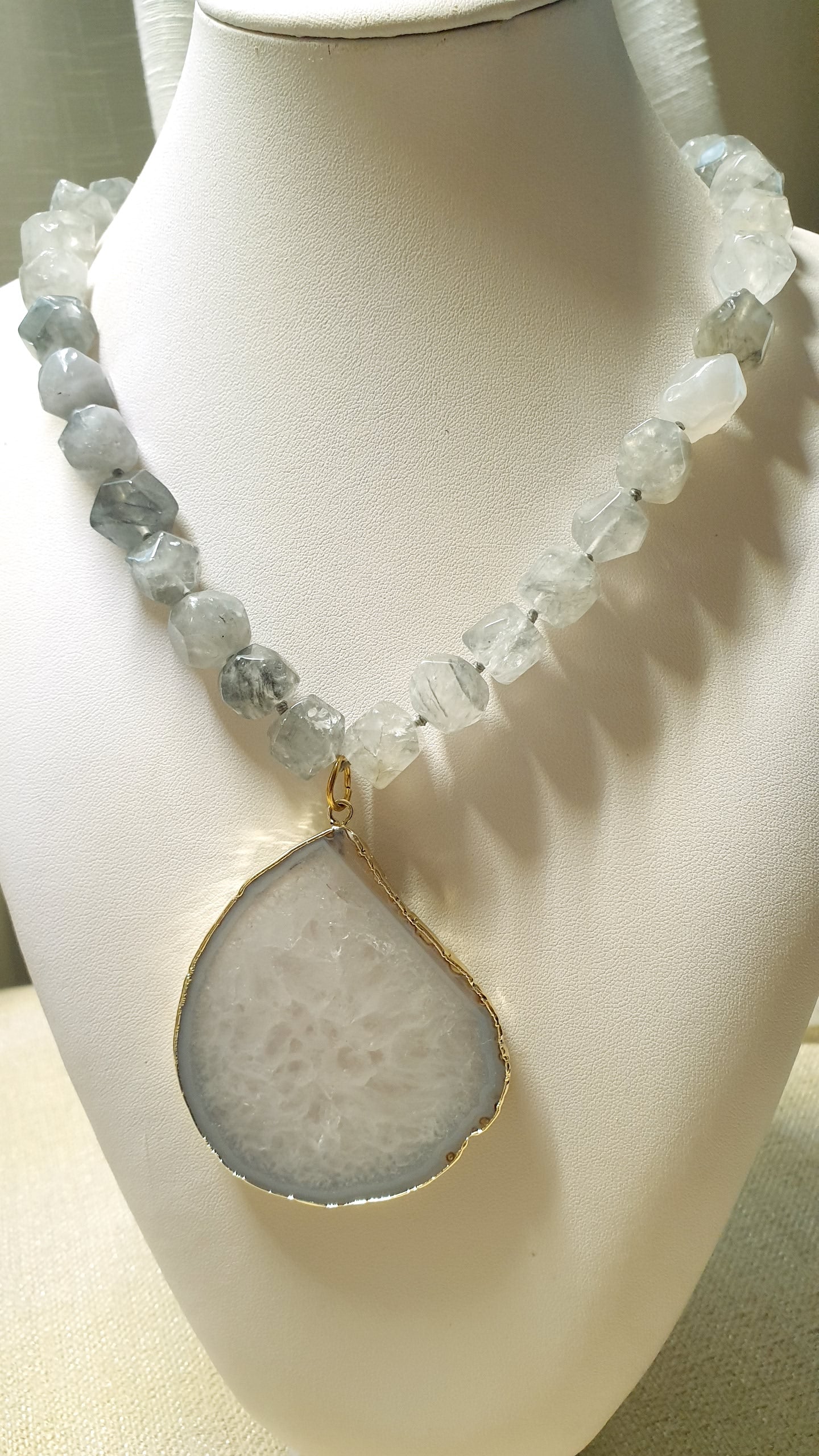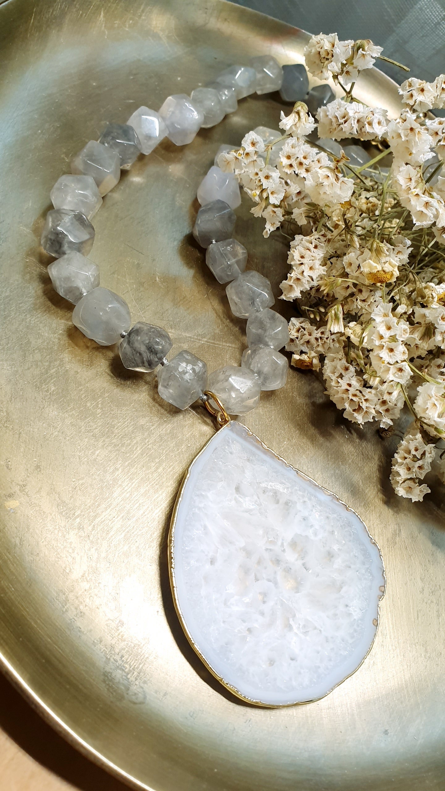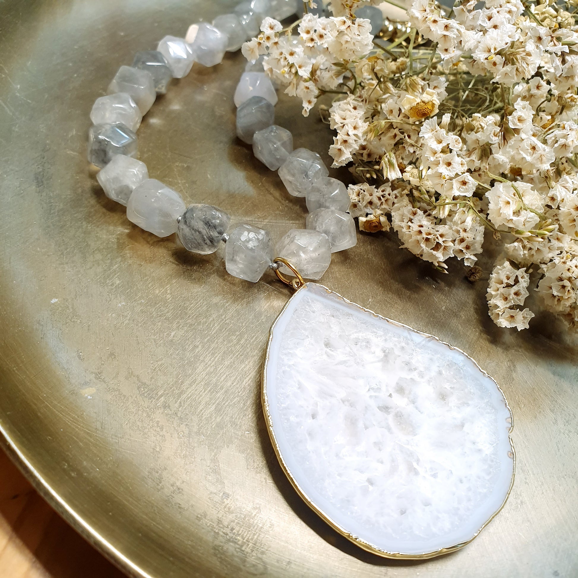 Girocollo in quarzo grigio con grande drusa di agata