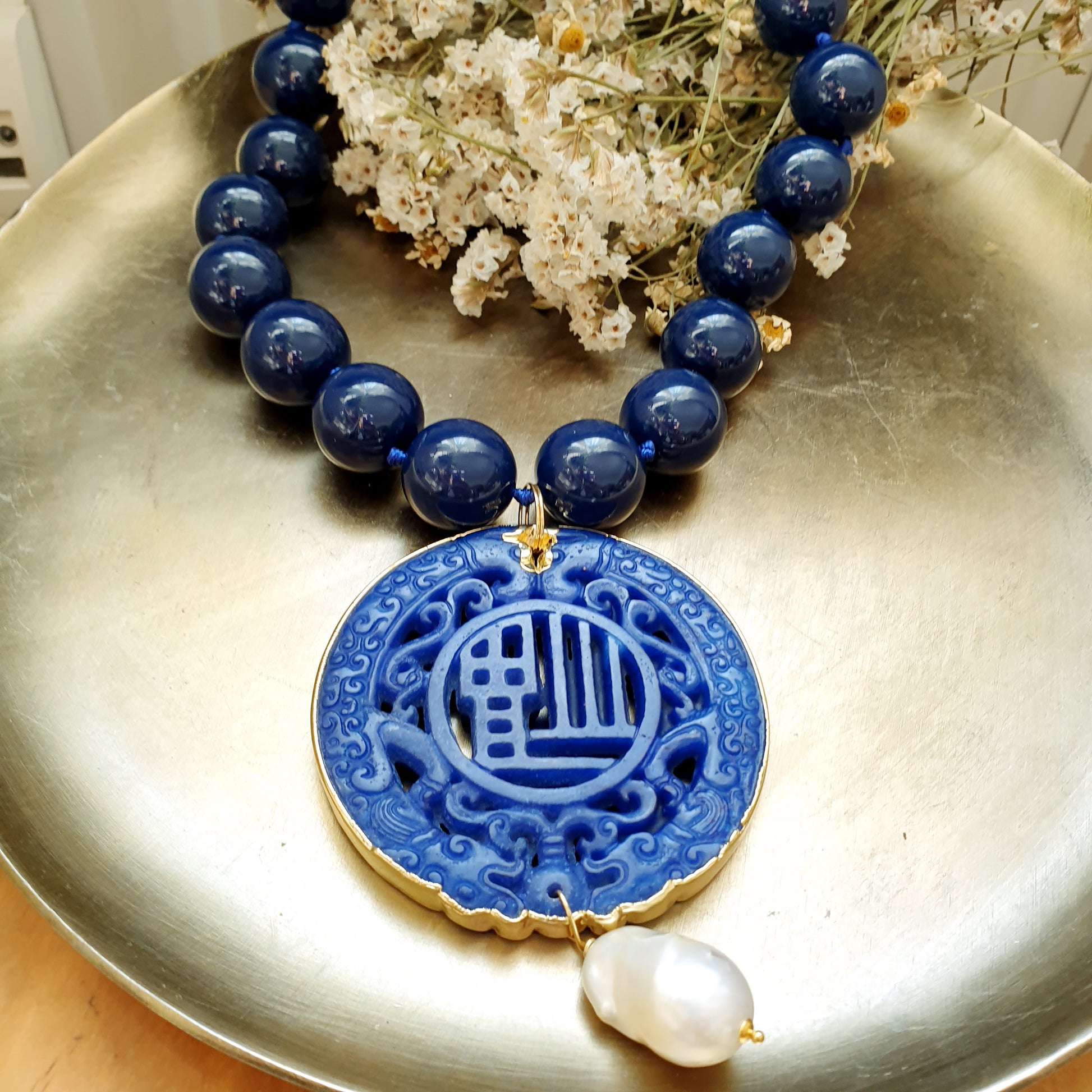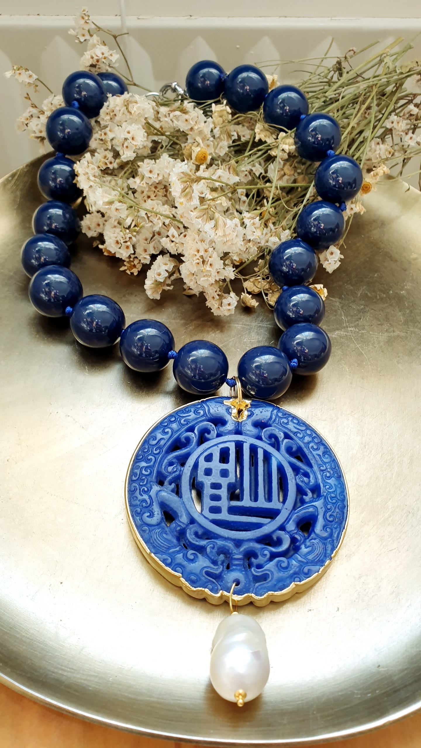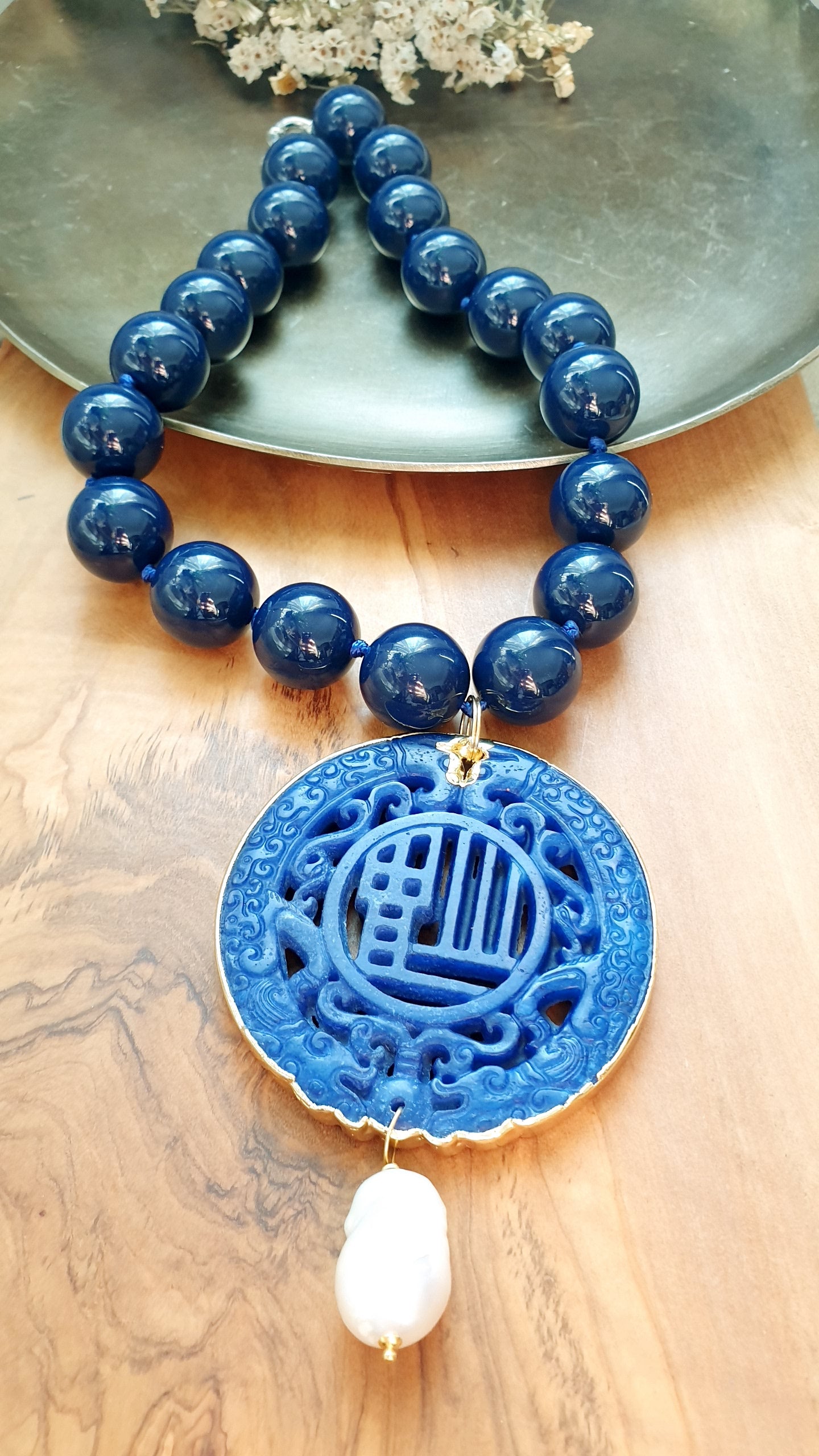 Grande giada intagliata blu cm 7, grande perla barocca bianchissima cm 2.5 x 1.5