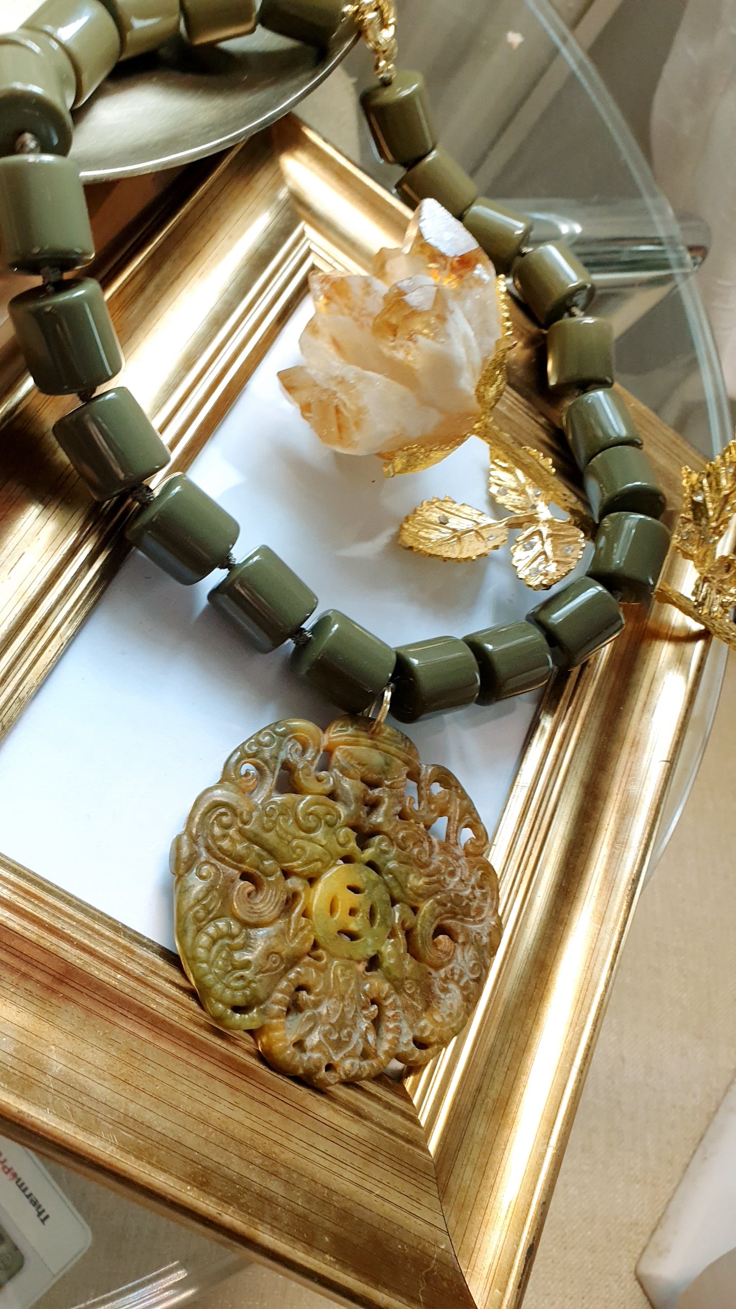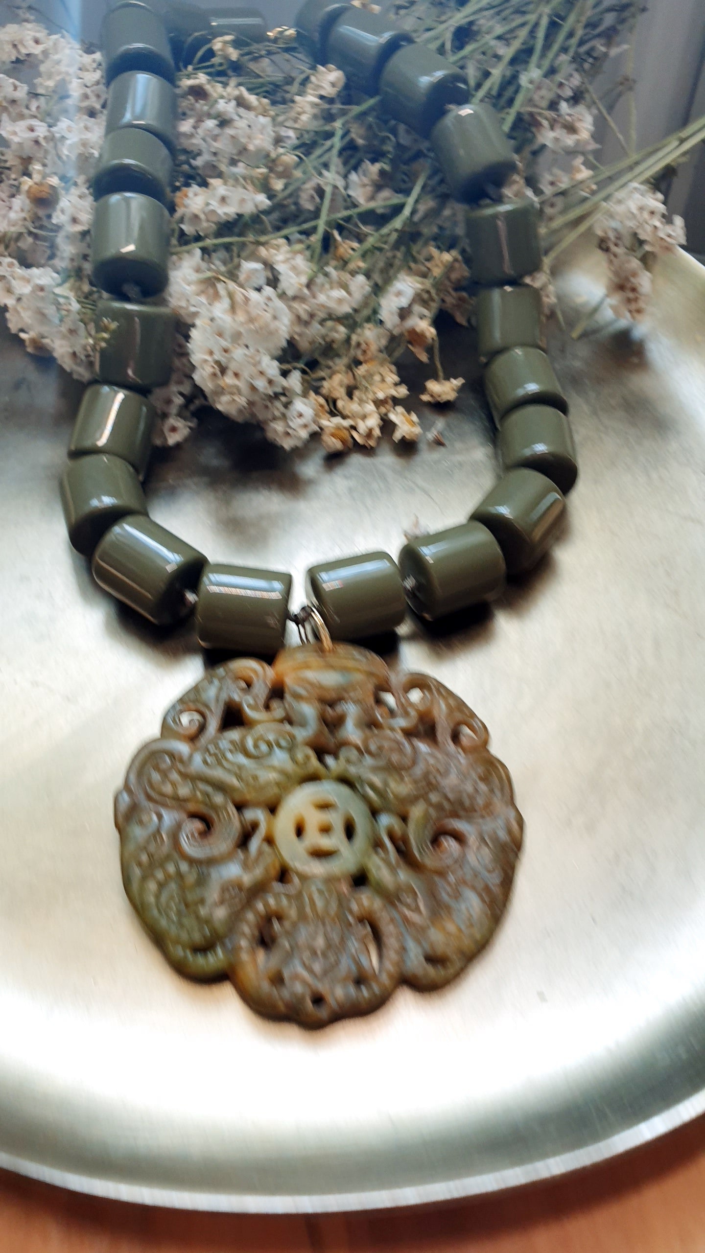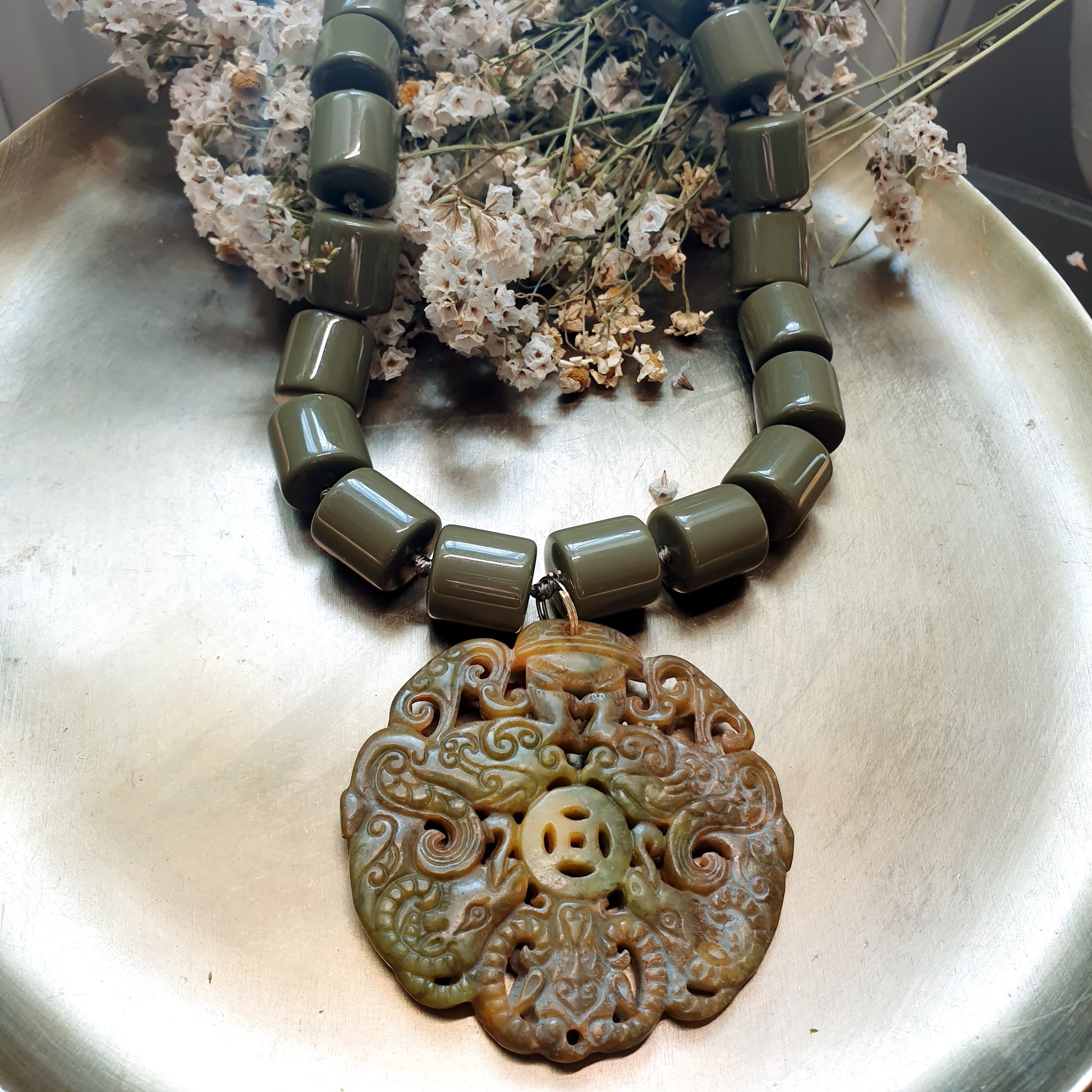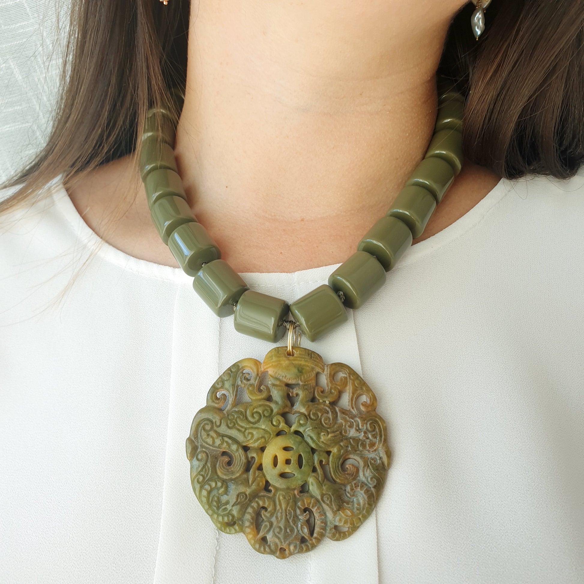 Girocollo in resina coler fango e giada intagliata