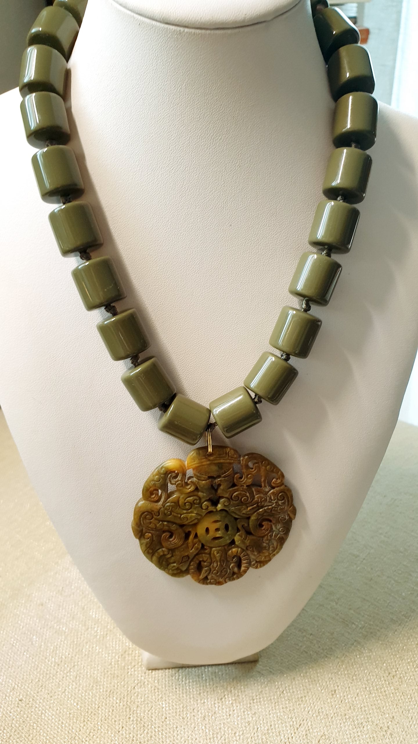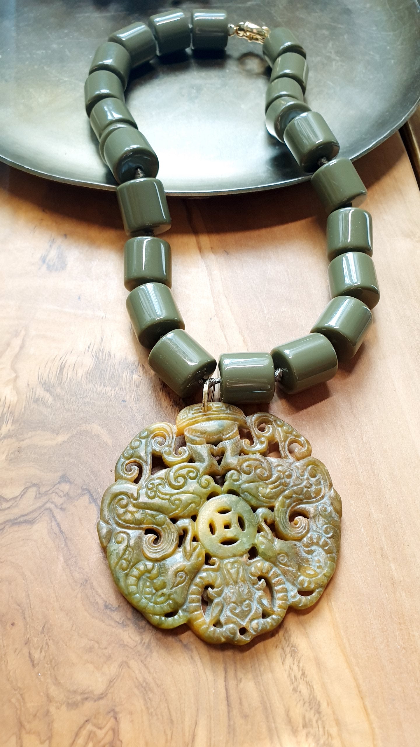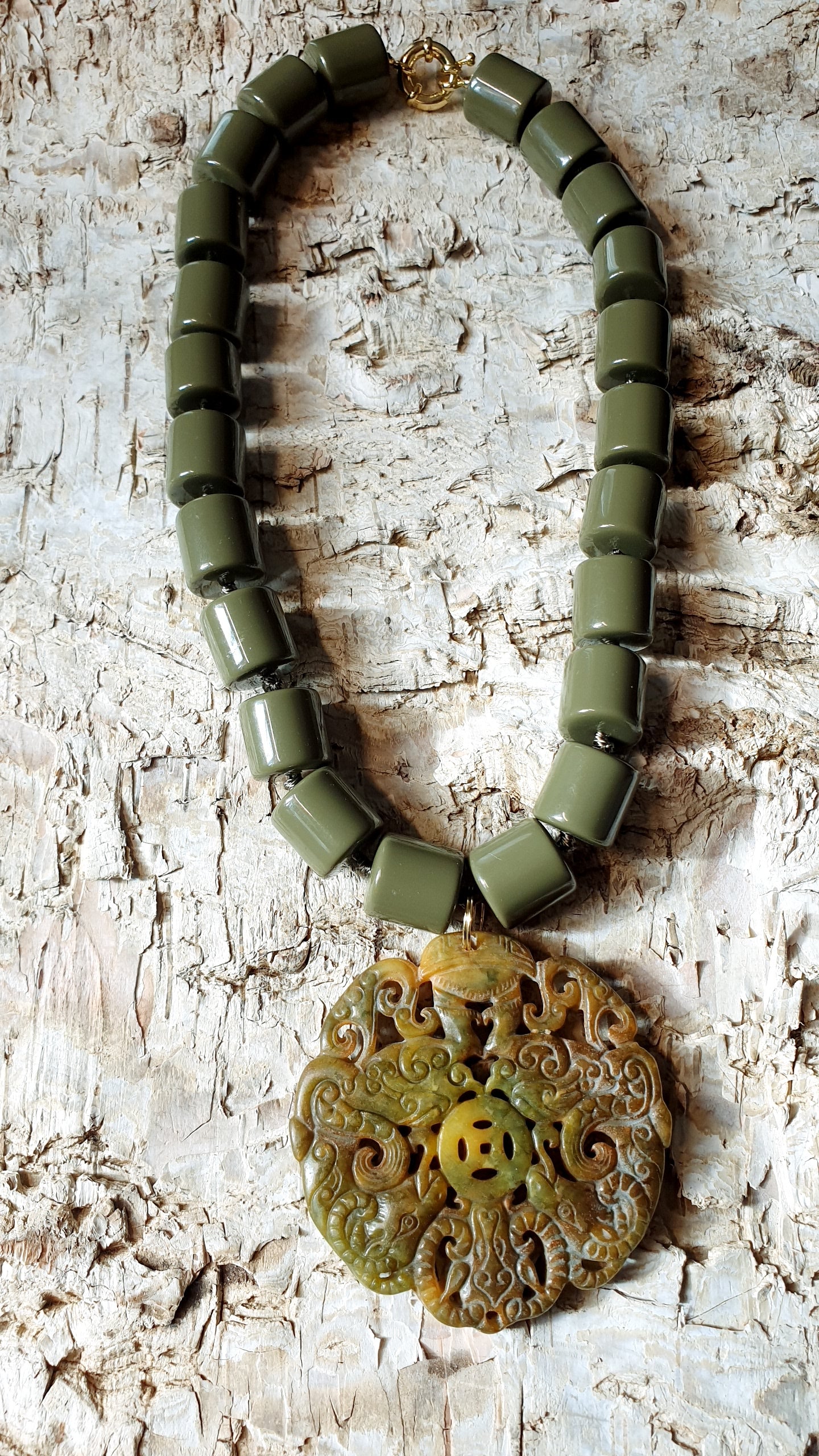 Collana artigianale realizzata con girocollo in resina color fango e chiusura in ottone, grande giada intagliata cm. 6.5.