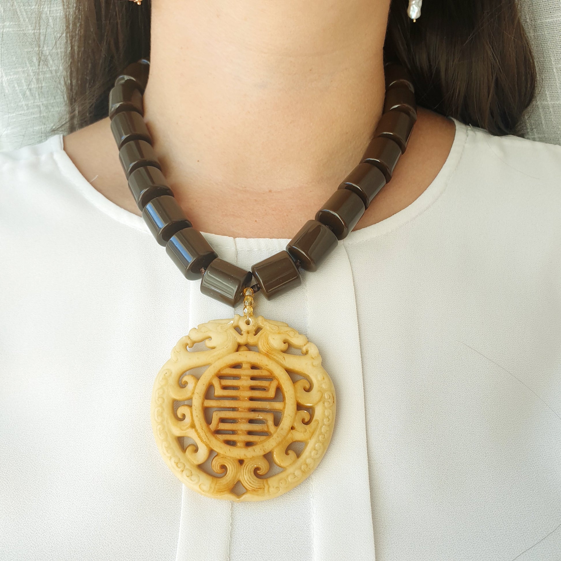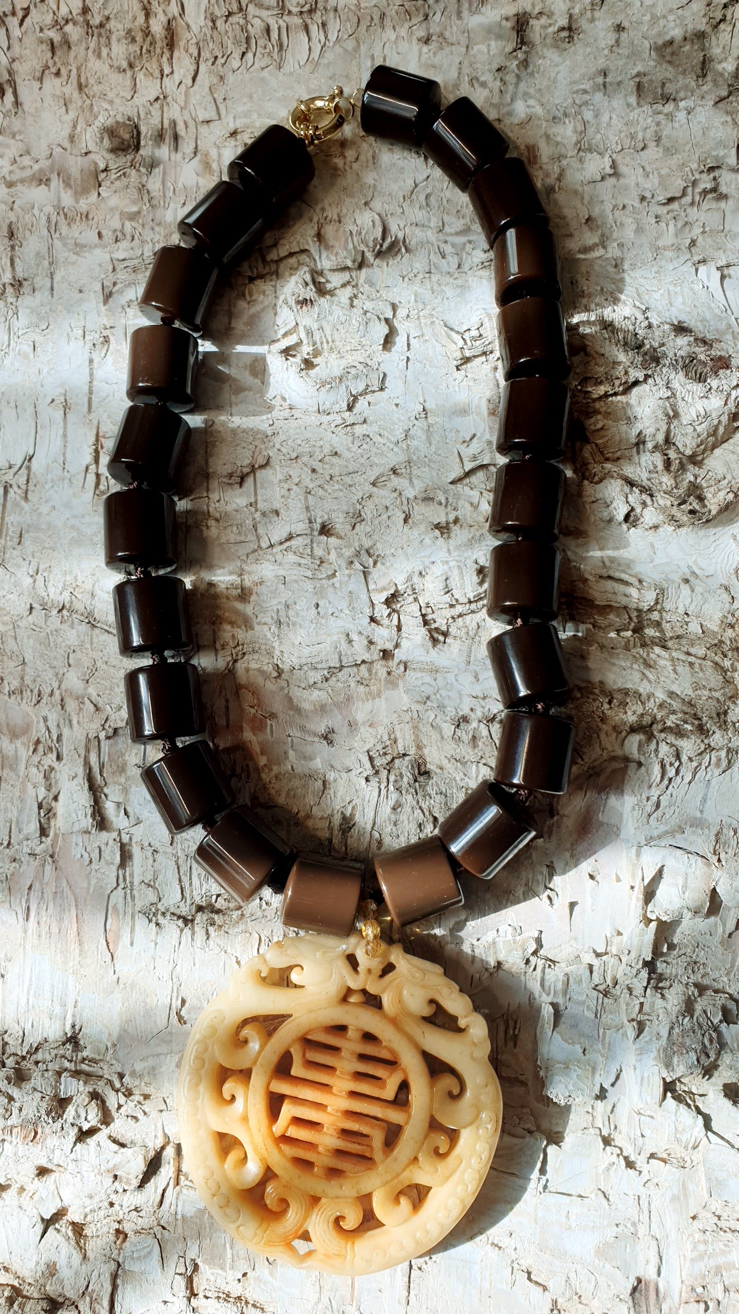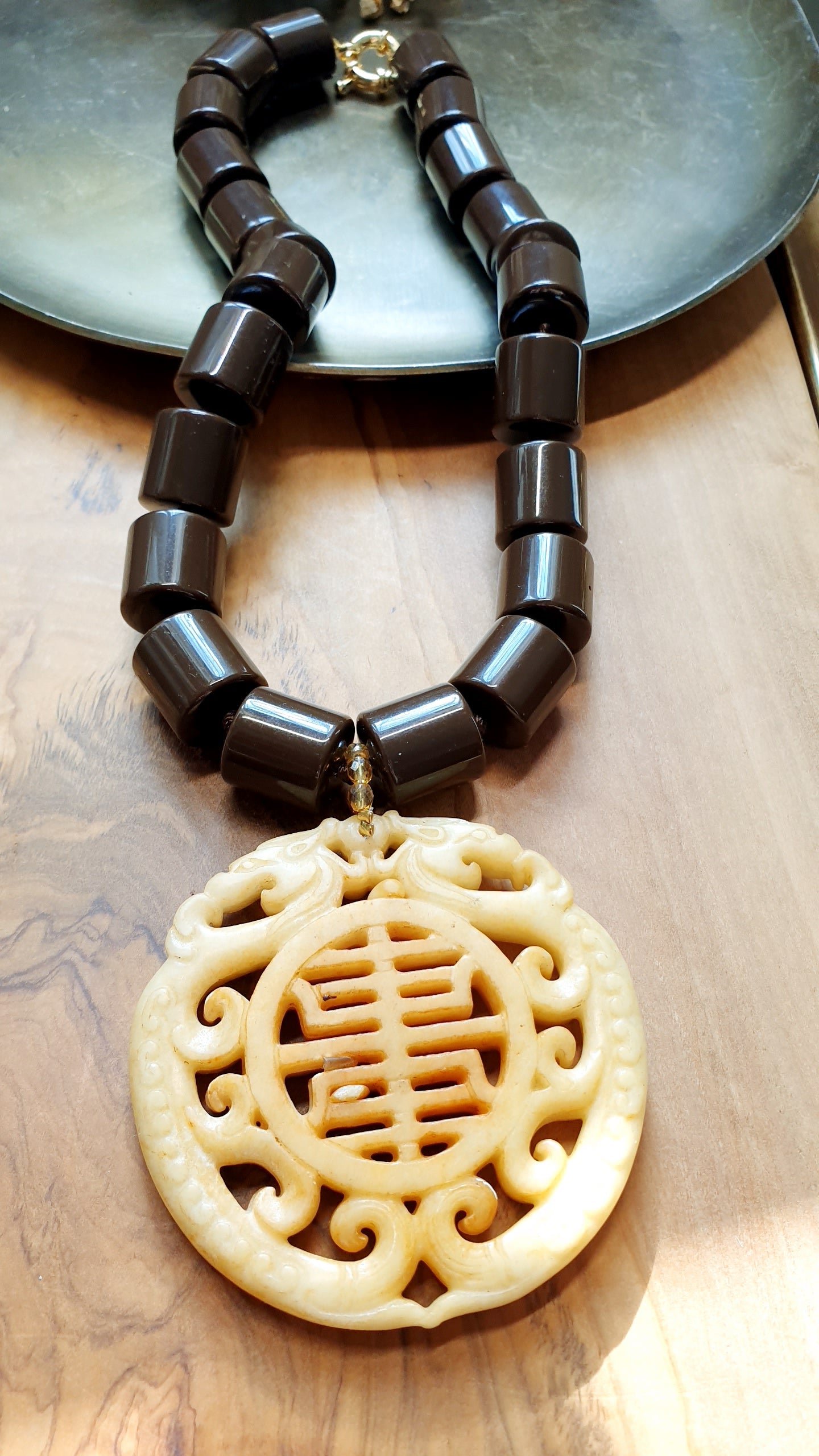 Girocollo in resina marrone con grande giada intagliata