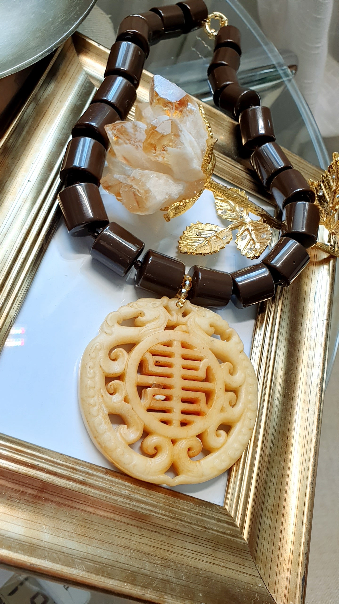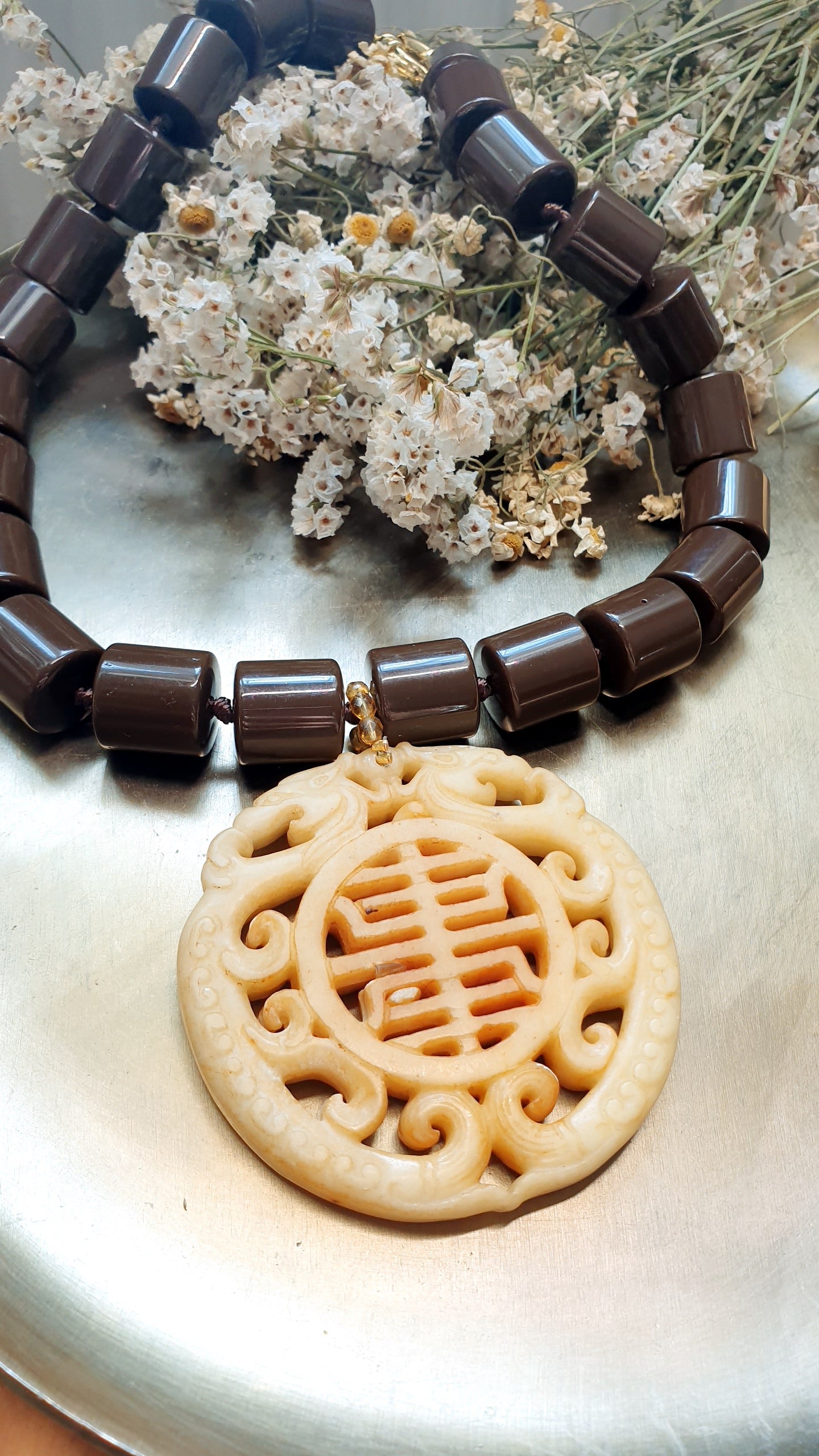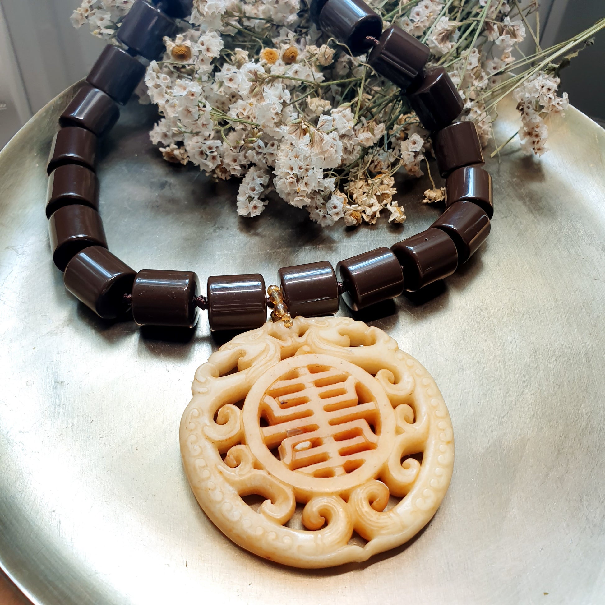 Girocollo in resina marrone con grande giada intagliata